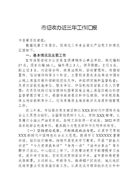 市征收办近三年工作汇报市委第五巡察组:根据巡察工作要求,现将近三年来全面从严治党工作情况汇报如下。一、基本情况及主要工作X市房屋征收办公室是X级建制参公事业单位,核定编制17名,现有在编16人,编外用工3人。领导职数:主任1名、副主任3名。内设综合科、政策法规科、征收管理科、补偿安置科、信访接待科等5个科室。主要职责是负责起草我市国有土地上房屋征收补偿的规范性文件,并组织实施和监督检查;负责对征收实施单位、服务单位、评估机构及征收工作人员管理;负责征收拆迁信访接待处理等国有土地上房屋征收与补偿监督管理日常工作。根据市政府要求和市住建局、市资规局集体土地征收职责分工,还负责集体土地征收涉及房屋补偿管理工作。近三年来,市征收办党支部坚持以XXX新时代中国特色社会主义思想为指引,全面贯彻党的十九大、党的XXX精神,认真履行全面从严治党责任,各项工作取得一定成效。2022年获局系统综合先进单位、最具战斗力党支部和市文明单位称号。(一)坚持理论武装,不断提高政治自觉。认真学习贯彻XXX新时代中国特色社会主义思想,跟进学习XXXXXX重要讲话、指示批示精神,持续开展党史学习教育,开展新春大讲堂今天党课我来讲每月一讲读书分享会等专题学习活动,中心组以上率下,示范带动党员干部增强学习自觉,提升学习实效。坚定坚决贯彻落实中央、省市委和局党委决策部署,主动担当,积极作为,推进棚户区改造、城北地区改造等重点项目房屋征收工作,认真完成市领导批示交办件和局领导安排的各项工作任务。(二)提升党建质量,建强支部战斗堡垒。调整完善党建工作制度,规范开展支部换届、三会一课、民主生活会、组织生活会、民主评议党员等工作。与市征收服务中心党支部开展党建共建共促,常态化联合开展党建活动,举办颂歌献给党文艺汇演、征收行业道德讲堂、爱国主义影片观影、职工趣味运动会等。围绕争做城市建设先行军、争当人民群众贴心人主题,开展两在两同建新功行动和我为群众办实事实践活动,解决群众急难愁盼问题。(三)全面从严治党,打造廉洁征收队伍。强化党风廉政学习教育,坚持每月组织集中学习,春节、中秋等节日前开展廉政集体谈话,干部任用前进行廉政提醒。开展510警示教育活动,组织实境教学、教育读本学习、心得体会交流等,增强教育实效。支部出台《强化运用监督执纪四种形态推进党风廉政建设的通知》,加强干部职工管理。每季度召开廉情分析会,围绕不同主题,开展廉政风险排查,修订完善财务管理制度,建立重点业务工作办理制度。严格执行三重一大决策报告和日常权力运行报告制度,主动接受市纪委监委第九派驻纪检监察组和局机关纪委监督。(四)强化征收管理,推进行业高质量发展。一是坚持党建引领。20XX年成立市房屋征收行业党委。创建党建引领征收惠民党建品牌,推进行业党组织全覆盖和征收项目党支部+指挥部模式,开展红旗项目部五好基层党组织党员示范岗创建活动,发挥示范带动作用,推动房屋征收工作。二是加强法制建设。20XX年出台《关于调整市区房屋征收临时安置补偿费等有关政策的通知》,提高补偿费标准,保障被征收群众的过渡需求。20XX年报市政府出台《关于完善我市国有土地上房屋和集体土地征收与补偿工作的意见》进一步规范征收补偿工作。推行结算凭证安置方式,满足被征收群众多元化安置需求。三是规范行业管理。研究制定征文可居文库——海量学习资料,手机电脑下载www.wenkeju.com收实施单位和服务单位管理暂行办法和征收工作人员管理规定。每年组织开展教育培训,提升队伍素质。与市房屋征收服务中心联合制订《房屋征收工作人员廉洁从业十条禁令》。市住建局、市纪委监委第九派驻纪检监察组联合开展依法征收规范廉洁专项整治行动。在我的XAPP上开设阳光征收功能模块,拓宽社会监督和服务群众的渠道。启动房屋征收管理信息系统建设。四是全力维护稳定。依法做好来信来访办理工作,诉求合理的,督促解决到位;诉求不合理的,做好宣传解释工作。常态化开展信访矛盾排查,督促做好矛盾化解和维稳工作。与市征收服务中心联合化解矛盾,出台《关于进一步做好房屋征迁领域矛盾化解工作的意见》,指导推动全市面上矛盾化解。二、存在的突出问题(一)关于贯彻XXX新时代中国特色社会主义思想和党中央、省市委决策部署方面存在的问题。一是理论武装实效性不强。对XXX新时代中国特色社会主义思想学习不够系统全面,学习形式比较单一,集中学习以读原文为主,学习交流、理论研讨少,理解不深不透。把新思想与房屋征收工作融汇贯通、有机结合、指导工作研究思考不够,运用思想精髓推进征收行业高质量发展的思路还不宽,创新举措少。二是征收管理存在短板弱项。全市一盘棋的意识不强,房屋征收管理主要还是侧重大市区,对县(市)征收工作监管不够。房