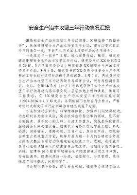 安全生产治本攻坚三年行动情况汇报围绕安全生产治本攻坚三年行动部署,X镇坚持四措并举,纵深推进安全生产治本攻坚三年行动,把行动要求真正传导到基层一线,不折不扣完成治本攻坚行动的各项任务。一是落实一把手工程,精心部署行动。镇委、镇政府高度重视安全生产治本攻坚三年行动。镇党委书记XX分别在2月29日、3月7日党委会议上研究部署XX镇安全生产治本攻坚三年行动。3月4日,镇党委书记XX召开全镇安全生产专项整治工作会议对该项行动做了具体部署。3月7日,再次召开安全生产治本攻坚三年行动再动员再部署会议,进行再强调再落实。会后,全镇18条村(社区)也迅速召开了安全生产治本攻坚三年行动再动员再部署会议,层层传达上级和镇委、镇政府工作要求。在《X镇安全生产治本攻坚三年行动实施方案(2024-2026年)》印发后,各职能部门也结合行业特点,严格对标对表制定了本行业领域治本攻坚实施子方案。二是加强动态研判,科学精准防控。加强部门间协调联动,动态研判各类安全风险,突出抓好最容易出事的领域、最不安全的因素、最不放心的人群,分清工作重点,实现差异化管理。围绕简易升降起重设备、限额以下装修工程及零星工程、高处坠落、消防安全、道路交通、工贸行业、危险化学品、燃气安全等重点领域重点方面,统筹开展为期一个月的全镇安全防范大排查大整治专项行动和用电安全检查工作。近期,也布置开展各行业领域安全生产隐患排查治理工作,共制定了应急管理、消防、住建等10个监管领域安全生产隐患排查治理工作方案,对台账清单、隐患问题逐一分类,层层细化、分级管理,确保隐患闭环整改、问题归零。三是强化督导检查,建立长效机制。镇安委办组建了治本攻坚专班,定期了解推动相关工作开展。组织镇安委会有关成员单位成立6个专项督导组,通过四不两直方式常态化开展安全生产治本攻坚督导检查,建立检查清单和隐患台账。对治本攻坚工作开展不力的村(社区)、部门,将通过约谈、督办、通报等方式,切实加大督促推动力度。继续推进重大事故隐患动态清零,2024年第一季度共排查发现42项重大事故隐患,目前,正督促相关部门跟踪落实整改,确保隐患及时清零。另外,为有效治理各行业领域安全隐患,镇安委办牵头组建安全生产隐患排查治理工作专班,工作专班实行每周例会制度,每月动态管理台账,建立完善综合监管、联动协调、隐患闭环等常态化、长效化工作机制,构建安全监管新格局。四是坚持宣传引导,提升全民素质。深入实施全民安全防范意识和自救互救能力提升工程,3月份以来,积极广泛开展了20多场安全生产宣传五进活动,深入走访企业、社区、家庭,向群众派发各类宣传资料1625份,传达治本攻坚三年行动要求,普及安全生产法律法规和各类安全常识。通过榜样示范、争先创优的方式,组织同类型企业到安全生产工作做的较好的企业或自行组织到其他镇街进行参观学习,确保加强交流、以讲促学、以学促用、达成目标。另外,镇安委办牵头定期汇总典型事故案例,按照不同类别开展集中警示教育活动。紧盯锂离子电池企业、三小场所、出租屋、人员密集场所等重点场所,常态化开展消防逃生演练,行动开展以来,共开展消防逃生演练11场,着力增强全民安全意识和应急避险、自救互救能力。文可居文库——海量学习资料,手机电脑均可下载www.wenkeju.com