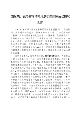国企关于弘扬雷锋精神开展志愿服务活动情况汇报XXXXXX对深入开展学雷锋活动作出重要指示:实践证明,无论时代如何变迁,雷锋精神永不过时。公司团委以雷锋青年志愿者服务队为抓手,广泛开展像雷锋那样主题纪念活动,深刻践行人民电业为人民的企业宗旨,确立8个领域、140个志愿服务项目,注册重组30支雷锋青年志愿者服务队,吸纳青年志愿者3705人,开展青春光明行学雷锋志愿服务活动300余场。打造学雷锋实践教育基地,以雷锋精神引领青年志愿服务队建设,形成具有××特色的志愿服务品牌。扛牢央企责任,攻坚急难险重。XXXXXX强调:党和人民事业发展离不开一代又一代有志青年的拼搏奉献。只有当青春同党和人民事业高度契合时,青春的光谱才会更广阔,青春的能量才能充分迸发。5年来,公司团委始终围绕听从指挥、志愿先行、专业引领、有序参战、引领成长的共青团动员令,组织动员公司各支青年志愿者服务队积极投身抗震救灾、防汛抗旱、疫情防控主战场,建立健全共青团应急响应机制,强化青年志愿者服务队应急响应能力,带领基层团组织、团干部和团员在急难险重第一线挑重担、当先锋、打头阵,以实际行动诠释新时代青春的使命和担当。在河南郑州遭受暴雨洪涝灾害期间,公司12名青年志愿者参与到跨省救援抢险队伍中,第一时间开展抢修工作,累计完成全部6项抢修任务,恢复送电小区12个、居民5751户。在沈阳棋盘山突发山火的第一时间,服务队紧急部署,派出包括服务队员和技术人员在内共计30人,对受损严重线路积极开展抢修工作,连续作业6到7小时,恢复至正常送电。面对6.1龙卷风灾害,公司团委快速响应党委号召,选派青年骨干深入应急抢修、客户服务最前线,逐户上门进行客户安抚并发放照明蜡烛,及时为急需吸氧等有特殊用电需求的客户送去移动应急电源。连夜奋战26.5小时完成全部受损线路抢修送电工作,将灾害造成的影响和损失降到最低,用实际行动赢得了各级地方政府的认可,赢得了老百姓的称赞。传承雷锋精神,践行人民至上。XXXXXX指出:志愿服务是社会文明进步的重要标志,是广大志愿者奉献爱心的重要渠道。要为志愿服务搭建更多平台,更好发挥志愿服务在社会治理中的积极作用。公司团委深入学习贯彻XXXXXX指示批示精神,紧紧围绕《青年志愿者服务社区行动指引(2022版)》,对公司青年志愿者服务社区行动的工作目标、项目、队伍、阵地、机制等方面提出具体要求,着力推动实施社区青春行动,坚持将志愿服务同人民需求紧密结合,将社区、学校作为青年志愿者服务的主场景,广泛动员各支雷锋青年志愿服务队用心做好小而实、小而专、小而美的志愿服务,各级团组织引领广大青年常态化开展社区志愿服务,努力践行为人民服务宗旨。公司团委连续61年为郭家盲人大院提供贴心便民服务,创建365爱心助大院关爱体系,组织开展了建立爱、维护爱、传承爱的三爱系列志愿服务活动,切实践行有事儿只要打招呼一声,保证随叫随到的诺言。连续13年走进山区定点贫困小学,聚焦家庭贫困孩子求学难问题,开展爱心助学活动,捐赠图书、学习用品、服装40余次,共为60余名贫困儿童提供学习教育经费,尽显电力红马甲责任担当,点亮山区贫困学子求学之路。连续13年走进省内特殊教育学校——春英学校,为孩子们援建电亮春英成长馆,全方位助力特殊儿童健康快乐成长。连续5年推行雷锋驿站建设,为城区、乡镇、园区等搭建实体服务驿站79个,设立便民服务热线、发放便民服务卡,开展电力光明行活动140次,解决供电服务急难愁盼问题46个,以实际行动擦亮雷锋青文可居文库——海量学习资料,手机电脑均可下载www.wenkeju.com年志愿者服务队金字招牌。赋能乡村振兴,服务中心大局。XXXXXX强调:共青团要坚持围绕中心、服务大局,主动对接国家重大战略和重大任务,组织动员广大青年立足本职岗位,积极投身中国式现代化建设,在科技创新、乡村振兴、绿色发展、社会服务、卫国戍边等各领域各方面工作中争当排头兵和生力军,展现青春的朝气锐气。5年来,公司团委围绕国家关于打赢脱贫攻坚战和全面实施乡村振兴的战略部署,组织公司各支雷锋青年志愿者服务队伍入村入户,持续完善乡镇电力配套设施建设,不断传递电力的光明与温暖,彰显电力雷锋本色,挺膺担当、勇毅前行,争做乡村振兴路上接续奋斗的生力军,努力为人民美好生活充电,为辽宁振兴发展赋能。公司团委依托现有雷锋志愿服务品牌,定点帮扶山龙村,建设光伏帮扶项目,选派青年骨干担任驻村书记、光伏电客户经理,兴建村集体所有光伏电站,每年为村集体增加收入5万余元,切实提高村民幸福指数。用心用智打造志智双扶乡村振兴新模式,雷锋青年志愿者服务队创新开发点亮幸福乡村路公益助农活动,利用电力爱心超市和网上国网募捐