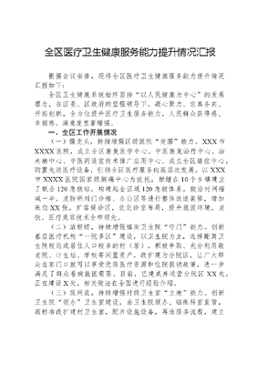 全区医疗卫生健康服务能力提升情况汇报根据会议安排,现将全区医疗卫生健康服务能力提升情况汇报如下:全区卫生健康系统始终坚持以人民健康为中心的发展理念,在区委、区政府的坚强领导下,凝心聚力、求真务实、开拓创新,全方位提升医疗卫生服务能力,人民群众获得感、幸福感、满意度显著增强。一、全区工作开展情况(一)强龙头,持续增强区级医院突围能力。XXX市XXXX医院,成立全区康复医学中心、中医康复治疗中心、治未病中心、中医药适宜技术推广应用中心、成立全区癌症中心,购置先进医疗设备,引领全区医疗服务向高层次发展。以XXX市XXXX医院国家级胸痛中心为依托,相继在10个乡镇建立了联合120急救站,构建起全区域120急救体系,救治时间缩减一半。皮防所对门诊楼、办公区等进行整体改造装修,增加床位XX张,扩容候诊区,优化诊室布局,提升就医环境,皮肤、医疗美容技术全市领先。(二)活枢纽,持续增强镇街卫生院守门能力。创新基层医疗机构一院多区建设,以卫生院为主,选择距离卫生院较远或居住人口较多的村(居),积极争取、充分利用敬老院、计生站、学校等闲置资产,改扩建为分院区,让广大群众在家门口就可以享受优质医疗资源和住院报销政策,进一步满足了群众看病就医需要。目前,已建成并运营分院区XX处,正在建设X处,相关做法在全国进行经验介绍。(三)筑网底,持续增强村级卫生室立地能力。创新卫生院领办卫生室建设,由卫生院领办、临床科室直管,高标准改扩建村卫生室,配齐设施设备,再造服务流程,建立起了人员、财务、药械、物品、业务、信息系统、工资待遇七统一的管理机制,改变了以往村卫生室陈旧形象,增强了农村医疗卫生综合服务能力。年底前完成领办并投入使用XX处,相关做法在全国、全省进行典型发言。二、房村镇卫生院能力提升情况(一)工作现状。区卫生健康局深入贯彻落实XX、XX、XX、XX四镇重点工作安排部署会议精神,强化系统观念和有解思维,经深入摸底调研,4家镇卫生院中XXX镇卫生院发展最差、最为困难,存在硬件设施较差、业务开展滞后、人员配置不合理、医疗收入与服务人口不成正比、工资发放不及时等问题,医疗卫生服务水平明显不足。(二)采取措施。经分析,XXX镇卫生院很难实现自身管理、服务水平提升。结合实际,采取了以下两项工作措施:一是构建紧密型医共体。XXX市XXXX医院与XX镇卫生院构建紧密型医共体,建立XX市XXXX医院XX院区,实行人事、财务、资产、业务、药品耗材目录、药品耗材企业配送等六统一。选派管理团队、医疗团队,帮助XXX镇卫生院完善医院管理体系和提升诊疗水平;建立人才柔性流动机制,推行人员区管镇用,不断优化人员配置;打通信息系统壁垒,实现信息共建共享、互联互通;对XXX镇卫生院综合楼进行改造提升,添置部分急需医疗设备,改善群众就医环境和就医条件;实施分级诊疗制度,减轻就医负担。二是优化卫生院组织架构。实行医共体内行政、业务、后勤服务等统一管理。对XXX镇卫生院院长和班子成员进行调整,配齐配强了管理层,理顺了领导体制,明确了职责任务,确保各项工作有序高效开展。(三)目标效果。一是服务能力持续增强。XXX镇卫生院实现医疗卫生服务能力明显提升,诊疗行为明显规范,医保基金使用效益明显发挥,医防融合实施效果明显显现,区域居民健康水平明显提高;一增加即有能力开展的技术和项目不断增加;一控制即区域外住院人次占比逐步下降。争取文可居文库——海量学习资料,手机电脑均可下载www.wenkeju.com2026年基层诊疗量占比达到XX%以上,区域内就诊率达到XX%以上,满足群众看病就医需求。二是发挥辐射带动作用。XX市XXXX医院通过XXX镇卫生院向周围乡镇辐射,尤其是吸引接纳附近镇村以及XX县临近乡镇病源,持续增强我区医疗机构影响力。三、下一步工作打算牢固树立全区卫健系统一盘棋思想,进一步采取有力有效措施,持续提升全区医疗卫生健康服务能力。一是区级层面。持续推进XXX市XXXX医院六大中心建设,全面启用全区癌症中心,填补我区放射治疗技术空白,加快全区域120急救体系建设,全面提升全区急诊急救能力。继续巩固母婴友好医院、XXX区校外未成年人心理健康辅导站创建成果,开展妇幼保健机构标准化建设,保障全区妇女儿童健康。持续优化区皮防所院区布局,充分发挥好全市领先的皮肤、医疗美容技术,全力构建全区中医皮肤专科联盟,积极创树中医外治品牌。二是镇街层面。继续开展基层医疗机构一院多区建设持续提升分院区人才队伍建设、新项目新技术水平。深入开展基层国医堂能力提升工程,积极推广中医适宜技术、中医康复服务。开展优质服务基层行推荐标准创建工作,深入推进慢性病规范管理,持续提升基本公共卫生服务质量。三是村级层面。深入推进村卫生室标准化建设和卫生院领办村卫