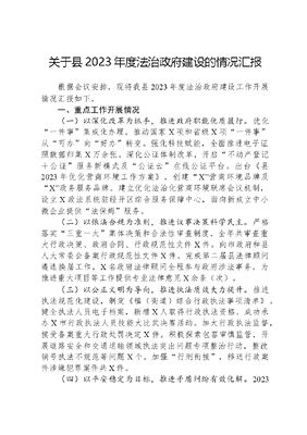 关于县2023年度法治政府建设的情况汇报根据会议安排,现将我县2023年度法治政府建设工作开展情况汇报如下。一、重点工作开展情况(一)以深化改革为抓手,推进政府职能优质履行。优化一件事集成化办理,推动国家X项和省级X项一件事从可办向好办转变。强化科技赋能,全面推进电子证照数据归集X万余张。深化公证体制改革,开启不动产登记+公证服务新模式及公证云在线公证平台。出台《县2023年优化营商环境工作方案》,创建X营商环境品牌及X政务服务品牌。建立优化法治化营商环境联席会议机制,设立X政法系统驻经开区综合服务保障中心,面向新成立中小微企业提供法保姆服务。(二)以依法合规为准则,推进议事决策科学民主。严格落实三重一大集体决策和合法性审查制度,全年共审查重大行政决策、政府合同、行政规范性文件X件。向市政府和县人大常委会备案行政规范性文件X件。完成第二届县法律顾问遴选换届工作,X名政府法律顾问全程参与政府涉法事务,为推进重大项目等工作提供专业法律意见X余条(次)。(三)以公正文明为导向,推进执法质效大力提升。推进执法规范化建设,制定《镇(街道)综合行政执法事项清单》。健全执法人员电子档案,新增X人取得行政执法资格。成功承办X市行政执法人员技能大比武决赛活动。加大行政执法监督,接受备案重大行政处罚决定X件。积极探索包容审慎监管,开展道路安全和交通运输领域执法突出问题专项整治行动,整改销号执法不规范等问题X个。加强行刑衔接,移送行政案件涉嫌犯罪案件共X件。(四)以平安稳定为目标,推进矛盾纠纷有效化解。2023年,新成立X个行(专)业人民调解组织,夯实调解队伍力量。全年排查矛盾纠纷X余人次,人民调解案件调解成功X件。发挥行政复议化解行政争议主渠道作用,全年办案X件,纠错率X%。行政机关负责人出庭应诉率100%。加大法律援助力度,受理讨薪维权案件X件,挽回经济损失X万元,依法援助代理刑事诉讼X件。(五)以监督制约为要义,推进行政权力规范运行。主动接受人大依法监督和政协民主监督,县政府及有关部门全年办理人大代表建议X件、重点建议X件,政协委员提案X件、重点提案X件,办结率、函复率、满意率均达100%。提升政务公开质效,全年通过政府门户网站公开政府信息X条。切实开展审计监督,全年开展X个单位预算执行审计、X名领导干部经济责任审计、X个计划项目审计,查出问题X个,提出审计建议X条。(六)以普法宣教为重点,推进基层治理提质增效。持续推进八五普法,顺利通过市人大和县人大八五普法中期工作视察。在全县X个镇(街道)开展民法典进乡村巡展。新建X等校园法治文化阵地X个。实施公民法治素养提升行动省级试点工作,建立健全县民尊法学法守法用法长效机制。培育乡村法律明白人X名、农村学法用法示范户X名。县禁毒教育基地被命名为X教育基地,X村被命名为省级民主法治示范村。二、2024年工作重点(一)全面推进法治政府建设。坚持落实法治政府建设报告、会前学法、行政机关负责人出庭应诉等制度,不断巩固提升法治政府建设成果。自觉接受人大、政协监督,高质量办好人大代表建议、政协委员提案。开展全省公民法治素养提升行动试点,用好法治宣传教育基地,发挥法律明白人赋能乡村振兴作用,推动八五普法工作走深走实。(二)严格规范公正文明执法。开展执法队伍技能比拼和文可居文库——海量学习资料,手机电脑均可下载www.wenkeju.com素质提升行动,抓好人民群众最不满意行政执法突出问题承诺整改。严格落实行政执法三项制度,持续推行包容审慎监管,推动镇综合行政执法改革走深走实。(三)着力提升依法行政水平。深化府院府检联动,发挥政府法律顾问团作用,提高决策科学化法治化水平。加强各级党政机关、基层单位(国有企业、事业单位)法律顾问和法制审查队伍配备,完善激励保障相关制度,进一步提升政府合同管理、政务信息公开等工作水平。全面深化政务公开,提高政府透明度和公信力。持续推进行政复议质量提升专项行动,解决案多人少突出矛盾。(四)持续优化法治化营商环境。做实行政许可事项下沉全覆盖,做好事项动态调整和流程再优化。加快建设X微信小程序,优化升级X移动端,助力更多政务服务掌上办,进一步发挥好X等政府服务企业职能,形成品牌效应。文可居文库——海量学习资料,手机电脑均可下载www.wenkeju.com