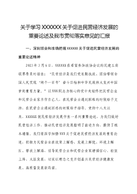 关于学习XXXXXX关于促进民营经济发展的重要论述及我市贯彻落实意见的汇报一、深刻领会和准确把握XXXXXX关于促进民营经济发展的重要论述精神2023年3月6日,XXXXXX在看望参加政协会议的民建工商联界委员时指出:民营经济是我们党长期执政、团结带领全国人民实现两个一百年奋斗目标和中华民族伟大复兴中国梦的重要力量。以XXX同志为核心的党中央始终把民营企业和民营企业家当作自己人,在民营企业遇到困难的时候给予支持,在民营企业遇到困惑的时候给予指导。党的十八大以来,XXXXXX就民营经济发展作出一系列重要论述,为我们做好民营经济工作、推动民营经济发展指明了前进方向、提供了根本遵循。我们要深学细悟XXX关于促进民营经济发展的重要论述,积极为民营企业在政策上解惑、发展上解忧、环境上解压、帮扶上解渴,引导民营企业和民营企业家增强信心、轻装上阵、大胆发展,切实以理念之变开创嘉兴民营经济健康发展、高质量发展新局面。(一)正确认识民营经济的地位和重要性。民营经济在推动经济社会发展的过程中发挥了重要作用,XXXXXX以五六七八九(即民营经济贡献了50%以上的税收,60%以上的国内生产总值,70%以上的技术创新成果,80%以上的城镇劳动就业,90%以上的企业数量)高度概括和充分肯定了民营经济的重大贡献;用四个重要(即民营经济是社会主义市场经济发展的重要成果,是推动社会主义市场经济发展的重要力量,是推进供给侧结构性改革、推动高质量发展、建设现代化经济体系的重要主体,也是我们党长期执政、团结带领全国人民实现两个一百年奋斗目标和中华民族伟大复兴中国梦的重要力量)强调了民营经济的重要地位和作用,指出我国民营经济只能壮大、不能弱化,不仅不能离场,而且要走向更加广阔的舞台;XXXXXX强调,要引导民营企业和民营企业家正确理解党中央关于两个毫不动摇(即毫不动摇巩固和发展公有制经济,毫不动摇鼓励、支持、引导非公有制经济发展)、三个没有变(即非公有制经济在我国经济社会发展中的地位和作用没有变,我们毫不动摇鼓励、支持、引导非公文可居文库——海量学习资料,手机电脑均可下载www.wenkeju.com有制经济发展的方针政策没有变,我们致力于为非公有制经济发展营造良好环境和提供更多机会的方针政策没有变)、两个健康(即非公有制经济健康发展和非公有制经济人士健康成长)的方针政策,消除顾虑,放下包袱,大胆发展。这些重要论述充分体现了XXXXXX对民营企业的重视、关心和厚爱,是重大理论和实践创新,是XXX新时代中国特色社会主义经济思想的丰富发展。(二)正确认识民营经济发展面临的困难及其本质。XXXXXX坚持问题导向,由表及里,辩证分析,为民营企业家经营和发展问诊把脉,针对民营企业在经营发展中遇到的市场的冰山、融资的高山、转型的火山,指出这些困难和问题的成因是外部因素和内部因素、客观原因和主观原因等多重矛盾问题碰头的结果,是发展中的困难、前进中的问题、成长中的烦恼,一定能在发展中得到解决。XXXXXX把民营经济发展中遇到的困难摸透了、症结说清了、药方开准了,并在多种场合为民营企业发展加油鼓劲,极大坚定了民营企业家迎难而上、攻坚克难的信心和决心。文可居文库——海量学习资料,手机电脑均可下载www.wenkeju.com(三)正确认识民营经济面临的新机遇和新要求。XXXXXX从发展韧性、发展条件等6个方面深刻分析了民营经济发展面临的有利条件,强调只要我们保持战略定力,坚持稳中求进工作总基调,以供给侧结构性改革为主线,全面深化改革开放,我国经济就一定能够加快转入高质量发展轨道,迎来更加光明的发展前景。近期,中共中央、国务院专门出台政策,从6方面、31条全面部署促进民营经济健康发展、高质量发展的路径和举措。随后,又作出在国家发展改革委设立民营经济发展局的重大决策部署,这些密集的动作都在释放国家层面支持民营经济、大力发展民营经济的强烈信号。只要我们沿着XXX指引的方向奋力前行,善于把握住时与势,因时而变,就一定能危中寻机、化危为机,催生发展新动能,开辟发展新境界。二、我市促进民营经济发展工作推进情况和存在问题民营经济是x高质量发展的重要基础,在稳定增长、促进创新、增加就业、改善民生等方面发挥了积极的作用。近年来,我市认真贯彻落实XXXXXX关于民营经济发展的重要论述精神,一以贯之为民营企业发展创造条件、优化服务、厚植沃文可居文库——海量学习资料,手机电脑均可下载www.wenkeju.com土,促进民营经济做大做优做强,民营经济综合实力稳步提升,高质量发展特征不断呈现。(一)经济总量持续增长。20x年,全市民营经济占GDP比重达到68%,对经济增长的贡献率达到76%,有6家企业上榜中国民营企业500强榜单,13