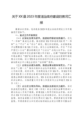 关于XX县2023年度法治政府建设的情况汇报根据会议安排,现将我县2023年度法治政府建设工作开展情况汇报如下。一、重点工作开展情况(一)以深化改革为抓手,推进政府职能优质履行。优化一件事集成化办理,推动国家XX项和省级XX项一件事从可办向好办转变。强化科技赋能,全面推进电子证照数据归集XX万余张。深化公证体制改革,开启不动产登记+公证服务新模式及公证云在线公证平台。出台《XX县2023年优化营商环境工作方案》,创建XXXX营商环境品牌及XX政务服务品牌。建立优化法治化营商环境联席会议机制,设立XX政法系统驻经开区综合服务保障中心,面向新成立中小微企业提供法保姆服务。(二)以依法合规为准则,推进议事决策科学民主。严格落实三重一大集体决策和合法性审查制度,全年共审查重大行政决策、政府合同、行政规范性文件XX件。向XX市政府和XX县人大常委会备案行政规范性文件XX件。完成第二届县法律顾问遴选换届工作,XX名政府法律顾问全程参与政府涉法事务,为推进重大项目等工作提供专业法律意见XX余条(次)。(三)以公正文明为导向,推进执法质效大力提升。推进执法规范化建设,制定《镇(街道)综合行政执法事项清单》。健全执法人员电子档案,新增XX人取得行政执法资格。成功承办XX市行政执法人员技能大比武决赛活动。加大行政执法监督,接受备案重大行政处罚决定XX件。积极探索包容审慎监管,开展道路安全和交通运输领域执法突出问题专项整治行动,整改销号执法不规范等问题XX个。加强行刑衔接,移送行政案件涉嫌犯罪案件共XX件。(四)以平安稳定为目标,推进矛盾纠纷有效化解。2023年,新成立XX个行(专)业人民调解组织,夯实调解队伍力量。全年排查矛盾纠纷XX余人次,人民调解案件调解成功XX件。发挥行政复议化解行政争议主渠道作用,全年办案XX件,纠错率XX%。行政机关负责人出庭应诉率100%。加大法律援助力度,受理讨薪维权案件XX件,挽回经济损失XX万元,依法援助代理刑事诉讼XX件。(五)以监督制约为要义,推进行政权力规范运行。主动接受人大依法监督和政协民主监督,县政府及有关部门全年办理人大代表建议XX件、重点建议XX件,政协委员提案XX件、重点提案XX件,办结率、函复率、满意率均达100%。提升政务公开质效,全年通过政府门户网站公开政府信息XX条。切实开展审计监督,全年开展XX个单位预算执行审计、XX名领导干部经济责任审计、XX个计划项目审计,查出问题XX个,提出审计建议XX条。(六)以普法宣教为重点,推进基层治理提质增效。持续推进八五普法,顺利通过XX市人大和XX县人大八五普法中期工作视察。在全县XX个镇(街道)开展民法典进乡村巡展。新建XXXX等校园法治文化阵地XX个。实施公民法治素养提升行动省级试点工作,建立健全县民尊法学法守法用法长效机制。培育乡村法律明白人XX名、农村学法用法示范户XX名。县禁毒教育基地被命名为XXXX教育基地,XX村被命名为省级民主法治示范村。二、2024年工作重点(一)全面推进法治政府建设。坚持落实法治政府建设报告、会前学法、行政机关负责人出庭应诉等制度,不断巩固提升法治政府建设成果。自觉接受人大、政协监督,高质量办好人大代表建议、政协委员提案。开展全省公民法治素养提升行文可居文库——海量学习资料,手机电脑均可下载www.wenkeju.com动试点,用好法治宣传教育基地,发挥法律明白人赋能乡村振兴作用,推动八五普法工作走深走实。(二)严格规范公正文明执法。开展执法队伍技能比拼和素质提升行动,抓好人民群众最不满意行政执法突出问题承诺整改。严格落实行政执法三项制度,持续推行包容审慎监管,推动镇综合行政执法改革走深走实。(三)着力提升依法行政水平。深化府院府检联动,发挥政府法律顾问团作用,提高决策科学化法治化水平。加强各级党政机关、基层单位(国有企业、事业单位)法律顾问和法制审查队伍配备,完善激励保障相关制度,进一步提升政府合同管理、政务信息公开等工作水平。全面深化政务公开,提高政府透明度和公信力。持续推进行政复议质量提升专项行动,解决案多人少突出矛盾。(四)持续优化法治化营商环境。做实行政许可事项下沉全覆盖,做好事项动态调整和流程再优化。加快建设XXXX微信小程序,优化升级XXXX移动端,助力更多政务服务掌上办,进一步发挥好XXXX等政府服务企业职能,形成品牌效应。文可居文库——海量学习资料,手机电脑均可下载www.wenkeju.com