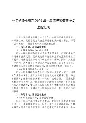 公司纪检小组在2024年一季度经济运营会议上的汇报为深入贯彻落实集团一六六战略路径部署各项要求,一季度以来,纪检小组立足企业高质量发展的根本需求,巧用三个聚焦,致力资本资产运营落地见效。一、核心发力,聚焦政治责任(一)提高政治站位,迅速部署纪检小组组织领导班子成员学习集团党组、公司党委关于防范化解重大风险、低效无效资产清理等方面的重要部署及工作要求,发挥领导班子带头啃硬骨头精神。同时,对集团一六六战略路径落实情况及时监督推进,引导各项目部、关键岗位人员切实提高政治站位,增强履职责任感、紧迫感。(二)做实两张清单,压实责任纪检小组督促领导班子签订2024年全面从严治党一岗双责责任书5份,党总支与项目签订党支部责任书5份,细化责任清单;纪检小组将集团一六六战略路径、现金流管理提升专项行动及低效无效资产清理专项行动等内容列入政治监督清单,重点关注低效无效资产清理完成情况及X公司整体运营水平,定期召开专项督导推进会,助力专项行动有序推进。二、分层发力,聚焦监督重点(一)明确责任目标,盘活监管资金纪检小组以年度清理目标为重点,督促财务部签订专项责任书,进一步明确清理目标、时限、责任人及奖罚措施;开展关键节点达成情况专项监督,在月度季度节点开展考核,全力保障各项措施落细落实。(二)实施统筹联动,做实专项监督纪检小组实施1+N联动,由纪检小组协调总抓、财务部及商务部等部门联动配合,对应收未收工程款等关键问题开展监督,通过开展周小结、月通报、季督查,确保专项行动走深走实,全年累计开展监督推进会及成本分析会3次。截至目前,专项资产清理工作100%完成。三、中枢发力,聚焦作风建设(一)精心施策,严肃作风纪检小组持续开展廉洁警示教育,为低效无效资产清理专项行动及现金流管理提升专项行动注入源头活水,组织各项目观看警示教育视频,签订廉洁承诺书,征集廉洁文化作品,推进廉洁文化建设,营造全员廉动氛围。(二)精准把脉,严肃执纪针对低效无效资产清理专项行动及现金流管理提升专项行动中发现的思想认识不深刻、措施落实不到位、推进进度缓慢、部门联动力度不足等问题,精准把脉问诊,约谈相关责任人,深刻剖析问题根源,找准问题对策,再次细化责任人、责任措施、具体时间节点。下一步,纪检小组将不断总结监督经验,找准切入点和发力点,压实监督责任,拓展监督路径和方式,全力推动资本资产平稳运营,为企业高质量发展保驾护航。文可居文库——海量学习资料,手机电脑均可下载www.wenkeju.com