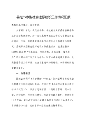 县域节水型社会达标建设工作情况汇报尊敬的各位领导,各位专家:大家好!首先,我代表县委、县政府对大家莅临验收指导工作表示热烈欢迎,对一直以来给予我县工作关心支持表示衷心感谢!下面,我简要汇报我县节水型社会达标建设工作情况:县域节水型社会达标建设工作开展以来,我县坚持以XXXXXX提出的节水优先、空间均衡、系统治理、两手发力新时期水利工作方针为指导,以节水载体建设为抓手,扎实推进各项工作开展,社会节水意识持续增强,水资源利用效益稳步提升。一、自评情况按照省水利厅《关于做好十四五期间县域节水型社会达标建设工作的通知》要求,我县对照《县域节水型社会评价标准(试行)》,从用水定额管理、计划用水管理、用水计量、水价机制、节水载体建设、生活节水器具推广、加分项等11个方面,对全县节水型社会建设各项工作进行了认真自评,自评得分101分,达到了节水型社会建设标准要求。二、主要举措为全面贯彻落实中央、省市水资源管理制度和相关部署要求,我县坚持高位推进、统筹安排,确保节水型社会建设工作各项目标任务高限完成。一是强化领导,高规格组织推进。县委、县政府坚持将节水型社会建设作为水利发展改革考核重要内容,成立了以县政府主要领导为组长,县人大副主任、县政府副县长、县政协副主席为副组长,28个相关单位为成员的节水型社会达标建设工作领导小组,完善了节约用水工作协调机制,形成了党委领导、政府主导、部门履职、市场调节、公众参与工作格局,为节水型社会建设工作高效开展提供了坚强保障。二是健全体系,全方位安排部署。提前编制完成了《县域节水型社会达标建设工作实施方案》,明确了工作思路、目标任务、进度安排、实效评价、保障措施等内容,为工作有序推进奠定了基础、提供了遵循。同时,对标省市推进全社会节水工作要求,研究制定了《关于贯彻落实《节水条例》的实施方案》《节水三同时管理程序文件》《节水技术、节水项目文可居文库——海量学习资料,手机电脑均可下载www.wenkeju.com奖励机制》等13个文件,实现了各项工作部署得力,构建了1+13落实体系。三是严格控制,双聚焦严守红线。坚持将用水总量和用水效率双控制考核目标贯穿工作全过程,严格按照《实行最严格水资源管理制度用水总量红线控制目标》和《十四五期间用水效率控制指标》文件要求,积极谋划推进,持续跟踪要账。三、工作成效通过开展节水型社会建设工作,年新增水用量减少98.69万立方米,有效缓解了水资源供需矛盾,提高了水资源利用率。一是大力实施节水载体建设,增强示范带动效应。根据相关政策文件和申报标准,积极开展节水型企业、单位、学校、社区等载体建设,以节水标杆引领全社会节水,营造了全社会节水护水工作氛围,共建成重点行业节水型企业36家、公共机构节水型单位49个、节水型居民小区3个。文可居文库——海量学习资料,手机电脑均可下载www.wenkeju.com二是大力开展节水宣传活动,打造节水教育基地。广泛开展节水进机关节水进园区等节水主题宣传活动,发放宣传资料2万余份、悬挂张贴条幅500余条、设置城区固定节水宣传设施100余个,持续增强群众节水意识。同时,结合现有工作基础,打造了城市节水教育基地,让广大人民群众直观感受节水工作政策和意义,自觉养成珍惜水、节约水、保护水的良好习惯。三是大力推进地下水压采行动,地下水水位持续回升。推进地下水压采行动,制定了《地下水超采综合治理实施方案》,先后实施高标准农田建设、农村集中供水水源置换、滏阳河及崔青东分干渠综合治理等项目,关停工业和生活取水井139眼、季节性关停农业灌溉井1304眼,完成压采任务2979万立方米,地下水浅层水位、深层水位均有所上升。四是大力筹措各类资金,加快建设节水型城市。在县财政极为紧张的情况下,先后投入各类资金X万元用于节水型社会达标建设工作,为污水处理厂再生水池及配套设施、供水管网改造等各项工程建设提供了有力保障。同时,结合生活节水器文可居文库——海量学习资料,手机电脑均可下载www.wenkeju.com具和计量器具推广普及、供水管网漏损控制等工作开展,有效提高了全县各行业节约用水水平。各位领导,各位专家,通过本次县域节水型社会达标建设工作,我县在水资源集约节约利用上取得了一些进步,但对标上级要求和群众期盼,仍有许多方面需要提高和完善。我们将以此次验收指导为契机,进一步加大工作力度,定期组织开展回头看,不断推进各领域工作完善提升,全力确保节水型社会建设工作取得新的更大成效。汇报完毕,不妥之处敬请大家批评指正。文可居文库——海量学习资料,手机电脑均可下载www.wenkeju.com