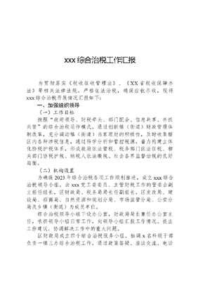 xxx综合治税工作汇报为贯彻落实《税收征收管理法》、《XX省税收保障办法》等相关法律法规,严格依法治税,确保应收尽收,现将xxx综合治税开展情况汇报如下:一、加强组织领导(一)工作目标按照政府领导、财税牵头、部门配合、信息共享、齐抓共管的综合治税运作模式,通过创新镇(街道)财政管理体制改革,充分调动镇(街道)当家理财的积极性,及时收集辖区内各种涉税信息,通过科学分析和管控税源,着力构建立体化协税护税体系,形成政府依法管税、税务部门依法征税、相关部门协税护税、纳税人依法缴税、社会各界监督治税的良好局面。(二)机构设置为确保2023年综合治税各项工作顺利推进,成立xxx综合治税领导小组,由xxx党工委委员、主管财税工作的管委会副主任任组长,区财政局、税务局局长任副组长,区发改局、建设局、招商局、自然资源和规划分局、市场监管分局、公安分局及乡镇(街道)为成员单位。综合治税领导小组下设办公室,财政局局长兼任办公室主任,承担领导小组日常工作,向领导小组汇报工作情况、提出工作建议,协调解决工作中的重大问题。区财政局成立四个综合治税服务小组,抽调x名科级干部负责一镇三办综合治税工作,通过政策答疑、座谈交流、电话沟通、上门走访等多种形式,着力解决协税护税工作中遇到的实际问题。(三)建立信息共享平台加强多领域涉税信息交流共享,健全税收征管机制。由区财政局牵头负责,税务分局与市场监督管理分局、招商融资促进局、一镇三办等部门协商确定主要涉税信息交换内容,相关部门及时、准确、完整地提供涉税信息,税务机关收集汇总有关信息,建立涉税信息台账。二、近几年综合治税主要举措及成效(一)工作重点根据xxx综合治税领导小组工作安排,加强主要税种、重点行业的税源管理,重点包括:1、xxx辖区内房地产企业应缴的各项税收;2、xxx辖区内不动产租赁应缴的各项税收;3、不在xxx注册登记的施工企业,在xxx辖区内施工的项目应缴的各项税收;4、在xxx辖区内经营,尚未纳入xxx税务机关正常管理的纳税人应缴的各项税收;5、xxx辖区内行政机关应缴的各项税收;6、其他需要纳入检查范围的纳税人应缴的各项税收;7、涉及税种:增值税、企业所得税、个人所得税、城镇土地使用税、土地增值税、房产税等。8、涉及重点行业:房地产业、房屋租赁业、建筑业、住宿餐饮业、加油站、写字楼等。(二)综合治税主要举措1、创新镇(街道)财政管理体制改革为合理划分管委会和镇(街道)财政事权和支出责任,保证基层政权正常运转,充分调动镇(街道)当家理财积极性,切实增加财政收入,建立各镇(街道)分灶吃饭、定收定支,核定基数、专项单列,超收分成、欠收自负的财政管理体制。文可居文库——海量学习资料,手机电脑均可下载www.wenkeju.com经多次调研论证出台了《xxxxxx创新镇(街道)财政管理体制实施方案》。区税务局负责区级以上重点企业、区属企业的税源监管与征收,对绝大部分零散纳税企业,交由一镇三办协税护税,应收尽收。同时,加大奖补措施,进一步激发一镇三办挖潜新增税源动力。从两个方面调动镇(街道)积极性,一是收入目标考核经费。分别为综合治税经费计提、财源建设奖励和非税收入奖励。二是建立正向激励收入分享和奖励机制。分别从招商引资奖励和核定收入基数,超出基数增量部分按比例进行奖补。2、理顺税务关系对于在xxx辖区内正常经营,尚未纳入xxx税务机关正常管理的纳税人,建立应迁入xxx纳税人台账,督促其在xxx办理有关登记或注册迁移手续,并在xxx税务机关缴纳有关税款,特别是加油站项目,强化服务,宣传政策,依法依规划转税务关系。对于拿地企业和外地在xxx经营的大型物业公司,要求其在xxx成立子公司,税收留在当地。3、深入排查房屋租赁市场建立健全xxx房屋租赁市场监管机制,深入排查门面房和商业写字楼出租信息。对辖区内个体工商户和房屋出租行为进行摸查,建立个体工商户信息系统和房屋出租信息台账,对于应缴纳相应税费的,配合税务机关征缴相关税费。特别是与公安、街道办事处、房屋管理部门以及房屋中介机构和住宅小区物业管理部门,共同构建出租房屋税收征管的部门协作机制。4、政府投资建设项目建立项目管理台账,采集完善各项目涉税信息。对于正在xxx辖区内进行重点项目建设的纳税人,建立项目管理台账,纳入管理。如其未在xxx缴纳税款,督促其在xxx办理有关登记注册手续,并按照有关规定在xxx税务机关缴纳有关税款。对于在集中采购限额标准60万元以下的工程项目,要求签订施工合同的单位必须是注册地在xxx的企业。文可居文库——海量学习资料,手机电脑均可下载www.wenkeju.com(三)综合治税成效1、xx