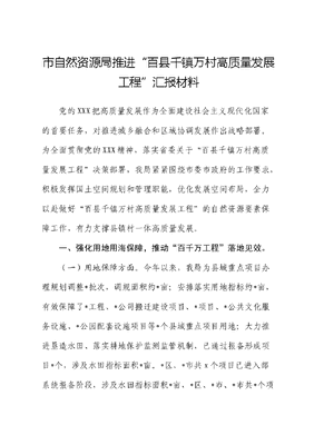 市自然资源局推进百县千镇万村高质量发展工程汇报材料党的XXX把高质量发展作为全面建设社会主义现代化国家的首要任务,对推进城乡融合和区域协调发展作出战略部署。为全面贯彻党的XXX精神,落实省委关于百县千镇万村高质量发展工程决策部署,我局紧紧围绕市委市政府的工作要求,积极发挥国土空间规划和管理职能,优化发展空间布局,全力以赴做好百县千镇万村高质量发展工程的自然资源要素保障工作,有力支撑县镇村一体高质量发展。一、强化用地用海保障,推动百千万工程落地见效。(一)用地保障方面。今年以来,我局为县域重点项目办理规划调整*批次,调规面积约*亩;安排落实用地指标约*亩,有效保障了*工程、*公司搬迁建设项目、*项目、*公共文化服务设施、*公园配套设施项目等*个县域重点项目用地;大力推进垦造水田、落实耕地保护监测监管机制,已通过报备形成项目*个,涉及水田指标面积*亩。*区、*市共x个项目已进入部系统报备阶段,涉及水田指标面积*亩,*区、*市、*市共*个项目已在省系统报备,涉及水田指标*亩,已协调省厅加快上报部系统备案。(二)用海保障方面。一是积极与国土空间规划编制单位沟通,在开发利用空间对渔业发展区能保尽保,全力保障海洋牧场、养殖用海空间发展需求;二是加强对滨海新区现代渔港经济区规划建设服务指导,提出项目用海优化建议。今年我市*宗开放式养殖(底播养殖)用海获得批复,用海总面积*亩。(三)增存挂钩方面。去年我局提前超额完成批而未供土地处置、省厅下达增存挂钩工作任务,以及国务院大督查指出的存量闲置土地处置。《*省自然资源厅关于*年度全省国有建设用地供应及开发利用监测监管情况的通报》指出,截至*年底,*市闲置土地处置率*.*%排全省第一。*年*月*日受到省政府电视电话会议通报,我市国务院大督查指出的存量闲置土地处置率排全省第二名,奖励用地指标*亩,为重大项目落地提供有力的计划指标保障。今年以来,我局积极做好*年度增存挂钩批而未供和闲置土地处置工作,制订本年度供地计划。省厅预下达*年度批而未供*亩,国务院大督查指出的存量闲置文可居文库——海量学习资料,手机电脑均可下载www.wenkeju.com土地任务*亩。我们集中攻坚力量,按照一地一策原则抓紧处置。二、抓好相关配套政策落实,拓展城乡发展空间。(一)推进城乡规划建设一体化工作。积极推进我市国土空间规划编制工作,三区三线划定成果自然资源部*年*月*日同意正式启用,*市国土空间总体规划成果完成了市级申报程序,已上报省厅开展省级审查和征求省级部门、相邻地市意见。(二)推进点状供地工作。充分利用乡村振兴点状供地政策,落实点状供地项目*宗,解决高州荔枝优势产业集聚区项目、电白区好心碧道及沙琅江流域城乡环境综合治理项目、茂南区鳌头镇飞马片区数字农业示范项目、茂南区好年景农副产品加工项目和茂南区环好心湖乡村振兴示范带(油城墟)项目用地问题。(三)推进全域土地综合整治试点工作。茂南区羊角镇获得国家级综合整治试点资格,高州市曹江镇、化州市杨梅镇获得省级综合整治试点资格。三个镇的全域土地综合整治试点实施方案均已通过市政府批准,并报省自然资源厅备案。文可居文库——海量学习资料,手机电脑均可下载www.wenkeju.com(四)推进城乡建设用地增减挂钩工作。目前,我市城乡建设用地增减挂钩正在立项实施*亩(高州市*亩),此前实施并验收通过确认*亩(信宜市*亩),已通过省自然资源厅验收备案*亩,省厅下达建新区指标*亩,已全部安排信宜市使用。(五)推进拆旧复垦工作。今年以来,我市*个拆旧复垦项目通过验收备案,共*亩,已交易复垦指标*亩。(六)抓好先进制造业政策落实。符合固定资产投资额*亿元(含)以上,且投资强度不低于*万元/亩和地均税收不低于*万元/亩的先进制造业项目,可申请省解决用地指标,这是今年省出台支持百千万工程的一项重要用地政策。茂食肉类加工有限公司搬迁建设项目首个使用该政策,已成功申请使用*亩省指标保障项目用地。当前,百千万工程的自然资源素保障工作仍然面临众多的不确定性和挑战。我们要立足新起点,落实好实施百千万工程的决策部署,谋划好今年自然资源领域工作。下一步,我局将进一步提高政治站位,全力做好用地用海要素保障工作。一是加强学习研究,加大宣传力度,用足用好国家和省土地利文可居文库——海量学习资料,手机电脑均可下载www.wenkeju.com用计划指标政策。二是加快推进垦造水田,尽快形成更多的耕地、水田指标,确保项目用地报批需求。三是主动服务,提前介入,积极指导建设单位做好重点项目的前期选址论证工作和落实专人跟进重大项目用地用海组卷审批全过程,提高用地用海审批效率,保障县域经济发展涉及的基础设施、民生工程,以及高质量发展要求的重点项目的用地