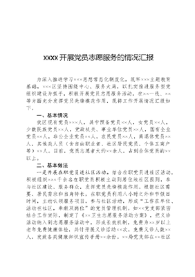 xxxx开展党员志愿服务的情况汇报为深入推进学习×××思想常态化制度化,筑牢×××主题教育基础,×××区坚持围绕中心、服务大局,以扎实推进服务型党组织建设为抓手,积极开展党员志愿服务活动,在××一线、××等方面充分发挥党员先锋模范作用,现将工作开展情况汇报如下。一、基本情况我区现有党员×××人,其中预备党员××人,女党员××人,少数民族党员××人,党政机关、事业单位党员××人,国有企业党员××人,非公企业党员××人,农民党员××人,离退休党员××人,其他类人员(含自由职业者、社区居民党员、个体工商户等)××人。目前,党员志愿者大约××余人,占到全体党员的××以上。二、基本做法一是开展在职党员进社区活动。结合在职党员进社区活动,积极组织×××千余名在职党员积极主动到居住地社区报到,参与社区建设、服务群众,发挥党员先锋模范作用。根据社区需要、居民需求和自身特长,在职党员利用八小时之外和节假日时间,主动认领服务项目,参与社区活动,形成工作在单位、活动在社区,奉献双岗位的党员管理机制。如××党支部紧密结合工作实际,制定了《××卫生志愿服务活动方案》,把义诊活动纳入到志愿服务活动中,形成长效机制,免费为××岁以上老年免费健康体检,共计开展义诊活动××次,免费义诊人数××人,发放各类健康知识宣传手册××余份。××局党支部在××社区开展了以同建绿色家园,共享碧水蓝天为主题的环保志愿活动,通过发放宣传资料、讲解环保知识、捡拾塑料袋、清除乱张贴乱涂写、清理生活垃圾等活动,组织引导党员和群众参与整治污染、环境保护等行动。二是开展文明交通志愿服务活动。为深入推进×××文明城市创建工作,全区××余名机关事业单位党员参与了交通志愿服务活动,分批到城区主要路口执勤,积极协助交警纠正行人和非机动车闯红灯,占用斑马线等不文明交通行为。对发现骑车欲横穿马路的市民和闯红灯的市民及时上前劝阻,并告知其不文明交通行为所带来的危害。倡导人们要从现在做起,从自身做起,从小事做起,养成文明出行的良好习惯,以自己的文明行为影响、带动身边的人,在全区营造起文明出行的良好氛围,促进广大群众树立绿色出行文明交通理念,为全区营造了良好的交通环境和文明秩序。三是把志愿服务与重点工作相结合。在打黑××方面,组织××名××党员志愿者深入到村、社区开展扫黑除恶、放管服宣传活动。在××方面,选派××名第一书记和驻村工作队员深入农区一线,在扶贫帮困的基础上,着力在推动农业增效上做文章,通过引导农民流转土地、发展中草药特色种植等方式,加快农业转型,提高农民收入。同时,开展微心愿、众奉献、同心援主题活动。通过动员包联单位党员认领微心愿,实现村民点单、支部派单、党员接单,积极帮助村民解决实际困难,有效打通服务群众的最后一公里。三、存在的问题一是活动开展主要以组织推动为主,党员自觉参与服务活动的积极性不高,主动开展服务的兴趣不浓,部分社区党组织个性化服务机制没有真正得到落实。二是党员志愿服务领域过于单一,党员志愿者队伍仅仅在扶贫帮困、政策宣传、卫生整治等方面开展志愿服务,没有延伸到更广泛的领域。三是党员志愿者队伍还没有形成规模化,人数偏少,服务时间不足。四、下一步打算文可居文库——海量学习资料,手机电脑均可下载www.wenkeju.com1.增加党员志愿者的学习交流,学习先进地区的工作经验。提升党员志愿者开展群众工作的能力,引导群众参与城市建设、脱贫攻坚的能力。打造过硬的党员志愿者服务队,通过知识讲解、物质依托,提高志愿服务积极性,加强与群众沟通,做大做强志愿服务队伍。2.加大宣传力度,创新多种形式的宣传方式,宣传党员志愿服务的理念和典型事例,提高党员志愿服务意识。广辟宣传渠道,贴近党员和群众宣传,开拓网络宣传主阵地,扩大宣传面、覆盖面。3.进一步建立和完善长效的党员教育和管理机制。每位党员都有责任和义务参加志愿服务活动,这是党章所赋予的责任。4.不断扩大志愿者队伍,充分调动党员的积极性和主动性,坚持把开展党员志愿服务活动与帮助群众解决实际问题结合起来,与发挥党员模范带头作用结合起来,与加强基层组织建设结合起来,进一步密切党群干群关系,增强全区基层党组织的创造力、凝聚力和战斗力,为××经济建设打下坚实的基础。文可居文库——海量学习资料,手机电脑均可下载www.wenkeju.com