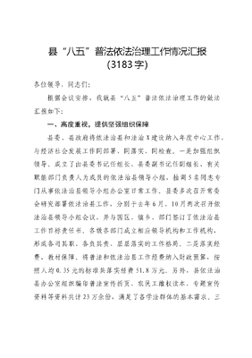 县八五普法依法治理工作情况汇报(3183字)各位领导,同志们:根据会议安排,我就县八五普法依法治理工作的做法汇报如下:一、高度重视,提供坚强组织保障县委、县政府将依法治县和法治X建设纳入年度中心工作,与经济社会发展工作同部署、同落实、同检查。一是加强组织领导。成立了由县委书记任组长、县委副书记任副组长、有关职能部门负责人为成员的依法治县领导小组,抽调5名同志专门从事依法治县领导小组办公室日常工作。县委多次召开常委会研究部署依法治县工作,分别于去年6月、10月两次召开依法治县领导小组会议,并与园区、镇乡、部门签订了依法治县工作目标责任书。各级各部门成立相应领导机构和工作机构,形成各司其职、各负其责、层层落实的工作格局。二是落实经费、教材保障。将普法和依法治县工作经费纳入财政预算,按照人均0.35元的标准共落实经费51.8万元。另外,县依法治县办公室组织编印普法宣传折页、农民工维权读本、专题宣传资料等资料共计23万余份,满足了各学法群体的基本需求。三是强化督促检查。县委、县政府将依法治县工作纳入2023年全县重点单项工作考核奖惩。结合我县实际,分类制定县级党政机关、镇乡、行政执法部门、学校、企事业单位等检查评分细则。由县四套班子领导带队,成立4个检查指导组,根据检查评分细则,采取听取汇报、查阅资料、走访座谈等形式,每半年对镇乡、县级部门和企事业单位普法依法治理工作进行一次督促检查,促进了工作的平衡发展。二、广泛宣传,营造浓厚法治氛围认真落实市委罗强书记群众在哪里,法制宣传教育工作就要到哪里指示精神,精心制定《依法治县法治X建设宣传工作方案》,大力加强法制宣传教育,有效推动全县干部群众学法守法用法。一是创新方式。编印《县以案释法汇编》《经典案例选编》读本,在高速路口、X与中江交界处、绵三路青山扁设置了大型宣传牌。将农村法制广播学校与电视、网络等新兴媒体充分结合,在《X州资讯》《今日X》开设法治在线专栏,编排播放法治文艺节目《反腐倡廉颂党风》,开通《法治X》手机报,以案释法、答疑解惑。二是拓展载体。将法制教育基地建设作为法制宣传阵地建设和法治示范单位创建的重要内容,在县看守所和人民检察院建立2个法制教育基地,正加快创建市级法制教育基地。积极推进法治文化广场建文可居文库——海量学习资料,手机电脑均可下载www.wenkeju.com设,在城区建立2处法治文化长廊、1个法治文化广场,各单位普遍建立法治文化墙,全县63个镇乡全部设置大型法制宣传专栏。三是突出重点。以农民工、妇女儿童、老年人等群体权益保护为重点,集中在人流集中区域开展八小时外法制宣传活动10余次,累计发放各类宣传资料3万余份,接受咨询500余人次,充分保障群众切身利益。三、注重实效,扎实开展八五普法按照省、市要求,及时印发法律七进工作方案,推动八五普法深入开展。在法律进机关、进单位方面。成立了普法讲师团,充分发挥全县各类法律专业人才的骨干作用。全面落实党委(党组)中心组学习会议学法、政府常务会议会前学法等制度,定期举办X州大讲堂、政法大讲堂,推进专题法制讲座常态化,全县干部学法、守法、用法、依法行政的自觉性和积极性显著提高。在法律进学校方面。3月以来,法制副校长到各中小学举办法制课堂X余场次,在部分中学开展预防青少年违法犯罪警示教育活动,举办交通安全、禁毒禁赌等相关法律知识讲座,受教育学生达到2.7万余人。今年3月,五失青少年关爱及青少年法制教育工作得到省关工委常务副主任曾清华的高度肯定。在法律进乡村(社区)方面。结合开展三下乡和综治平安宣传月活动,开展法律咨文可居文库——海量学习资料,手机电脑均可下载www.wenkeju.com询活动11场次,出动宣传车82台次,发放各种宣传资料近50万份,接受群众法律、政策咨询近1000人次。结合X州夜话活动,各级党员干部面对面向群众宣传法律知识5万余人次。在法律进宗教场所方面。利用春节期间,县宗教办、各镇乡组织党员干部集中深入各宗教场所开展法律法规宣传,基本覆盖所有信教群众。在法律进企业方面。县内各企业聘请了法律顾问。工商、质监、环保、安监等部门经常性深入企业,广泛宣传《安全生产法》等法律法规,广大企业职工学法守法用法氛围空前浓厚。四、突出重点,统筹推进依法治县一是深化依法行政。加快完善依法决策机制,县委带头修订《县委议事决策规则》,县政府坚持群众代表和网友代表列席常务会议制度。各级各部门普遍建立法律顾问制度,截至目前已有58个单位、42家医院、192所学校、30户规模以上企业聘请了法律顾问。巩固行政复议规范化建设成果,行政审批改革阶段性任务圆满完成,1—9月办结行政复议案件10件,办结率100%。二是推进公正司法。积极推进阳光办案阳光执