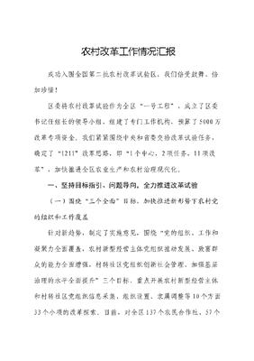 农村改革工作情况汇报成功入围全国第二批农村改革试验区,我们倍受鼓舞、倍加珍惜!区委将农村改革试验作为全区一号工程,成立了区委书记任组长的领导小组,组建了专门工作机构,预算了5000万改革专项资金。我们紧紧围绕中央和省委交给改革试验任务,确定了1211改革思路,即1个中心,2项任务,11项改革,加快推进全区农业生产和农村治理现代化。一、坚持目标指引、问题导向,全力推进改革试验(一)围绕三个全面目标,加快推进新形势下农村党的组织和工作覆盖针对新趋势,制定了实施意见,围绕党的组织、工作和凝聚力全面覆盖,农村新型经营主体党组织推动发展、致富群众的能力全面增强,村转社区党组织创新社会管理、加强基层治理的水平全面提升三个目标,重点开展农村新型经营主体和村转社区党组织信息采集、组织设置、隶属调整等10个方面33个小项的改革探索。目前,对全区137个农民合作社、57个家庭农场逐一建立台账,制定了培育农民合作社、家庭农场9条措施,组织开展了百日集中组建活动,选派36名党建指导员深入一线开展党组织组建工作,采取不同方式,建立党组织40个,到今年7月可实现新型经营主体党组织建设四个百分百。(二)破解四个难点问题,推动农业现代化和农民财产性收入增加持续化1.创新三种模式,破解地从何来难题。一是推行农村土地三权分离。在全区范围内启动确三权,颁三证,目前已发放首批农村土地经营权证;二是创新流转模式。成立乡镇、村级土地流转服务公司,既规范流转程序,又有意识地保证了土地的适度规模化和相对集中化;三是创新土地自愿有偿退出模式。以农民自愿为前提,以解决在建项目需求和提供项目战略储备为目的,实施农村集体建设用地自愿有偿退出。2.建强三个组织,破解怎样种地难题。一是建强新型经营组织。制定《培育农民合作社、家庭农场九条措施》和组建家庭农场联盟等措施,发挥新型经营主体根植农村,示范引文可居文库——海量学习资料,手机电脑均可下载www.wenkeju.com领优势,带动和培育更多的农民群众成长为新型农业经营业主。二是建强新型党组织。在农民合作社和家庭农场中有意识地建立起一支专业技术精,文化素质高,带富能力强的党组织队伍,让他们成为带头增收致富,带动产业发展的标兵。三是整合分散、小额的涉农资金,依托农业生产社会化服务组织,在产前、产中、产后三个环节,实现规划建设、技术培训、劳务输出、宣传营销、质量监管、风险防控六个方面的全方位服务。3.建立三个平台,破解钱从何来难题。一是建立农村产权评估、评审平台。建立由金融、财政、农业、新型经营主体中的带头人组成的评审、评估小组,为农村产权交易、融资提供依据。二是建立担保融资平台。采取银财保合作模式,以财政补贴,保险公司担保,银行贷款的方式,开展新型农村经营主体产权抵押贷款试点。目前,全区已收到贷款申请22笔,发放首笔贷款100万元,授信10家新型农村经营主体。三是建立管理平台。我们成立农村集体经济股份制合作社,对集体资产进行有效管理和经营。做到盘活既有存量,经文可居文库——海量学习资料,手机电脑均可下载www.wenkeju.com营融入增量,实现集体经济持续壮大,农民财产性收益持续增加。4.设置三道关口,破解如何防控风险难题。为有效地防范土地大量集中带来的风险,我们成立国有正兴有限公司,作为承载这一职责的重要主体。从严格流转审核,收取风险金,应急处置风险等三个方面不断规范农村土地流转的程序,有效避免农村改革过程中各类社会矛盾的发生。二、改革推进中遇到的问题随着改革的深入,我们面临的问题也随之凸显,主要表现在3个方面:(一)集体建设用地流动性不强。目前的方案是退出的集体建设用地指标只能在本乡镇区域内安排使用,如果能够在更大范围内流动使用,将会进一步增加农民的财产性收入和促进地方产业发展。(二)农村集体经济基础差,推动力薄弱。全区目前集体经济较好的村(社区)不足20%,个别村集体经济几乎为零。文可居文库——海量学习资料,手机电脑均可下载www.wenkeju.com因此,要建立一支创新思维广,改革观念新,带富能力强的组织,解决谁来壮大,谁来经营的问题是当前的难点。(三)农村金融产品与农户需求衔接不够。一是金融产品创新的权限在于顶层设计,基层金融机构只能执行;二是金融机构法律、政策的特殊性还不能完全匹配农村产权的流通局限性。若能针对农村改革试验区的需求,推出真正符合农民大众意愿的金融产品,将能更好地推动这项重要改革的实施。文可居文库——海量学习资料,手机电脑均可下载www.wenkeju.com