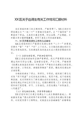 XX区关于选调生有关工作情况汇报材料在区委组织部门的正确领导、严格管理下,XX区到村任职选调生在一枝一叶中厚植为民情怀,在千锤百炼中彰显实干担当,尤其是在基层党建、村庄治理、产业赋能、乡村振兴等方面挥毫撒墨,书写了基层工作的崭新篇章。一、XX区开展选调生工作的几点路径XX区委组织部门严格落实选调生培养八个一的要求,坚持在管育用上下功夫,全力推动选调生到村任职工作落地落实,为选调生队伍快速成长成才提供坚强组织保证。(一)注重驻村管理,严抓细管强作风XX区委组织部始终坚持严管厚爱,把从严管理落实到选调生到村任职全过程,坚持管在经常、严在日常。严格按照《选调生政策落实清单》中规定的严格执行选调生在村签到、请示报告、工作纪实、请销假等制度要求,强化对选调生的日常管理。为确保选调生下得去、待得住、干得好,组织部门常态化采取四不两直方式实地走访群众、党员干部,或不定时视频查岗、发送实时定位了解选调生在村在岗情况,并及时督促驻村选调生详细记录工作日志,定期向镇街党(工)委和区委组织部汇报思想、学习、工作情况,力促选调生身到基层、心到基层。(二)深化跟踪培养,多重帮带强能力XX区组织部门在建立选调生个人成长档案的基础上,积极探索实施县处级领导干部传帮带、往届优秀选调生常态指导、村级党员骨干日常帮扶、定期座谈会答疑解惑的帮带培养机制,通过提要求、教方法、传经验、带作风,帮助选调生提升能力本领,有效解决到村任职选调生思想、工作、生活等方面的实际困难。截止目前,XX区组织部门紧紧围绕基层治理、乡村振兴等主题,举办选调生交流座谈活动X次;邀请县处级领导干部到村指导选调生开展驻村工作、开展村情、国情调研XX余次,形成调研报告XX篇,有效帮助到村任职选调生掌握村情脉络,打牢筑梦乡村根基。(三)注重经费使用,督导履职强担当XX区组织部门以加强对到村任职选调生工作补助资金的管理为抓手,对选调生专项经费的使用范围、报销程序、管理责任做出具体要求,督促选调生担当履职。有效帮助村庄发展,提升群众的幸福指数。在经费使用过程中,XX区组织部门严格督导选调生与村两委商议规划,要求各乡镇党委严格审批,并通过自查评估+实地核查的方式,对选调生专项经费支出是否符合计划、是否符合程序进行评估,对支出不及时、不规范的行为进行督促整改,保障选调生经费使用合理、规范。二、XX区开展选调生工作存在的主要问题一是制度政策细化落实不到位。当前从上到下关于选调生教育培养、日常管理、选拔任用等方面的政策、制度相对完备,但在政策落实保障及监督方面还需要细化。如针对选调生的专门培训问题,生活保障问题,职业发展问题等,都要得到进一步明确而加以解决,以避免政策的落实走样。二是岗位锻炼、重点任务历练不到位。把选调生放到基层一线蹲苗、淬火是选调生成长成才的必要途径,但在实际工作中,到村任职选调生多忙于处理村内日常工作,上级部门很少给选调生压担子,导致选调生参与重点任务、重点工作的机会较少,岗位历练不够充分。三、XX区开展选调生工作的几点对策一是注重多措培育。一方面,加强教育培训。借助党校培文可居文库——海量学习资料,手机电脑均可下载www.wenkeju.com训、实地调研、交流座谈等形式,紧密围绕新时代新征程的各项目标任务,为选调生提供专业培训;二是注重实践锻炼。常态化组织选调生开展乡村振兴大走访、大调研,把问题发现在一线、解决在一线,高效锤炼选调生的工作能力。二是加强关心关爱。一方面,组织部门要通过下村走访、上门座谈等形式,全面了解选调生基层的表现情况,给不在状态的敲警钟,工作压力大的送温暖,努力不让一个选调生掉队;另一方面,要强化政策保障,及时协调住建、人社等相关部门落实各项工作、生活待遇,解决选调生后顾之忧。三是完善制度机制。一方面,不断完善选调生使用、交流、岗位历练等机制,创造选调生成长发展的良好条件,真正让选调生留得住、用得上、有奔头。另一方面,强化经费保障,在指导定向选调生用好专项经费的基础上,加强对普通选调生开展工作的经费投入,保障选调生在基层一线干事创业。文可居文库——海量学习资料,手机电脑均可下载www.wenkeju.com