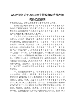 XX厅党组关于2024年主题教育整治整改情况的汇报提纲尊敬的杨组长、省委主题教育第七督导组的各位同志:按照省委主题教育领导小组《关于全省第一批主教育地方和单位开展整治整改回头看的通知》和《关于对全省整治整改任务落实情况集中开展巡回督导的工作方案》要求,现将我厅主题教育整治整改情况汇报如下。厅党组认真落实中央和省委关于主巩固深化主题教育成果的要求,在省委主题教育第七指导组的领导下,坚持问题导向和求解思维,紧紧扭住跟进学习、以上率下、问题导向和项目推进等4个环节,聚焦省委1+13文件要求和厅整改方案,持续推动专项整治落地见效。目前围绕六个对照、重点查找五个方面差距,厅党组班子查找8个问题,已整改到位;个人查找44个问题,已写出整改报告。专项整治8项任务已基本完成,落实14项措施并长期坚持;1个突出问题整治整改完毕;专题民主生活会13项整改任务有10项基本解决,落实40项措施并立行立改,涉及到改革创新、勇于担当的问题需要持续推进解决,为民服务、指导基层业务工作还需长期坚持,深化放管服改革因涉及国家政策调整,待配套政策下发后修改实施。一、紧紧扭住跟进学习,切实增强整治自觉。厅党组原原本本读原著、学原文、悟原理,逐字逐句通读研修规定书目。跟进学习XXXXXX在中央和国家机关党的建设工作会议、在内蒙古、河南、甘肃、上海指导主题教育的最新重要讲话精神,学习XXXXXXXX大重要讲话、关于xx工作的重要指示精神和XXXXXX关于生态文明建设和自然资源管理重要讲话汇编,悟其道、明其理、通其意、感其情,从中寻找精神坐标、汲取精神力量。坚持把整改落实作为主题教育的实践落点,按照XXX在内蒙古考察并指导开展主题教育时强调以解决实际问题的成效为衡量标准,发现问题立行立改,不能拖延,不能虚与应付指示要求,把改字贯穿始终,解决党员干部存在的违背初心和使命的各种问题,把增强四个意识、坚定四个自信、做到两个维护的要求,落实到自然资源领域担当作为、履职尽责的实际行动上来。二、紧紧扭住以上率下,层层压实整治责任。厅党组成立整治工作组,由我任组长、副厅长任副组长,设立整改工作办公室,副厅长韩宇光兼任办公室主任。制定《整治工作方案》和治理清单,坚持组长对专项整治工作负总责,统筹推进,全面整改。副组长既带头认真整改,又抓分管领域的整改,牵头督办具体整改事项。成立7个指导组对处室和直属单位进行指导。对方案明确的整改任务和工作措施,逐项分解落实到厅领导及相关单位,定期督促调度,靠前抓好落实。对涉及自然资源行业问题进行上下联动,对11个市(州)局查找的15个涉及自然资源领域问题进行剖析融合,落实到整治整改任务中。办公室、人事处、机关党委和机关纪委从严督促检查,严格责任追究,倒逼各单位持续用力抓整改。省厅主题教育领导小组2次对整治整改工作进行督导,广泛听取群众意见,整改情况在适当范围内公布,自觉接受党员、群众监督。梳理进展落实情况,对基本完成的、尚未完成的以及整治效果不理想、群众不满意的分类提出巩固深化的具体措施,持续推进、务求实效。三、紧紧扭住问题导向,分类确定整治重点。对照省委1+13文件要求,我们在领导干部违规经商办企业、扫黑除恶、整治防范化解重大风险、脱贫攻坚、环保督察和营商环境等6个方面,成立了专项组织,制定了方案,落实了措施,对领导干部利用名贵特产特殊资源谋取私利进行自查。结合自然资源实际,明确整治工作的4个重点方向。一是重点对标XXXXXX重要讲话精神找差距。及时跟进学习领会XXXXXX系列讲话精神和提出的工作目标、理念、原则、思路、举措,对标对表文可居文库——海量学习资料,手机电脑均可下载www.wenkeju.com找整治整改的差距和短板,明确深化整治整改的具体措施。二是重点整治贯彻落实新时代中国特色社会主义思想和党中央决策部署不力的问题。看是否坚持党的政治建设是党的根本性建设,把党的政治建设摆在党的建设的首位,是否增强四个意识、坚定四个自信、做到两个维护,对学习不够重视、走过场,消除不良影响不力和基层党组织弱化等问题,坚决进行整肃。三是重点解决为民服务的问题。紧紧围绕自然资源中心任务,聚焦工作思路措施不当、指导推动不力,不敢面对问题、触及矛盾,工作长期没有实质性进展、群众反映强烈的问题长期得不到解决等问题,一项一项进行梳理,对个别项目办理建设用地前期手续时间过长,持续开展违建别墅问题清查整治,优化营商环境力度不大等问题,坚决进行整治。四是重点抓好力戒形式主义、官僚主义。积极倡导十要作风,对创新意识不强,只求无过,得过且过,导致工作思路不清、能力素质不高,扶贫招数不活,基层政策不会用,自然资源效能发挥不好的问题,坚决抓好整改。四、紧紧扭住项目推进,确保整治实效。按照中央和省委精神,针对存在