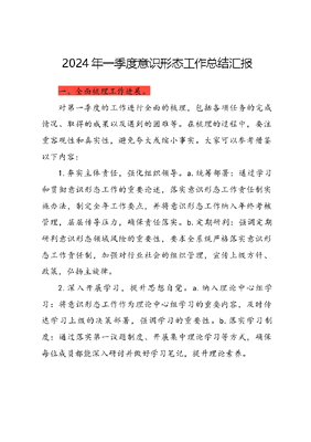 2024年一季度意识形态工作总结汇报一、全面梳理工作进展。对第一季度的工作进行全面的梳理,包括各项任务的完成情况、取得的成果以及遇到的困难等。在梳理的过程中,要注重客观性和真实性,避免夸大或缩小事实。大家可以参考借鉴以下内容:1.夯实主体责任,强化组织领导。a.统筹部署:通过学习和贯彻意识形态工作的重要论述,落实意识形态工作责任制实施办法,制定全年工作要点,并将意识形态工作纳入年终考核管理,层层传导压力,确保责任落实。b.定期研判:强调定期研判意识形态领域风险的重要性,要求全系统严格落实意识形态工作责任制,加强对行业社会的组织管理,宣传上级方针、政策,弘扬主旋律。2.深入开展学习,提升思想自觉。a.纳入理论中心组学习:将意识形态工作作为理论中心组学习的重要内容,及时传达学习上级的决策部署,强调学习的重要性。b.落实学习制度:通过落实第一议题制度、开展集中理论学习等方式,确保每位成员都能深入研讨并做好学习笔记,提升理论素养。3.聚焦重点工作领域,做好融合共促。a.强化党建引领:通过六同步工作机制,将党建工作与社会组织工作紧密结合,确保社会组织在意识形态领域的正确方向。b.强化组织保障:加强与社会组织相关部门的协同合作,提供组织保障,确保社会组织的规范管理和意识形态安全。c.加强综合监管:通过多种方式,全方位掌握社会组织的动态,促进社会组织健康有序发展,确保意识形态领域的安全稳定。4.做好正向舆论引导,强化监管监督a.强化阵地管控:定期组织网络意识形态检查,及时发布检查结果并督促清理,确保网络意识形态领域的绝对安全。b.加强舆情管理:积极防范意识形态领域重大风险,加强与宣传网信部门的沟通联络,保障舆情平稳可控。二、正视存在的问题。工作中难免会遇到各种问题和挑战,要正视这些问题,深入分析其产生的原因,并提出切实可行的改进措施。这样才能不断提升下一阶段的工作能力和水平。大家可以从思想掌控不够全面深入、应对新媒体影响的创新思路举措不多、社会组织党建指导不够等方面进行剖析。三、制定明确的工作计划。在总结过去的同时,还要对未来进行规划。根据第一季度文可居文库——海量学习资料,手机电脑均可下载www.wenkeju.com的经验和教训,制定明确的工作目标和计划,确保在下一步的工作中能够取得更好的成绩。1.深化责任意识:加强组织领导,推进责任落实,加强意识形态工作的引导力和管控力,牢牢把握正确的方向。2.突出思想引领:深化拓展主题教育成果,深入学习贯彻《党史学习教育工作条例》,推进党史学习教育常态化制度化,增强主流意识形态的凝聚力和引领力。3.强化阵地管控和舆情管理:继续加强网络意识形态的检查和舆情管理,确保网络意识形态领域的绝对安全。4.加强组织领导和队伍建设:针对存在的问题,加强组织领导和队伍建设,提升意识形态工作的能力和水平。文可居文库——海量学习资料,手机电脑均可下载www.wenkeju.com