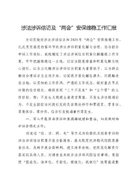 涉法涉诉信访及两会安保维稳工作汇报为切实做好涉法涉诉信访和2024年两会安保维稳工作,扎扎实实推进检察环节的涉法涉诉积案化解与治理,结合控告申诉工作实际,我院制定了涉法涉诉信访积案化解维稳工作方案。牢牢把握维稳这一主线,以信访隐患排查和积案化解为核心指引,以全力化解涉法涉诉信访积案为重要抓手,以为群众解决合理诉求为主攻方向,切实将矛盾化解在源头,问题解决在当地,以实细的工作作风,严谨的工作状态,做好重点节点时期的信访稳定,确保实现三个不发生和五个零的工作目标,即:不发生大规模去省进京聚集,不发生涉访极端行为,不发生因信访问题引发的负面舆论炒作和零进京、零非访、零集体访、零炒作、信访引发极端事件零发生。一、深入开展涉法涉诉积案摸排梳理和整治,切实做好维护社会稳定工作。对通过信、访、网、电等方式向检察机关控告申诉的涉法涉诉信访积案开展全面排查,最大限度把涉稳风险隐患排查出来。及时开展会商研判,建立清单台帐,把防范化解责任落实到具体人员。对排查出来的涉法涉诉风险信访事项,要按照图表化、清单化、手册化、模板化、机制化统筹推进整治解决。隐患能够立即整改消除的,诉求能够立即协调解决的,要边查边改、边整边改。按照控增量、减存量、分类解决、突出重点的原则要求,牢固树立有患必除、除患务尽的思想,积极开展涉法涉诉风险信访防范化解工作,最大限度地防范化解到位。对重大风险隐患,要采取领导包案的方式,逐级压实责任,坚决稳控化解。对一时难以化解到位的,要明确时限要求,限期办结。对可能引发重大不稳定因素的风险,要及时报告上级院及当地党委、政府。2023年排查出的涉法涉诉信访隐患共有7件,其中5件已化解或隐患解除,剩余2件仍在稳控中。二、2024年全国两会安保维稳工作开展情况。 针对2024全国两会,我院已对涉检信访隐患进行了全面排查,共梳理出隐患3件,分别是时卓举报冯武、冯双诈骗案,王冰、王宁不服对犯罪嫌疑人李长云不起诉决定申诉案。已将详细案情、责任人、包保领导等信息报信访局和属地单位,实现了属地、信访和事涉单位联合稳控;针对网络炒作的舆情,我院成立了舆情监控小组,由政治部统一领导指挥,24小时监控网络舆情,每天两次向领导和上级院汇报情况,掌握动向;现时卓举报案件的法律程序在公安局侦查阶段,王冰、王宁的申诉程序在白城市院的审查阶段,现未给出审查结论。文可居文库——海量学习资料,手机电脑均可下载www.wenkeju.com为确保两会期间安全稳定,我院确定专人每天向上级院和信访局进行零报告制度,实时掌握动态,快速处置,法警排班驻守信访接待场所,维护信访秩序。每天安排领导带班接访、下访,解决群众诉求,确保矛盾不上行。三、应对举措及下一步工作打算。(一)提高政治站位,强化责任担当。要牢固树立全院一盘棋思想,以高度的政治自觉、法治自觉、检察自觉,加强组织领导和工作落实,将涉检维稳专项整治、重复信访治理、件件有回复回头看专项工作等有机结合起来,同步开展、同步落实,确保两会期间检察环节信访工作的绝对安全稳定。(二)加强组织领导,周密安排部署。涉法涉诉信访积案及接访领导小组要切实加强组织领导,对本地、本院的信访积案化解工作进行安排部署,制定工作方案,明确责任,细化工作措施,履行好各部门职责,早启动、早推进,保证工作实效。(三)加强协调配合,借助各方力量。检察机关在化解涉法涉诉信访积案时,要及时向党委、政府和同级信访联席会议办公室汇报,积极争取支持,借助基层党政、维稳、综治和调解力量在化解积案中的重要作用。在广泛接受社会各界、人民群众和新闻媒体的监督下,充分听取意见和建议,既坚持工作责任分配原则,同时作好主动配合、相互协调、高效动作、无缝链文可居文库——海量学习资料,手机电脑均可下载www.wenkeju.com接。(四)强化应急处置,及时报送信息。完善应急处置预案,增强针对性、实用性和可操作性。保证一旦发生突发性事件,能够及时快速反应,妥善处置。对于重点敏感信访事项特事特报、急事急报,不得瞒报、漏报和迟报。(五)强化工作纪律,严肃追责问责。对因重视不够、措施不力、推诿扯皮或者因工作不负责任,造成影响社会稳定、重大网络舆情等严重信访事件的,依据有关规定追究相关人员的责任。xx市人民检察院 2024年2月27日文可居文库——海量学习资料,手机电脑均可下载www.wenkeju.com