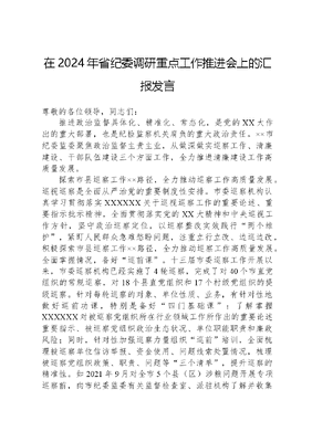 在2024年省纪委调研重点工作推进会上的汇报发言尊敬的各位领导,同志们:推进政治监督具体化、精准化、常态化,是党的XX大作出的重大部署,也是纪检监察机关肩负的重大政治责任。××市纪委监委聚焦政治监督主责主业,从做深做实巡察工作、清廉建设、干部队伍建设三个方面工作,全力推进清廉建设工作高质量发展。探索市县巡察工作××路径,全力推动巡察工作高质量发展。巡视巡察是全面从严治党的重要制度性安排。市委巡察机构认真学习贯彻落实XXXXXX关于巡视巡察工作的重要论述、重要指示批示精神,全面贯彻落实党的XX大精神和中央巡视工作方针,坚守政治巡察定位,以巡察整改实效践行两个维护,紧盯人民群众急难愁盼问题,注重立行立改、边巡边改,积极探索市县巡察工作××路径,全力推动巡察工作高质量发展。全面掌握情况,备好巡前课。十三届市委巡察工作开展以来,市委巡察机构已经实施了4轮巡察,完成了对40个市直党组织的常规巡察,对18个县直党组织和17个村级党组织的提级巡察。针对每轮巡察的对象、单位性质、业务,有针对性地做好巡前功课,特别是备好四门基础课:了解掌握XXXXXX对被巡察党组织所在行业领域工作所作出的重要论述重要指示、被巡察党组织政治生态状况、单位职能职责和廉政风险;同时,针对性加强巡察力量组织巡前培训,全面梳理被巡察单位信访举报、资金使用、问题线索处置情况,梳理被巡察党组织政策、职责、问题等三个清单,提升巡察的精准性。如2021年9月对全市5个县(区)涉粮问题开展专项巡察前,向市纪委监委有关监督检查室、派驻机构了解并收集情况,把巡察监督与纪律监督、派驻监督、监察监督有效贯通起来,巡察中发现问题88个、问题线索21件,有力有效推动了粮食购销领域专项整治的深入开展。全市各级纪检监察机关共立案审查调查涉粮案件53件49人,移送司法机关12人。精准发现问题,上好震慑课。XXXXXX强调,发现问题是巡视监督的首要职责、基本职责。只有能够发现问题,巡察监督才能长牙带电,形成有力震慑。市委巡察机构坚持把发现问题作为开展巡察的关键,着力在解决如何发现问题、发现深层次问题上下功夫。比如,针对县(区)巡不准巡不深巡不动的问题,积极探索系统式重点式带动式提级巡察,充分运用混合式互派式推磨式交叉巡察,有力推动县(区)提高巡察质效。本届县(区)委开展巡察以来,全市5个县(区)共巡察386个党组织,发现问题线索500件,给予组织措施229人,党纪政务处分84人,留置6人。在全省率先开展对由副县级领导干部任主要负责人的5个县(区)党委宣传部、统战部、县(区)总工会提级巡察,发现共性问题264个,发现问题线索17件,分别比上一轮县(区)同级巡察增长41.2%和88.9%。紧盯成果运用,做实整改课。XXXXXX指出,巡视发现问题不解决,比不巡视的效果还要坏。巡察不是把问题找出来就完事,而是要采取积极措施,推动问题全面彻底得到解决。市委巡察机构坚持把提升巡察整改后半篇文章的质效作为检验巡察成果的重要标准,探索建立市委巡察办列席县(区)巡察工作会议、市委巡察组副县级以上巡察专员一对一指导县(区)巡察工作等29项制度机制,有力推动了县(区)巡察整改工作。探索实施市县纪委监委、组织部、巡察办对整改情况三方会审,建立集中检查+回头看+问责巡察整改督查机制,以严肃追责问责倒逼整改落实。据统计,5个县(区)问责巡察整改不力的党组织16个,给予党纪政务处分3人,组织处理23人。其中,2021年对巡察整改到位率低的某市直单位党组通报文可居文库——海量学习资料,手机电脑均可下载www.wenkeju.com批评,给予党组书记党内严重警告处分。通过巡察推动了各个领域的专项整治治理取得实效,如通过对三个一批重点村社专项整治和提级巡察,推动城区义井镇神峪村一跃成为党建先进村、市民乡村旅游打卡地。做细做实全面、示范、深化三篇文章,助推清廉××建设走深走实。省第十二次党代会作出全面建设清廉山西的重大部署以来,市委坚决扛起全面建设清廉××的主体责任,坚持三不腐一体推进理念,做细做实全面、示范、深化三篇文章,把清廉建设与全面从严治党、党风廉政建设和反腐败斗争一体谋划、一体部署、一体推进,推动清廉××建设全面铺开、走深走实。全面就是做到责任、内容、人员三个全覆盖。一是责任全覆盖,市、县(区)、各清廉单元、各条块任务牵头单位、各创建单位党组织组建工作专班,全部召开党风廉政建设和清廉创建部署会,压实创建责任、细化创建任务、创新创建形式,形成了上下衔接、左右贯通、横向到边、纵向到底的责任落实体系。二是内容全覆盖,在管党治党、权力运行、干部管理、文化培育、示范创建五大体系方面全面覆盖、整体推进,建立健全相关制度机