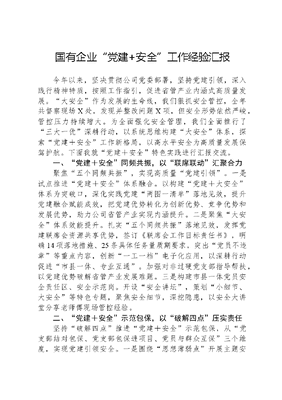 国有企业党建+安全工作经验汇报今年以来,坚决贯彻公司党委部署,坚持党建引领,深入践行精神特质,按照工作指引,促进省管产业内涵式高质量发展。大安全作为发展的生命线,我们狠抓安全管控,全年共督察现场X处,发现并整改问题X项,但安全形势依然严峻,管控压力持续增大。为全面强化安全管理,我们全面推行了三大一优深耕行动,以系统思维构建大安全体系,探索党建+安全工作新格局,以高水平安全为高质量发展保驾护航。下面我就党建+安全特色实践进行汇报交流。一、党建+安全同频共振,以联席联动汇聚合力聚焦五个同频共振,实现高质量党建引领。一是试点推进党建+安全体系融合。以构建党建+大安全体系为突破口,深化实践党建两图一清单落地见效,提升党建融合赋能成效,把党建优势转化为创新优势、竞争优势和发展优势,助力公司省管产业实现内涵提升。二是聚焦大安全体系效能提升。扎实五个同频共振落地见效,发挥党建联席会资源共享优势,签订《联席会工作目标责任书》,明确14项落地措施、25条具体任务量质期要求,突出党员不违章等重点内容,创新一工一档电子化应用,以深耕行动促进市县一体、专业互通。加强对非过硬党支部指导帮扶,以党建优势破解省管产业发展难题。三是构建市县一体党员安全责任区、安全示范岗。开设安全讲坛,策划小细节、大安全等特色专题,聚焦安全细节,深挖隐患,以安全大讲堂分享老师傅现场管控经验。二、党建+安全示范包保,以破解四点压实责任坚持破解四点推进党建+安全示范包保,从党支部结对包保、党支部包保进项目、党员与群众互保三个维度,实现党建引领安全。一是围绕思想薄弱点开展主题安全大讨论。突出党支部战斗堡垒作用和党员先锋模范作用,组织安全主题例会和全员大讨论,对安全管理进行再分解、再动员、再部署、再落实。二是围绕安全风险点开展安全风险评估。工程现场设立党员安全责任区、党员示范岗,规范设置责任区标识,强化施工安装、生产检修、工程及投资建设项目等安全风险防控。三是围绕工作关键点促进安全可控在控。打造标准化现场样板,确保凡有党员参与的作业现场,一律符合六到位一规范标准化作业要求,以全员无违章的自主意识和自觉行动,构筑产业安全防线,打造一批党员零违章示范工程和标准化现场样板。四是围绕管理突破点推进安全履职尽责。完善安全生产责任制,修订各级人员安全职责清单,厘清各级领导、管理人员、一线员工安全职责界面。开展履职尽责专题培训,组织党员领导干部、项目经理、现场工作负责人,针对应知应会、安全履职等内容开展专题培训,让党员自觉成为安全助理员和安全监督员。三、党建+安全双向融合,以文化建设确保稳定聚焦省管产业内涵式高质量发展目标,倡树大安全文化理念。一是做好党建工作与安全管理全面融合。坚持抓党建从安全出发,抓安全从党建入手,支部书记带头做好六个在现场示范引领,以头雁效应激发群雁活力,支部委员以四张表强化党建+安全双向履责。二是做好党建业务与安全三问高度融合。围绕党员责任区、党员示范岗建设,举办安全三问大讲堂,各党支部围绕什么是违章?十不干内容是否清楚?现场作业如何做到三不伤害等三个问题,举一反三分析本单位存在的危险点,有针对性地提出防范措施,增强作业人员自我保护意识和能力,把党员培养成安全三问的推动者、实践者、示范者,在融合中彰显党建本质。三是做好党建业务与素质提升的深度融合。发挥党支部书记核心作用,提高党员干部学思干讲能力,打造一支党员讲师团队,争做赋能产业安全管理的蒲公英。聚焦牢文可居文库——海量学习资料,手机电脑均可下载www.wenkeju.com固树立安全意识、迅速提升专业技能、深化企业岗位认同,将安全文化、廉洁文化纳入新翼·丰翼·鸿翼进阶跟踪式培养体系,在省管产业安全、廉洁、舆情等方面实现文化认同,促进企业和谐稳定。在下一步工作中,公司党总支将继续坚持工作指引,紧抓内涵提升期、能力突破期、治理优化期、改革攻坚期四期叠加发展机遇,以党建+三大体系一体抓、党建+深耕行动融合抓为突破口,深化两图一清单落地应用,重实效、树典型、塑品牌,推动以质图强的内涵式增长,为打造产业示范标杆高擎领航旗帜、提供坚强保障!文可居文库——海量学习资料,手机电脑均可下载www.wenkeju.com