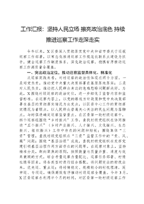 工作汇报:坚持人民立场 擦亮政治底色 持续推进巡察工作走深走实今年以来,X区委深入贯彻落实党中央和省市委关于巡视巡察工作部署,以常态化推进巡察工作规范化联系点建设为抓手,健全巡察工作制度体系,深化政治巡察,稳慎有序推动巡察工作高质量全覆盖。一、突出政治定位,推动巡察监督具体化、精准化从巡察实践来看,对村巡察的政治性体现在两个方面。一是对党负责,推动党中央重大决策部署在基层落地落实;二是对人民负责,推动把人民群众身边的急难愁盼问题解决好。为此,X围绕村级巡察的政治定位,进一步细化了监督内容和监督标准。在巡察内容上,以党的路线方针政策和党中央决策部署在基层的贯彻落实情况为出发点,以区委中心工作的贯彻落实情况为着眼点,以人民群众普遍关心关注的民生问题为落脚点,与时俱进确定巡察监督重点。在区委第一轮村级巡察中,四个巡察组围绕乡村振兴工作,查找村级党组织在协同推进五个振兴(乡村产业振兴、人才振兴、文化振兴、生态振兴、组织振兴)工作中存在的问题和短板;围绕集体三资管理,查找村级党组织在三资监管工作中的责、风、腐问题;围绕基层治理成效,查找村级党组织在发挥党建引领基层治理作用方面存在的问题等。在巡察对象上,坚持精准分类,靶向聚焦的原则,按照数量与质量并重、进度与效果兼顾的方式,综合考量巡察力量配比、巡察任务部署、村情社情等因素,将各类型村进行组合搭配。将问题突出的村找出来,优先巡、重点巡;将村情稳定、规模较小的村梳理清,延伸巡、专项巡,确保高效有序推动村级巡察全覆盖。今年3月,X区委巡察办利用半个月的时间,对区委第一轮村级巡察工作开展巡前调研。听取了区纪委相关监督检查室情况通报,重点了解各村重点人、重点事;分别与各乡镇党政主要负责同志进行会商,掌握各村总体情况、班子运转等信息;对重点村进行现场走访,与村组干部、村民代表、党员代表等相关人员座谈交流,详细了解村两委班子建设、资金资产、乡村振兴等方面工作情况,收集掌握基础数据,深度了解村情民意,确保精准拟定巡察对象,增强对村巡察的针对性和实效性。在聚焦关键少数上,加强对党支部书记、村委会主任一肩挑人员的监督,查找在履行职责方面的政治偏差、在服务群众方面的行动落差和群众身边的腐败问题、不正之风,着力解决村级党组织引领力、组织力、执行力不够强等问题。在区委第一轮村级巡察中,区委巡察办制定了《对村党支部书记评价清单》,组织各巡察组从工作落实、工作能力、工作作风等方面对村党支部书记进行评价,精准画像,为党委科学决策提供参考。二、优化方式方法,推进村级巡察提质增效X巡察深刻把握中央、省市委对巡视巡察工作的新部署新要求,坚持边探索、边实践、边总结,持续加强和改进巡察工作。一是做足巡前准备。全面复盘一届区委村级巡察工作,重点围绕村级巡察中村务、党务、财务等3个方面,梳理汇总50项较为多发、易发、频发的问题表现形式,逐项明确了问题载体和相关文件规定,建立村级巡察工作整体清单,指导巡察干部照单抓药、按图索骥。从实践运用来看,该清单能够帮助巡察组迅速找准巡察发现问题的突破口,打开工作局面,提升巡察工作效率和精准度。二是配强人员力量。制定了《进一步强化巡察干部队伍建设的实施办法》,从专职力量、相对固定力量、抽调力量三个方面对参与巡察监督的人员范围进行明确,拓宽干部选派的来源,加强巡察干部队伍的人员储备。三是拓宽监督渠道。X巡察密切与人大监督的有机衔接,建立了巡察监督与人大监督贯通融合机制的工作办法,搭建了协同联动的有效路径,全面增强巡察监督发现问题的多样性、灵活文可居文库——海量学习资料,手机电脑均可下载www.wenkeju.com性和时效性。四是优化工作流程。巡前,简化工作流程,采用区主会场+乡镇分会场的模式,将巡察动员部署会直接开到被巡察村党组织,与进驻动员会一并召开,把区委的工作要求直传一线,提升巡察震慑力。巡后,采用一乡一报告,一村一清单的形式向区委书记专题会议报告巡察情况。对共性问题进行横向梳理归纳,写入报告主要问题部分;个性问题纵向核查了解、研判分析,根据问题严重程度,分类列为问题线索或者所属村的问题清单,提升问题精准性。三、深化标本兼治,提升基层监督治理质效做实做好巡察整改后半篇文章,是检验巡察成效的重要标准。X区通过三个坚持,促进巡察反馈问题整改工作落实落细落到位。一是坚持立行立改见成效。密切关注群众的呼声和反映,结合乡村振兴和营商环境等重点工作,持续在就业、医疗、教育、社保、环境、出行等方面,解决群众的急难愁盼问题。现场巡察期间,交办立行立改问题10余件,做实了村民灾后补偿久拖不决、群众出行难、用水难等一批事关群众切身利益的好事儿、实事儿。二是坚持系统治理促根治。针对巡察中发现的共性问题,建立整改责任上提、分级分类通