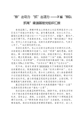 排出动力 抓出活力 ——X省排队抓尾建强基层党组织汇报每逢星期三,清镇市青龙山街道东山社区党群服务中心社区党员干部就会和居民一起,宣传惠民政策、打扫公共卫生、围绕社区建设开展讨论……小区有回迁户、安置户、租住户,生活习惯不同,矛盾易发多发。社区开展相约星期三等活动,党员让大家见面交流,逐渐形成爱护家园的共识,气顺了心齐了。社区居民段明文说。在排队抓尾中,东山社区因为治理成效不好被列为后进。在街道党工委的鞭策和支持下,社区两委痛定思痛,深挖病灶,第一时间制定整顿提升方案,培强支部书记,带动党员先行,建立民情快收、快处、快答的三快机制,推动构建未诉先办·有诉即清,矛盾纠纷月案件数持续下降,居民满意度从32%上升到75%,后进社区蝶变为先进社区。近年来,我省认真落实XXXXXX关于加强基层党组织建设的重要论述,聚焦强基固本,坚持抓两头带中间,在全省探索开展排队抓尾工作,县乡村三级联动,深入排查整顿提升后进基层党组织,积极培育创建先进基层党组织,带动中间部分创先争优,着力推进基层党组织全面进步、全面过硬,不断展现新气象新面貌。排队分类 对基层党组织全面体检基层党组织是贯彻落实党中央决策部署的最后一公里也是联系服务群众的最先一公里。我省坚持大抓基层的鲜明导向。2023年初,省委先后印发《关于推动基层党建高质量发展的指导意见》和农村、城市、机关、国有企业、高校、公立医院、新兴领域7个领域基层党建行动方案,以黔进先锋·贵在行动为总载体,分类指导,精准施策,推动各领域基层党建提质增效。省委书记、省人大常委会主任徐麟在全省主题教育总结会上强调,要通过排队抓尾等方式持续整顿软弱涣散基层党组织。排队抓尾是基层基础强双基的重要抓手,通过精准识别、分类排队,对基层党组织进行全面体检,找准差距、分出优劣,对症下药、靶向治疗。省委组织部有关负责人介绍。按照省委部署要求,全省各地扎实开展排队抓尾工作,聚焦基本组织、基本队伍、基本活动、基本制度、基本保障五个基本建设成效,结合上年度综合考核、擂台比武、述职评议等结果,对乡镇(街道)党(工)委、村(社区)党组织全面排队分类,逐一过筛子,按照一定比例确定后进和先进党组织,集中整顿后进,培育先进典型,排出动力、抓出活力,整乡推进、整县提升。贵阳市结合开展主题教育,听取县级联系部门、乡镇(街道)包保干部意见,全面了解村(社区)党组织抓党建、促发展、惠民生的情况,采取乡镇摸排、区县研判、市级统筹的方式,确定后进村(社区)党组织134个。对后进村(社区)量身定制整顿方案和验收标准,做到问题查摆清、销号时限明。六盘水市水城区结合深入学习贯彻党支部工作条例,通过现场听、公开评、广泛谈、实地访,对全区所辖单位开展党支部排队抓尾工作进行复核,确保对基层党组织精准分类评定。为进一步规范提升排队抓尾工作,巩固拓展主题教育成果持续建强基层党组织,2023年12月,省委党建工作领导小组印发《关于围绕强双基开展排队抓尾、双整双创行动的通知》,从全面排队分类、集中整顿后进、培育先进典型、加强组织保障等4个方面,提出了11条措施,指导各地集中整顿后进乡镇(街道)党(工)委、村(社区)党组织,培育创建先进乡镇(街道)党(工)委、村(社区)党组织,同时明确机关、国企、高校、公立医院、新兴领域基层党组织参照执行。文可居文库——海量学习资料,手机电脑均可下载www.wenkeju.com整顿提升 让后进变先进排队只是第一步,关键是通过抓两头带中间,激励后进赶先进、中间争先进、先进更前进。省委组织部负责人介绍。对后进基层党组织,我省坚持一对一精准制定整顿提升方案,不断补齐短板弱项。各市(州)结合实际,对症下药,精准整顿,建立健全动态报告和备案销号等整改跟踪督导机制,对后进村(社区)党组织整顿工作情况按月调度,对党组织整顿措施、整顿情况等进行指导评估,及时分析研究存在的问题,防止旧病复发。毕节市大方县红旗街道路塘社区利用闲置门面打造的健康之家,为到县医院治疗的患者家属提供陪护、住宿、做饭等一条龙服务。我们充分发挥党建引领作用,通过党建+公益的模式,不仅为陪护家属提供方便,还为辖区居民提供就业岗位,增加收入。路塘社区党支部书记李荣介绍。在排队抓尾中,路塘社区因环境脏乱差,群众缺少致富门路、满意度低,被列为后进。街道党工委帮助其剖析原因,并下派3名干部到社区帮助工作,指导社区利用闲置铺面撬动社会资金投入,带动周边商铺重新火爆起来,有效解决群众就业难、环境卫生脏乱差问题。铜仁市碧江区河西街道双江社区因班子不够团结、履职能力不强,在排队抓尾中被列为后进党组织。该区制定由1名县级领导联系、1名区委组织