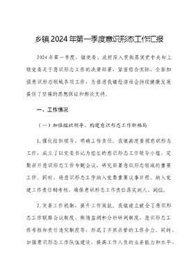 乡镇2024年第一季度意识形态工作汇报2024年第一季度,镇党委、政府深入贯彻落实党中央和上级党委关于意识形态工作的决策部署,紧密结合实际,全面加强意识形态领域各项工作,为推进我镇经济社会持续健康发展提供了坚强的思想保证和舆论支持。一、工作情况(一)加强组织领导,构建意识形态工作新格局1.强化组织领导,明确工作责任。我镇高度重视意识形态工作,成立了以党委书记为组长的意识形态工作领导小组,定期召开意识形态工作专题会议,研究部署意识形态领域的重要工作。同时,将意识形态工作纳入党委重要议事日程,纳入党建工作责任制考核,确保意识形态工作责任落实到人、到位。2.完善工作机制,提升工作效能。我镇建立健全了意识形态工作联席会议制度、舆情监测和分析研判制度、意识形态工作考核和责任追究制度等,形成了齐抓共管的工作合力。同时,加强意识形态工作队伍建设,提高工作人员的业务能力和水平,确保意识形态工作的高效运转。(二)深化理论学习,筑牢思想防线1.深入推进主题教育成果转化。我镇坚持把学习贯彻XXX新时代中国特色社会主义思想主题教育成果转化作为首要政治任务,通过党委中心组学习、党课、专题研讨等形式,组织党员干部深入学习党的最新理论成果和方针政策,不断增强党员干部的政治敏锐性和鉴别力。2.加强思想政治工作。我镇注重发挥思想政治工作的优势,通过举办座谈会、谈心谈话等方式,及时了解党员干部的思想动态,帮助他们解决实际困难和问题,增强他们的凝聚力和向心力。(三)加强舆论引导,营造良好氛围1.强化正面宣传引导。我镇充分利用各种媒体平台,积极宣传党的路线方针政策,传播正能量,弘扬社会主义核心价值观。同时,加强对重大事件、热点问题的舆论引导,及时回应社会关切,维护社会稳定。文可居文库——海量学习资料,手机电脑均可下载www.wenkeju.com2.加强网络意识形态工作。我镇高度重视网络意识形态工作,建立健全网络舆情监测和处置机制,加强对网络舆情的分析研判和预警处置。同时,加强网络评论员队伍建设,提高网络舆论引导能力,确保网络空间清朗。(四)推进文化建设,丰富群众精神生活1.加强文化设施建设和管理。我镇投入资金建设了一批文化设施,包括图书馆、文化活动中心、村级文化活动室等,为群众提供了良好的文化活动场所。同时,加强文化设施的维护和管理,确保其正常运行和发挥作用。2.举办丰富多彩的文化活动。我镇定期举办各类文化活动,如文艺演出、书画展览、体育比赛等,丰富群众的精神文化生活。同时,注重将文化活动与意识形态工作相结合,通过文化活动传播正能量,提升群众的思想觉悟和文化素养。二、存在问题及改进措施虽然我镇在意识形态工作方面取得了一定成绩,但也存在一些问题和不足。主要表现在:一是部分党员干部对意识形态文可居文库——海量学习资料,手机电脑均可下载www.wenkeju.com工作的重要性认识不足,重视程度不够;二是意识形态工作队伍建设还需加强,业务能力有待提高;三是网络意识形态工作面临新的挑战和考验。针对以上问题,我镇将采取以下措施加以改进:一是进一步加强宣传教育,提高党员干部对意识形态工作的认识;二是加强意识形态工作队伍建设,提高工作人员的业务能力和水平;三是加强网络意识形态工作,完善网络舆情监测和处置机制,提高网络舆论引导能力。三、下一步工作计划意识形态工作是一项长期而艰巨的任务,需要我们持续用力、久久为功。我镇将继续以高度的政治责任感和使命感,认真贯彻落实党中央和上级党委关于意识形态工作的决策部署,不断创新工作方法,提高工作水平,为推动镇经济社会持续健康发展提供坚强的思想保证和舆论支持。在今后的工作中,我镇将进一步加强与上级部门的沟通联系,及时汇报工作进展和存在的问题,积极争取上级的支持和文可居文库——海量学习资料,手机电脑均可下载www.wenkeju.com指导。同时,加强与兄弟乡镇的交流合作,共同探索意识形态工作的新思路、新方法,推动意识形态工作再上新台阶。文可居文库——海量学习资料,手机电脑均可下载www.wenkeju.com