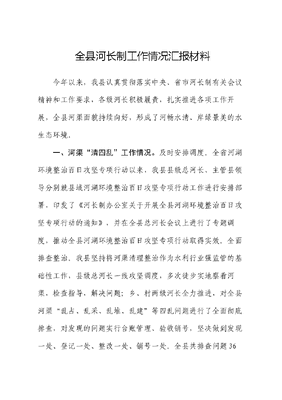 全县河长制工作情况汇报材料今年以来,我县认真贯彻落实中央、省市河长制有关会议精神和工作要求,各级河长积极履责,扎实推进各项工作开展,全县河渠面貌持续向好,形成了河畅水清、岸绿景美的水生态环境。一、河渠清四乱工作情况。及时安排调度。全省河湖环境整治百日攻坚专项行动以来,我县县级总河长、主管县领导分别就县域河湖环境整治百日攻坚专项行动工作进行安排部署,印发了《河长制办公室关于开展全县河湖环境整治百日攻坚专项行动的通知》,并在全县总河长会议上进行了专题调度,推动全县河湖环境整治百日攻坚专项行动取得实效。全面排查整治。我县坚持将河渠清理整治作为水利行业强监管的基础性工作,县级总河长一线攻坚调度,多次徒步实地察看河渠,检查指导,解决问题;乡、村两级河长全力推进,对全县河渠乱占、乱采、乱堆、乱建等四乱问题进行了全面彻底排查,对发现的问题实行台账管理、验收销号,坚决做到发现一处、登记一处、整改一处、销号一处。全县共排查问题36个,已全部整改到位;共清理垃圾和打捞漂浮物500余方,清理河渠内树障300余棵,动用挖掘机、铲车等机械150余台次,动用各类车辆200余台次,出动人员400余人次。二、河长云APP开展巡河情况。我县坚持将河长云APP信息平台管理工作作为重要督办手段,倒逼各级河长严格落实巡河制有关规定,认真履职,扎实开展巡河工作。为保证巡河率,我们实行了每周一通报、每月一汇总制度,对于巡河率落后的乡镇和河长及时进行通报、约谈和处罚,确保各级河长充分履行河长责任。通过全县各级河长共同努力,今年以来我县三级河长巡河率多次达到100%,位次均处于全市前列。三、河湖长效管护机制创新执行情况。一方面,为深入推进河长制和河渠坑塘管理工作,我县研究出台了新的河渠常态化管护机制,每年投资190万元,实施了城乡环卫一体化项目,将全县河渠坑塘全部纳入其中,实行市场化运作,交由第三方公司常态化管护,并且制定了严格的百分考核办法,确保工作成效,持续提升河湖环境卫生水平。城乡环卫一体化项目运行以来,探索形成了公司日常清运、河长常态监管、考核挂文可居文库——海量学习资料,手机电脑均可下载www.wenkeju.com钩资金的工作机制,取得了良好成效。另一方面,结合河长制,实施了多项河道治理工程,持续提升河渠整体水平。今年重点实施了X生态修复提升工程、X治理工程、X水生态修复工程和X防洪排涝工程,目前各项工程正在有序推进,投用后将进一步提升河道行洪能力和沿线绿化景观层次。四、下一步工作安排。下一步我们重点将抓好以下工作:一是严格落实常态化巡河制度,县、乡、村三级河长按照工作要求,持续开展巡河活动,发现问题及时解决。二是积极开展宣传教育,充分利用电视广播、明白纸、村内大喇叭等多种形式,开展宣传教育活动,激发广大群众尤其是河渠沿线群众参与河渠保护、水环境保护的积极性和责任感,为河长制工作营造良好的工作氛围。三是加大执法力度,充分发挥河湖警长的作用,抓住反面典型,依法处理、公开曝光,起到打击一个,教育一片的效果。同时,逐步完善部门联合执法机制,协调检察、公安、综合执法、农业农村、住建、生态环境等有关部门及乡镇,按照有关法律法规,严格执法,加大查处力度,严厉打击涉河违法行为。四是积极争取上级资金,加大河道工程建文可居文库——海量学习资料,手机电脑均可下载www.wenkeju.com设力度,以项目建设促进河渠环境持续提升。五是对照河长制考核指标,认真分析,抓紧补齐短板,确保在考核中不丢分,取得好的位次。文可居文库——海量学习资料,手机电脑均可下载www.wenkeju.com