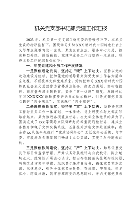 机关党支部书记抓党建工作汇报2023年,机关第一党支部在局党委的坚强领导下,在机关党委的指导监督下,围绕学习贯彻XXX新时代中国特色社会主义思想主题教育这一主线,聚焦主责主业、服务中心大局,推进转型升级、提质强能,党建和业务工作均取得一定成绩。现将主要工作述职报告如下:一、年度党建和业务工作开展情况一是聚焦理论武装,坚持在硬上下功夫。坚持以党的政治建设为统领,把加强党的领导贯穿到党支部工作各方面和全过程,不断提高支部党建质量。始终把学习XXX新时代中国特色社会主义思想作为首要政治任务,高起点谋划、高标准推进、高质量开展主题教育,坚持第一议题制度,及时传达学习XXXXXX最新重要讲话指示批示精神,引导支部党员衷心拥护两个确立、忠诚践行两个维护。二是聚焦责任落实,坚持在实上下功夫。坚持将党建工作与业务工作一体谋划、一体推进,将上级要求与支部实际结合起来,努力推进各项重点任务。在支部全体党员的努力下,圆满完成了xxx等领导来队调研慰问等重要迎检任务;建成业务信息和电子文件交换系统,显著提升涉密文件处理效率;在全省xx队伍率先推行党政协同办公无纸化办公系统,与市委、市政府及各市直部门畅通了办公渠道,实现了对外高效运转。三是聚焦作风建设,坚持在严上下功夫。始终注重党员干部日常监督管理,严肃认真开展批评与自我批评,防止蜻蜓点水。经常性开展谈心谈话,指出存在的苗头性倾向性问题,明确改进方向和举措。组织签订廉洁责任书,强化党员党章意识、纪律意识,引导全体党员知敬畏、存戒惧、守底线,抓早抓小、防微杜渐,筑牢拒腐防变的思想防线。年内支部党员未发生违法违纪事故,也未发生因工作失职影响局整体工作的事件。二、存在的问题对照上级要求和指战员期盼,机关第一党支部主要有以下几方面问题不足:一是党员教育管理还有一定差距。对党的理论学习重要性认识不够,还没有真正把学习党的创新理论作为坚定理想、筑牢信念的重要途径,有时学习仅仅停留在一知半解、浅尝辄止上。支部平时忙于业务工作,对党建工作主动思考较少,被动应付更多,创新的举措和办法不多,在支部建设、党员学习教育管理等方面取得的效果还不明显二是党建与业务融合创新做的不够。面对改制转隶不断向纵深推进的新形势,支部还没有打破惯常模式、突破固化套路,缺乏将党建工作和业务工作深度融合的有效方法,工作上仍满足于完成党建工作的规定任务,存在把党建工作片面等同于党务工作的认识偏差。比如,在推动局各级战勤保障体系建设、提升办文办会水平等方面,还是缺乏先行先试、久久为功的干劲韧劲,自我革新、自我超越的精神和勇气仍然不足。三是党员先进性作用发挥不够充分。个别党员在困难和矛盾面前,缺乏开放性、发散性思维,思路不清晰,反映不敏锐,还不能用创新精神去面对、分析和寻找解决问题的最佳办法,支部党员创先争优、先锋模范作用发挥不够,没有形成看齐先进典型的浓厚氛围,作风和能力建设有待进一步加强。三、下一步改进提升措施一是持续强化政治统领。进一步发挥基层党组织在业务工作中的战斗堡垒作用和党员先锋模范作用,坚持理论联系实际,在干中学、学中干,融会贯通、学以致用,坚持从基本制度、基本活动、基本内容抓起,认真落实三会一课、谈心谈话等制度,增强组织生活严肃性,不断提升运用科学理论分析和解决实际问题的能力,切实增强四个意识、坚定四个自文可居文库——海量学习资料,手机电脑均可下载www.wenkeju.com信,做到两个维护。二是持续强化责任担当。坚持把支部各项工作放到机关、局工作大局中谋划,克服本位主义思想,增强忧患意识,坚持底线思维,做到矛盾面前不躲闪、挑战面前不畏惧,困难面前不退缩,引导局各级立足岗位实际,全力以赴提升行政运行效率、办文办会水平和战勤保障能力。三是持续强化作风建设。坚持把各项党纪党规作为不可逾越的底线和红线,以《党章》《准则》《条例》为准绳,教育引导支部全体党员勤对照、常检查,切实让党的纪律在支部全体党员的脑中扎根、心中刻印,严肃认真过好党内政治生活,用好用活批评和自我批评武器,坚决维护风清气正的政治生态。述职完毕,如有不妥之处,请上级领导和同志们批评指正。文可居文库——海量学习资料,手机电脑均可下载www.wenkeju.com