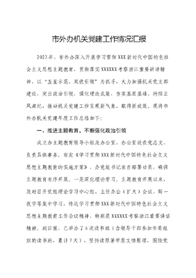 市外办机关党建工作情况汇报2023年,市外办深入开展学习贯彻XXX新时代中国特色社会主义思想主题教育,贯彻落实XXXXXX考察浙江重要讲话精神,以五星示范、双优引领为抓手,大力加强机关党支部建设,突出政治引领,强化理论武装,夯实基层基础,持续正风肃纪,推动机关党建工作呈现新气象、取得新成效。现将市外办机关党建年度工作总结如下:一、推进主题教育,不断强化政治引领成立办主题教育领导小组及办公室,办公室设在党总支,负责具体事务。印发《学习贯彻XXX新时代中国特色社会主义思想主题教育的实施方案》,办党组书记亲自部署动员,确保主题教育有序开展。一是深化理论学习。主题教育开展以来,及时召开党组理论学习中心组、主任办公(扩大)会议、周一夜学等集中学习,传达学习贯彻XXX新时代中国特色社会主义思想主题教育工作会议精神,特别是XXXXXX考察浙江重要讲话精神。到目前,已举办了6次读书班(含领导干部参加市委组织的读书班,累计7天),坚持读原著学原文悟原理,围绕党的XXX报告、党章、《XXXXXX著作选读》《XXX新时代中国特色社会主义思想专题摘编》等内容,溯源学习XXXXXX在浙江工作期间提出的外事三大品牌和关于外事工作的重要指示批示精神,用好《XXX外交思想学习纲要》《XXXXXX外交演讲集》(第一、二卷)等与外事工作紧密相关的特色教材,推动党员干部在重温XXXXXX重要论述中体悟新思想的真理内核。班子成员上党课4次,机关党支部书记上党课2次。二是大兴调查研究。按照上级要求,特别是围绕XXXXXX在浙江考察时的重要讲话精神,结合地方外事工作面临的新形势和新任务,结合服务保障我市三个一号工程,结合具体工作中如何防范政治风险、拓展五个外事工作内容等,办领导每人领题,撰写调研课题5个。11月27日,召开主题教育调研成果交流会。三是奋力推动发展。全力保障亚运。认真履行市亚运会外事礼宾组牵头单位职责,成立市外办亚运工作专班,形成一办三组工作架构,梳理综合协调、礼宾保障、应急处突、住宿点保障等四大服务场景任务清单。加快走出去步子。锚定集成电路、生物医药、高端制造等领域,简化经贸类出访审批程文可居文库——海量学习资料,手机电脑均可下载www.wenkeju.com序,服务团组走得快走得顺。截止11月底,全市共审批各类因公出访团组129批478人,助力对接经贸项目200余个,出访成效显著。加大引进来力度。创新举办2023*(上海)国际推介会,是我市境内举办的首届国际推介会,邀请20余个国家外国驻沪总领事、7家外国驻华机构商务代表、香港特区驻沪办以及在沪越商代表、涉外企业代表共120人参加,重点推介我市会展业、投资环境以及古城保护利用情况,展示城市发展新貌,吸引国际目光。今年以来,接待来访团组20批近200人次。四是深入检视整改。结合我办工作实际,针对深入基层调研反映出的问题进行梳理,形成了APEC商务旅行卡办理难、与外国驻沪总领馆交流不够、与国际友城交往不顺畅等3个具体问题,制定问题清单,明确整改措施、时限和责任人。深化政治检视、党性体检开展检视整改,坚持边学习、边对照、边检视、边整改。到12月,3个具体问题已经销号。二、强化政治建设,履行党建主体责任一是坚持正确的政治方向。在党组会议上研究部署2023年全面从严治党和党风廉政建设工作、2023年机关党建工作及文可居文库——海量学习资料,手机电脑均可下载www.wenkeju.com2023年意识形态工作等。二是发挥关键少数作用。深入实施三级书记抓党建工作责任清单,切实扛起抓好基层党建的责任担当,认真落实各级党组织第一责任人的主体责任,指导督促基层党组织履行党建主体责任,层层传导责任,层层压实责任。三是联合市公安局出入境管理局、X文理学院和浙江越秀外国语学院等单位打造涉外服务党建联建品牌,以机关党组织为主体探索建立多跨组团式党建联建,推动联建单位组织共建、资源共享、活动共办、发展共促、品牌共塑,更好共同服务在绍外国人。四是及时调整基层组织力量。因办领导调整,办党总支及时向机关工委报告,调整了总支书记。三、突出工作重点,加强基层组织建设一是做好三会一课工作。定期召开支部党员大会、支委会,办领导每人都给大家上了一堂党课,2位党支部书记也上了党课。6月26日,办主要领导上《学思践悟XXX外交思想、推动外事工作成为我市对外开放的重要抓手》的党课。二是认真组织每月主题党日活动。如,2月6日,召开廉政专题教文可居文库——海量学习资料,手机电脑均可下载www.wenkeju.com育主题党日活动;4月7日,赴湖州安吉,开展追寻XXXXXX足迹的主题党日活动;9月18日,开展作风建设专题教育主题党日活动;10月19日,开展循迹