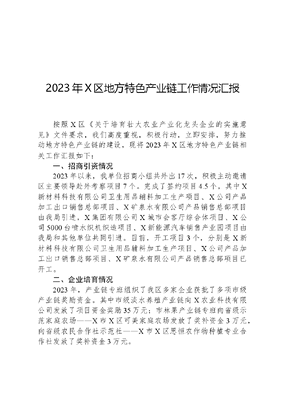 2023年X区地方特色产业链工作情况汇报按照X区《关于培育壮大农业产业化龙头企业的实施意见》文件要求,我们高度重视,积极行动,立即安排,努力推动地方特色产业链的建设,现将2023年X区地方特色产业链相关工作汇报如下:一、招商引资情况2023年以来,我单位招商小组共外出17次,积极主动邀请区主要领导赴外考察项目7个。完成了签约项目4.5个,其中X新材料科技有限公司卫生用品辅料加工生产项目、X公司产品加工出口销售总部项目、X矿泉水有限公司产品销售总部项目由我局引进,X集团有限公司X城市会客厅综合体项目、X公司5000台喷水织机织造项目、X新能源汽车销售产业园项目由我局和其他单位共同引进。目前,开工项目3个,分别是X新材料科技有限公司卫生用品辅料加工生产项目、X公司产品加工出口销售总部项目、X矿泉水有限公司产品销售总部项目已开工。二、企业培育情况2023年,产业链专班组织了我区多家企业获批了多项市级产业链奖励资金。其中市级淡水养殖产业链向X农业科技有限公司发放了项目资金奖励35万元;市林果产业链专班向省级示范家庭农场——X市X区可美家庭农场发放了奖补资金3万元,向省级农民合作社示范社——X市X区思恒农作物种植专业合作社发放了奖补资金3万元。三、相关产业链产销情况林果产业链产销情况:我区林果产业链龙头企业为X市X区思恒农作物种植专业合作社、一道弯种植专业合作社、X市X区可美家庭农场。思恒合作社2023年冬桃种植面积约五千多亩。亩产1500斤。大小果平均价3块5每斤,每亩收入约5250元,思恒合作社去年通过线上小程序、微信、线下销售等方式进行,实现年销售额约为2亿多。一道弯合作社梨种植面积达1700亩,2023年共上市800亩,产量共100万斤,年销售额约300万。可美家庭农场以软籽石榴、黄桃、梨、猕猴桃为主,共有种植面积150亩,通过线上第三方平台,线下进超市进市场等渠道进行销售,年销售额约为100多万淡水养殖产业链产销情况:我区淡水养殖产业链龙头企业为X农业科技有限公司、X生态农业科技发展有限公司。富铭达公司产品以南美对虾、鱼类以及鱼苗为主,销往湖北、河南、贵州、四川等地,年销售额约为2500万元;鲜之润公司产品以鲈鱼等鱼类、鱼苗、虾苗为主,销往X周边等地,年销售额约为800万元。四、其他工作推进情况(一)制定方案,明确产业链方向。2023年我们通过深入基层、深入项目、实地走访,先后对我区淡水养殖产业链发展情况进行了多次调研,在理清产业发展思路的基础上,制定了《X区地方特色产业链2023年工作方案》,明确了淡水养殖产业的发展方向、发展目标、发展路径、发展措施。(二)直播带货,提高产品知名度。2023年618电商节来临之际,为抓住618电商促销宣传机遇,更好宣传X人文资源,展示X良好形象,扩大X农副产品知名度,我们邀请了有1300万粉丝的快手达人尘客团队来我区开展助农直播及文旅宣传活动。6月10日上午,主播尘客在鹿门山国家森林公园开启了直播宣传,进一步擦亮了田园诗乡凤鸣X城市名片;6月10日晚-11日晚,主播尘客为我区特色产品进行了直播带货,重点文可居文库——海量学习资料,手机电脑均可下载www.wenkeju.com介绍了我区牛肉面,淡水产品、艾草产品等特色产品,提高了我区特色产品知名度。(三)加大服务,支持产业链发展。2023年产业链专班在整合全区政策资源方面发挥了重要作用,通过汇聚各方工作合力,为企业提供了全方位的政策支持和服务保障。我们以店小二的服务理念,积极为企业解决实际问题,推动产业链的健康发展。一是X镇级为冬桃种植农业合作社发放提档升级奖励资金16000元;二是X区农业农村局为华优黑金猕猴桃种植园冷链保鲜设施项目发放了奖补资金99750元。三是开展X区地方特色产业链奖补资金项目申报。产业链专班组织开展了X区淡水养殖产业链奖补资金项目申报工作,经X会计师事务审计,10家企业符合相关补贴标准,核定申报金额共计200万元。(四)打造项目,夯实产业链基础。2023年为了推动我区淡水产业的发展,提升其竞争力和产值,产业链专班积极推动相关企业进行新项目的开发。其中,X生态农业科技发展有限公司、X农业科技有限公司在这方面做出了显著的贡献。X生态农业科技发展有限公司改建了150亩的生态环保高效标准化小龙虾精养鱼池,实现了亩产小龙虾200-250kg,混养鱼类产量200-300kg/亩。这一举措不仅提高了小龙虾和鱼类的产量,也为养殖户带来了丰厚的收益。据统计,该公司实现产销小龙虾30吨,优质鲈鱼40吨、小龙虾及优质鱼苗种0.5亿尾。这些产品的销售带动了项目区100多养殖户共同致富,人均增收逾3000元。X农业科技有限公司积极引进新的设备和技术,以提升生产效率和产品质量。2023年该公司新增投饵机、水车式增氧机、曝气增氧