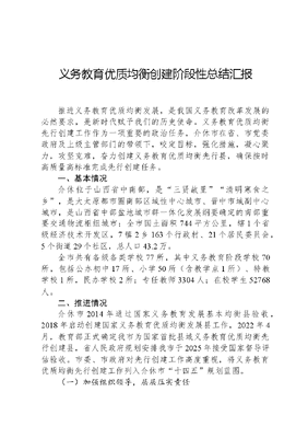 义务教育优质均衡创建阶段性总结汇报推进义务教育优质均衡发展,是我国义务教育改革发展的必然要求,是新时代赋予我们的历史使命。义务教育优质均衡先行创建工作作为一项重要的政治任务,介休市在省、市党委政府及上级主管部门的带领下,咬定目标,强化措施,凝心聚力,攻坚克难,奋力创建义务教育优质均衡先行县,确保按时高质量高标准完成先行创建任务。一、基本情况介休位于山西省中南部,是三贤故里清明寒食之乡,是大太原都市圈南部区域性中心城市、晋中市域副中心城市,是山西省中部盆地城市群一体化发展纲要确定的南部重要交通物流枢纽城市;全市国土面积744平方公里,辖1个省级经济技术开发区,7镇2乡163个行政村、21个居民委员会,5个街道29个社区,总人口43.2万。全市共有各级各类学校77所,其中义务教育阶段学校70所,包括公办初中17所、小学50所(含教学点1所)、特教学校1所,民办学校2所;专任教师3304人;在校学生52768人。二、推进情况介休市2014年通过国家义务教育发展基本均衡县验收,2018年启动创建国家义务教育优质均衡发展县工作,2022年4月,教育部正式确定我市为国家首批县域义务教育优质均衡先行创建县,省人民政府规划安排我市于2025年接受国家督导评估验收。市委、市政府对先行创建工作高度重视,将义务教育优质均衡先行创建工作列入介休市十四五规划蓝图。(一)加强组织领导,层层压实责任市委、市政府成立了由市委书记、市长任双组长,分管教育的副市长任副组长,相关职能部门负责人为成员的创建工作领导小组;制定了《介休市义务教育优质均衡发展创建工作实施方案》,明确了相关职能部门的工作职责及创建任务;召开了推进县域义务教育优质均衡发展创建工作动员大会,部署创建工作任务,要求各职能部门统一认识、协力推进,坚决完成县域义务教育优质均衡先行创建工作。市教育局成立创建工作专班,强化统筹协调、组织推动、督导落实和宣传引导;组织精研义务教育优质均衡发展相关文件、标准及要求,对照义务教育优质均衡发展的四个方面32项指标细化分工,成立了由局班子成员、督学、各职能股室和70个义务教育阶段学校校长组成的指标分工领导组和包校领导组。各组下沉基层,逐校逐项督查指导,要求各校一校一策,清底数、建台账,逐项销号,确保实现校校达标、项项达标,高质量通过国家义务教育优质均衡验收。(二)深入调查研究,查找弱项短板市委书记任光耀,市委副书记、市长魏鹏耀,副市长冀鹏俊等领导多次深入学校、实地查看、现场办公,研究解决我市义务教育学校办学条件中存在的问题。市教育局组织指标分工领导组和包校领导组,严格对照国家《县域义务教育优质均衡发展督导评估办法》中的32项指标,逐校逐项对标摸排,结果表明,我市创建工作的突出问题主要表现在城区学校的生均教学及辅助用房面积、生均运动场馆面积和音乐、美术教室使用面积不达标;网络多媒体教室配备未全部达标;教职员工还存在短缺,尤其是体艺专业教师比例不达标。(三)精准分析研判,明确工作重点1.持续优化学校布局。(1)新建城区学校,增加学位供给,逐步化解大班额大校额问题。在2021年、2022年分别建成启用金融路小学、汾秀学校的基础上,2023年,我们积极推动新建介公路学校、文可居文库——海量学习资料,手机电脑均可下载www.wenkeju.com崇文小学、绵山墅小学3所交钥匙工程开工建设,确保2024年9月全部顺利投用,彻底解决城区学位紧张导致的大班额大校额问题。(2)改扩建农村寄宿制学校,稳固农村生源,有效缓解城区学位压力。在三佳小学扩建工程2021年竣工投用后,我市结合乡村振兴战略和人民群众的现实需求,确定了位于城乡结合部的宋古二中和地处乡镇中心的义安三小、连福一中共3所农村寄宿制学校实施改扩建工程,努力为农村寄宿制师生打造安全、舒适、温馨的就餐和住宿环境。3个改扩建工程于2022年顺利启动,其中:宋古二中、义安三小项目于2022年11月开工建设。2023年我们将积极推动3所学校改扩建工程全部完工并投入使用。(3)提质改造现有义务教育阶段学校,改善办学条件,统筹城乡一体化发展。过去两年,全市累计投入2000余万元完成了19所农村薄弱校改造、33所学校维修改造、12所学校厕所改造工程;2023年-2024年,按照先农村后城区的顺序全面改善全市义务教育阶段学校硬件设施条件,亮化、美化校园环境,为师生提供更加舒适、温馨的学习和生活环境,将分阶段实施乡村温馨校园建设和校舍、功能室、运动场提质改造工程,待2024年城区新建学校投用后,完成现有城区学校功能室等基础设施的恢复改造工程。2.均衡配置师资队伍。2021年和2022年,我市累计招聘教师247名,补充优化了师资队伍;交流轮岗校长、教师356名,促进了城乡、校际师资均衡。