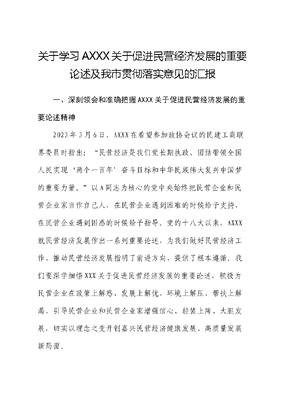 关于学习AXXX关于促进民营经济发展的重要论述及我市贯彻落实意见的汇报一、深刻领会和准确把握AXXX关于促进民营经济发展的重要论述精神2023年3月6日,AXXX在看望参加政协会议的民建工商联界委员时指出:民营经济是我们党长期执政、团结带领全国人民实现两个一百年奋斗目标和中华民族伟大复兴中国梦的重要力量。以A同志为核心的党中央始终把民营企业和民营企业家当作自己人,在民营企业遇到困难的时候给予支持,在民营企业遇到困惑的时候给予指导。党的十八大以来,AXXX就民营经济发展作出一系列重要论述,为我们做好民营经济工作、推动民营经济发展指明了前进方向、提供了根本遵循。我们要深学细悟XXX关于促进民营经济发展的重要论述,积极为民营企业在政策上解惑、发展上解忧、环境上解压、帮扶上解渴,引导民营企业和民营企业家增强信心、轻装上阵、大胆发展,切实以理念之变开创嘉兴民营经济健康发展、高质量发展新局面。(一)正确认识民营经济的地位和重要性。民营经济在推动经济社会发展的过程中发挥了重要作用,AXXX以五六七八九(即民营经济贡献了50%以上的税收,60%以上的国内生产总值,70%以上的技术创新成果,80%以上的城镇劳动就业,90%以上的企业数量)高度概括和充分肯定了民营经济的重大贡献;用四个重要(即民营经济是社会主义市场经济发展的重要成果,是推动社会主义市场经济发展的重要力量,是推进供给侧结构性改革、推动高质量发展、建设现代化经济体系的重要主体,也是我们党长期执政、团结带领全国人民实现两个一百年奋斗目标和中华民族伟大复兴中国梦的重要力量)强调了民营经济的重要地位和作用,指出我国民营经济只能壮大、不能弱化,不仅不能离场,而且要走向更加广阔的舞台;AXXX强调,要引导民营企业和民营企业家正确理解党中央关于两个毫不动摇(即毫不动摇巩固和发展公有制经济,毫不动摇鼓励、支持、引导非公有制经济发展)、三个没有变(即非公有制经济在我国经济社会发展中的地位和作用没有变,我们毫不动摇鼓励、支持、引导非公有制经济发展文可居文库——海量学习资料,手机电脑均可下载www.wenkeju.com的方针政策没有变,我们致力于为非公有制经济发展营造良好环境和提供更多机会的方针政策没有变)、两个健康(即非公有制经济健康发展和非公有制经济人士健康成长)的方针政策,消除顾虑,放下包袱,大胆发展。这些重要论述充分体现了AXXX对民营企业的重视、关心和厚爱,是重大理论和实践创新,是A新时代中国特色社会主义经济思想的丰富发展。(二)正确认识民营经济发展面临的困难及其本质。AXXX坚持问题导向,由表及里,辩证分析,为民营企业家经营和发展问诊把脉,针对民营企业在经营发展中遇到的市场的冰山、融资的高山、转型的火山,指出这些困难和问题的成因是外部因素和内部因素、客观原因和主观原因等多重矛盾问题碰头的结果,是发展中的困难、前进中的问题、成长中的烦恼,一定能在发展中得到解决。AXXX把民营经济发展中遇到的困难摸透了、症结说清了、药方开准了,并在多种场合为民营企业发展加油鼓劲,极大坚定了民营企业家迎难而上、攻坚克难的信心和决心。文可居文库——海量学习资料,手机电脑均可下载www.wenkeju.com(三)正确认识民营经济面临的新机遇和新要求。AXXX从发展韧性、发展条件等6个方面深刻分析了民营经济发展面临的有利条件,强调只要我们保持战略定力,坚持稳中求进工作总基调,以供给侧结构性改革为主线,全面深化改革开放,我国经济就一定能够加快转入高质量发展轨道,迎来更加光明的发展前景。近期,中共中央、国务院专门出台政策,从6方面、31条全面部署促进民营经济健康发展、高质量发展的路径和举措。随后,又作出在国家发展改革委设立民营经济发展局的重大决策部署,这些密集的动作都在释放国家层面支持民营经济、大力发展民营经济的强烈信号。只要我们沿着XXX指引的方向奋力前行,善于把握住时与势,因时而变,就一定能危中寻机、化危为机,催生发展新动能,开辟发展新境界。二、我市促进民营经济发展工作推进情况和存在问题民营经济是x高质量发展的重要基础,在稳定增长、促进创新、增加就业、改善民生等方面发挥了积极的作用。近年来,我市认真贯彻落实AXXX关于民营经济发展的重要论述精神,一以贯之为民营企业发展创造条件、优化服务、厚植沃土,促进文可居文库——海量学习资料,手机电脑均可下载www.wenkeju.com民营经济做大做优做强,民营经济综合实力稳步提升,高质量发展特征不断呈现。(一)经济总量持续增长。20x年,全市民营经济占GDP比重达到68%,对经济增长的贡献率达到76%,有6家企业上榜中国民营企业500强榜单,13家企业上榜2022浙江民营企业研发投入100强榜