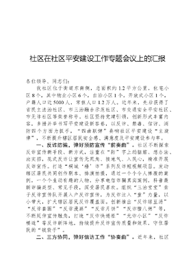 社区在社区平安建设工作专题会议上的汇报各位领导、同志们:我社区位于街道东南侧,总面积约1.2平方公里,住宅小区8个,其中物业小区6个,自治小区1个,开放式小区1个,户籍人口近5000人,常住人口1.2万人。近年来,先后获得了省民主法治社区、市三治融合示范社区、市交通安全平安社区、市无诈社区等荣誉称号。社区坚持党建引领,创新形式丰富内容,多措并举书写平安建设新答卷,以反诈、禁毒、信访、消防四个方面为抓手,四曲联弹奏响社区平安建设主旋律,不断提升辖区居民安全感、满意度及平安建设参与率。一、反诈防骗,弹好预防宣传前奏曲。社区不断探索反诈宣传新手段、新方式,注重在防字上动脑筋、想办法、出实招,花式反诈让宣传无死角、接地气、入民心,精准开展反诈宣传。打造桐城梧诈系列反诈短视频项目。发动辖区居民共同创作剧本、排演拍摄,通过一个个令人捧腹的案例,一个个生动有趣的人物,分享电信诈骗真实案例,科普最新诈骗类型、常见手段,深受居民喜欢。组织三治宝宝亲子反诈宣传队开展入户反诈宣传,为反诈注入童力量,以小带大,扩大辖区居民反诈覆盖面。创新推出反诈绿豆汤反诈套圈反诈漫画反诈月饼反诈腊八粥等,不断延伸宣传触角,打造反诈快递柜无诈小区反诈楼道等反诈新阵地,持续提升反诈宣传质量和效果,守住居民的钱袋子。二、三方协同,弹好信访工作协奏曲。近年来,社区把解决信访问题作为工作重点,依托于乐乐之声民情直通车,采取有效措施化解信访问题,着力把居民合理诉求在第一时间解决,切实做好信访维稳工作。通过创新建立乐乐之声三方协同共治工作机制,由社区党组织牵头,联合小区红色业委会、物业协同赋能小区治理,凝聚三方合力,推动议事协商、化解矛盾纠纷,破解小区各类痛点难点及矛盾纠纷。在社区党组织的牵头下,经过一轮又一轮的协商沟通,顺利解决了小区树木遮光、小区童玩区塑胶地面翻新等民生问题12个,调解漏水、噪音等邻里纠纷10多起,做到为民服务有实处,按需问诊解民忧。三、禁毒护民,弹好防毒宣教进行曲。通过加强宣传教育、创新宣传模式等措施,增强居民禁绝毒品的安全意识,共同营造健康和谐无毒的良好生活环境。紧扣珍爱生命,远离毒品主题,面向辖区内居民开展针对性强、内容丰富的禁毒宣传教育活动。拍摄《珍爱生命,远离毒品》微视频,大手拉小手萌娃学禁毒走进辖区幼儿园开展禁毒科普,植树护绿正当时禁种铲毒守净土植树节禁毒林植树活动等,通过多样化的形式进行禁毒科普,号召居民践行无毒承诺。四、防范为先,弹好消防安全共鸣曲。把提升消防安全意识作为出发点,加强监督管理,防范未燃,将消防火情扼杀在摇篮。对辖区内沿街商铺、居民楼消防设施进行每月消防安全排查,开展消防知识讲座和演练;组织传承非遗倡文明剪纸窗花添平安剪纸活动,将消防融入非遗剪纸;以红领巾消防研学,致敬逆行火焰蓝为主题,组织青少年前往市消防大队参观学习,切实增强居民消防安全意识,提升消防应急处置能力,最大限度减少社区火灾发生,进一步强化社区消防安全防护网。平安不平安,居民说了算。居民对平安和幸福生活的向往永远是平安工作的风向标和指南针。下一步,社区将继续深化平安社区建设工作,持续广泛开展内容丰富、形式多样的文可居文库——海量学习资料,手机电脑均可下载www.wenkeju.com平安建设活动,织密平安网,筑牢辖区安全屏障。全面提升广大居民的安全感、满意度和幸福感,着力打造优活满分欢乐平安共享新格局。文可居文库——海量学习资料,手机电脑均可下载www.wenkeju.com