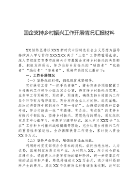 国企支持乡村振兴工作开展情况汇报材料XX始终坚持以XXX新时代中国特色社会主义思想为指导持续深入学习贯彻XXXXXX关于三农工作的重要论述,深入贯彻落实市委市政府关于市属国企支持乡村振兴的决策部署,积极发挥所长,努力当好乡村振兴的铺路者赋能者践行者答卷者,现将有关情况汇报如下:一、工作开展情况(一)坚持组织引领,强化脱贫攻坚领导。实行扶贫工作一把手负责制,健全完善并顶格配置了乡村振兴工作领导小组及其办公室,将支持乡村振兴与党建、业务等工作同研究、同部署、同推进,确保支持乡村振兴工作各个环节有力有序落实。充分发挥企业人才优势,选优派强,派出优秀管理干部到村作第一书记,加强培训锻炼和监督考核,努力打造出一批有激情、有办法、有成效的支持乡村振兴干部队伍。坚持乡村振兴、思想先行的理念,通过组织党总支中心组学习、专题学习班等形式,深入学习XXX论三农工作和乡村振兴战略摘编等理论,充分认清乡村振兴工作的重要性和紧迫性。全力保障扶贫工作资金,累计投入资金XX多万元。(二)坚持产业带动,增强扶贫造血功能。利用好村党支部领办合作社的契机,依托当地土地、人力优势,因地制宜发展本地产业,为村购入XX,用于村合作社农耕作业,提前进入小麦等作物的播种阶段,进一步提高农作物的成活率和产量,降低种植成本XX万余元,减少秸秆还田所产生的费用。其次XX不仅解决本村青储玉米收割,还可以发展租赁业务,面向周边村青储玉米收割作业,带动村集体增收XX万余元。(三)坚持以文化人,构建和谐文明乡村。坚持将文明建设作为支持乡村振兴的精神动力,坚持物质和精神两手抓,两手硬。规范村务运行,落实四议两公开,推动信用进农村工作,列入党支部议事议程,将信用建设与党员量化积分、村规民约等有机结合并张榜公布。设立村信用基金,表彰积极参加村级事务的志愿者和捐款捐物的爱心人士。每季度对诚信建设表现好的村民进行表扬奖励,进一步调动大家的积极性,提升村民文明素养。二、下一步工作计划(一)推进强村富民。依托村党支部领办合作社发展规模种植,为村合作社提供化肥,对接当地饲料厂出售农作物废料,增加村民收入。同时加强与XX的联系,邀请XX专家到村指导农业种植技术。(二)拓宽销售渠道。致力于帮助农户解决生产销售难题。由于今年生姜产量增加,销售压力较大。为此,深入生姜种植户家中,详细了解生姜品种、品质、种植面积、产量等情况,积极联系生姜收购客户,开展助农助销活动。(三)为民办事服务。①是提供就业机会。由村党支部推荐无业人员名单,经审核符合工作条件的,为其提供就业机会,减轻生活负担。②是开展走访慰问。集团公司党总支每年走访村老党员、困难党员等特殊群体至少一次,通过赠送慰问品、帮助做家务等形式,让老党员们感受到党组织的关怀和温暖。文可居文库——海量学习资料,手机电脑均可下载www.wenkeju.com
