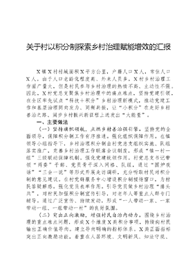 关于村以积分制探索乡村治理赋能增效的汇报X镇X村村域面积X平方公里,户籍人口X人,常住人口X人。由于人口老龄化程度高、外来人员多,X村乡村治理工作面广量大,但是村民参与乡村治理的热情不高、主动性不强。因此,X村党总支聚焦乡村治理中的痛点难点,坚持党建引领,在全区率先试点科技+积分乡村治理新模式,推动党建工作和基层治理同向发力、同频共振,让小积分在走好乡村善治之路、阔步乡村振兴新征程上迸发出大能量。一、主要做法(一)坚持旗帜领航,点燃乡村善治强引擎。坚持党的全面领导,保障积分制工作有序推进。强化组织保障作用。在镇领导小组指导下,乡村治理积分制由村党总支组织实施、队组落实推广,完善乡村治理工作联席会议制度,形成镇-村-组三级联动保障机制。强化党建统领作用。村党总支书记带领两委干部、党员骨干深入网格、队组,通过围炉夜话三会一说等形式开展走访调研,充分听取村民对积分制的意见建议。在村党群服务中心增设积分制接待窗口,为村民答疑解惑。强化党员表率作用。引导党员做乡村治理排头兵,对村民加强积分制宣传引导,对老年人等重点人群专门辅导。通过广泛宣传、持续发动,形成一人带动一家、一家带动一组、一组带动一村的良好氛围。(二)突出正向激励,增强村民自治内动力。围绕乡村治理的重点难点问题,形成X个维度X类积分事项,持续向村民输出正确价值导向。建立导向明确的指标体系。X类正面指标突出正向激励功能,着重在人居环境、文明新风、知法守规、人人参与等方面,引导村民怎么做;X类负面指标聚焦底线约束,针对涉黑涉恶等违法行为、新增违建等难点问题,进一步明确不能逾越的红线。形成简明易懂的积分标准。在积分分值上有梯度,同一类事项根据完成情况不同,给予不同分值;在评分周期上有差异,按年度、季度、月度分层设定,形成积分长效机制。建立合理兑换机制,村民已累计兑换X余万分(元)。完善因势更新的长效机制。围绕总体维度不变,事项内容动态调整的工作原则,结合为老服务、出租屋安全管理等难点重点工作,不断优化设计积分指标和分值权重,每年进行更新调整。(三)强化数字赋能,推动积分智治常态化。通过网上承诺—长期实践—获得积分,简化积分申报审批流程,调动村民的主观能动性。进行线上积分申报。依托小程序,村民可以家庭户为单位,以公约制、承诺制、审核制三种方式申报积分,针对不同事项的具体要求和评分特点差异,完成线上阅读村规民约、点击同意作出承诺、上传相关证明材料等步骤,获得相应积分。开展线上情况查询。通过实时登录小程序,村民在家即可申报、查询、兑换积分,包括查看各类事项的得分情况和积分流转记录,了解自家在组内和村内的积分排名,让数据多跑路,百姓少跑腿,为村民方便、为基层减负、为政府赋能。实现线上平台互通。村党总支参与乡村治理积分制应用场景建设,通过后台实时汇总分析积分推进情况,以可视化方式直观了解乡村治理的效果和村民的参与程度,实现村民自主申报、相关部门核定情况、后台系统整合分析的数字治理闭环。二、取得成效(一)村民自治意识明显增强。随着乡村治理积分制工作持续推进,积分制凝心聚力效能不断提升,村民自治主动性明显增强,X户村民家庭积分制参与率100%。依托微网格、议事点,村民积极讨论商议积分制内容、村规民约等事项,主人翁文可居文库——海量学习资料,手机电脑均可下载www.wenkeju.com意识得到激发,民事民议、民事民办、民事民管成为新的共识。(二)村民法治观念明显增强。通过学习法律法规获得积分,村民法治思维得到加强,以法治方式参与管理公共事务、化解矛盾纠纷、维护自身权益。比如,村民自觉落实镇出台的农村自建房租赁管理办法,租房信息登销及时准确,并参与构建农村防火网络,主动全覆盖安装室外充电设施、积极配备家庭灭火器,逐步形成政府组织、村民自治的农村消防工作新格局。(三)乡村德治成效明显增强。通过积分治理扬文明新风,村民素质逐步提升,推动乡风文明由景美向德美延伸,换新颜与焕新风共融,村民红白喜事文明承诺书签约率达X%,主动参与犬类疫苗接种率提高至X%。美丽乡村建设有序推进,村庄环境卫生持续改善,邻里矛盾纠纷明显减少,乡邻之间更加和谐友爱。三、经验启示(一)坚持一体协调推进,统筹谋划乡村振兴一盘棋坚持镇党委总揽全局,充分发挥村党组织战斗堡垒作用,将乡村治理融入乡村振兴发展大局,通过积分制充分体现党的主张、贯彻党的决定,成为镇村各项工作助推器。(二)坚持党群共同参与,充分激发村民的主人翁意识。坚持乡村治理一切为了群众,一切依靠群众,站稳群众立场,维护群众利益,发挥群众主体作用,强化组织引领、党员带动,逐步引导群众树立村庄是我家,治理靠大家的主人翁意识。(三)坚持科技创新赋能,大力提升乡村智慧治理水平。紧跟