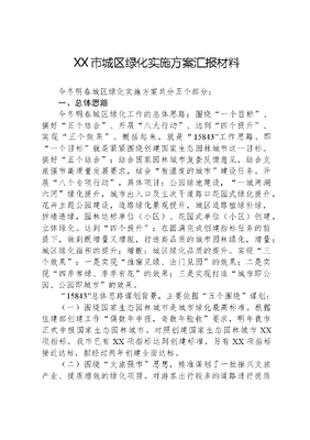 XX市城区绿化实施方案汇报材料今冬明春城区绿化实施方案共分五个部分:一、总体思路今冬明春城区绿化工作的总体思路:围绕一个目标、搞好五个结合、开展八大行动、达到四个提升、实现三个效果。概括起来,就是15843工作思路。即一个目标就是紧紧围绕创建国家生态园林城市这一目标。搞好五个结合:结合国家园林城市复查反馈意见,结合文旅强市高质量发展要求,结合有温度的城市建设任务。开展八个专项行动,具体项目:公园绿地建设,一城两湖六河绿化提升,城市出入口及主次干道路口花园式绿化提升,花卉主题公园建设,道路绿化景观提升,城区道路植绿补绿,拆墙透绿,园林达标单位(小区)、花园式单位(小区)创建,立体绿化。达到四个提升:在圆满完成创建指标任务的前提下,做到既增量又增靓,打造高品质的城市园林绿化,增量:城区绿化面积的提升;增靓:城区绿化品质的提升。实现三个效果:一是实现推窗见绿、出门见园的效果;二是实现四季常绿、季季有花的效果;三是实现打造城市即公园、公园即城市的效果。15843总体思路谋划背景,主要依据五个围绕谋划:(一)围绕国家生态园林城市是城市绿化最高标准。根据住建部创建工作偶数年申报,奇数年验收要求,明年我市正式申报国家生态园林城市。对照创建国家生态园林城市XX项指标,我市已有XX项指标达到创建标准,另有XX项指标接近达标,拟经过两年创建全面达标。(二)围绕文旅强市思想,精准谋划了一批振兴文旅产业、提质增效的绿化项目。对游客出行较多的道路进行提质改造,打造一批旅游文化精品线路。对一城两湖六河进行绿化提升,建设蓝绿交融、生态和谐、景色宜人的美丽魅力XX。(三)围绕有温度的城市建设相关要求,谋划一批绿化项目,大力开展绿化、美化、彩化、文化建设,打造城市即公园、公园即城市的优美环境使人们群众在城市绿化建设中有更多的获得感和幸福感。(四)围绕谋划建设一批花卉主题公园建设花海;开展花园式单位(小区)创建活动,建设花园;在主要道路绿化带种植月季、紫薇、海棠等花卉植物,建设花路;对道路两侧及学校医院不宜拆围墙的单位围栏进行立体绿化,种植花卉植物,建设花墙,通过打造花海、花园、花路、花墙,营造处处有花、月月见花、城在花中、人在画中独特景观,将XX建成花园之城。(五)围绕国家园林城市复查反佛问题进行谋划整改:一是本土树种栽植不到位,特别是市树国槐种植面积少;二是城市绿化特色不明显,彩化植物和花卉栽植不足、文化特色不鲜明;三是城市家俱与公园绿地融合度不高,无障碍设施和人文关怀体现不足;四是新老城区公园绿地分布不均衡;五是补齐植物园项目短板;六是林荫路覆盖率略有不足二、工作目标今冬明春计划完成新建和提升绿化面积XXX万平方米。其中新增绿地面积XX万平方米,改建提升绿化面积XX万平方米。新建、改建公园绿地XX个,河湖生态修复XX个,推进公园绿地建设X个,新建、提升主次干道及背街绿化XX条,道路补植补栽约XX万平方米,对全市XX处十字路口进行花园式建设提升,完成立体绿化XX万平方米。三、工作任务(一)开展公园绿地建设专项行动1.新建公园绿地.新建公园绿地20个,面积10.85万平方米,文可居文库——海量学习资料,手机电脑均可下载www.wenkeju.com在城区符合规划的基础上,选择面积在400至10000平方米之间的地块,建成面向公众开放:达到以人为本、功能完善、休闲游憩、健身科普、文化建园、海绵建设、环境优美标准的口袋公园2.提升公园绿地.对现有公园绿地进行补绿、补花、补设施、补文化、补人文景观等措施,实现提质增效。提升公园绿地XX个,面积XX万平方米。3.开展闲置、裸露地块绿化专项行动.经排查,我市城区共有闲置、裸露地块XX处,约XX万平方米。对符合绿地系统规划的地块进行口袋公园建设;对不符合绿地系统规划的地块进行简易绿化,实现闲置土地和裸露地块绿化全覆盖,并制定专项行动实施方案。4.加快推进XX市植物园建设工作.植物园是申报创建国家生态园林城市的必备要件,根据植物园建设标准,需要建设用地不少于300亩。目前初步设想是委托政府平台公司融资建设,建成后由投资平台公司经营。初步选址为XX集团下属XX林场内,土地性质为国有农用地,交通便利。现状已布局海棠园、樱花园、月季园、紫玉兰园等观赏花园,种植各色花草树木百余种,具备植物园建设的一定基础。项目实施主体为路通园林公司,为交建集团全资子公司,今冬开始建设,明年春季基本建成。(二)开展一城两湖六河绿化提升专项行动一城两湖六河绿化提升专项行动,提升面积XX万平方米。重点是在:一城:即环城墙,一是对开展西城墙公园绿地海绵化提升改造,共X处,面积XX万平方米。二是对环城墙公园