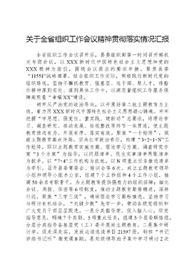 关于全省组织工作会议精神贯彻落实情况汇报全省组织工作会议召开后,县委组织部第一时间召开部机关专题会议,以XXX新时代中国特色社会主义思想和党的XXX精神为指引,围绕会议提出的要求举措,聚焦县委11551战略部署,结合组织工作实际,积极践行新时代党的组织路线,坚持不懈抓教育、强基层、选干部、聚人才,将指示精神落到实处、落到具体工作中,以高质量组织工作服务保障高质量幸福XX建设。树牢从严治党的政治导向,以开展好第二批主题教育为主线,着力用XXX新时代中国特色社会主义思想凝心铸魂。牢牢把握学思想、强党性、重实践、建新功总要求,将理论学习、调查研究、推动发展、检视整改等环节一体贯通,使主题教育推进有力、开展有序、落实有效。聚焦一个矩阵,赋能主题教育高点开局。坚决扛牢政治责任,构建3+2+1+N工作矩阵,即以主题教育实施方案、理论学习方案、调查研究方案3个方案为指导,以问题清单、民生实事清单两张清单为抓手,以7+4工作机构为依托,以N项重点任务推进清单为牵引,召开县委常委会、培训会等6次,成立主题教育领导小组和领导小组办公室,组建7个工作组和4个工作小组,抽调50余名专职骨干,为主题教育提供强有力的组织保障;细化会议、周报、保密等6项制度,推动主题教育聚势精进,深耕行远。聚焦三学三促,确保理论学习高标推进。坚持学习与研讨有机结合,关键少数先学一步,带动各级党组织和广大党员干部层层跟进。一是分类指导学,促入脑入心。印发指导意见,明确7个类别、5项重点任务,组建5个县委联络组,分层分类指导各基层党(工)委开展好主题教育。二是集中研讨学,促走深走实。发放必读选读书目21597册,制作书记讲给书记听微党课8期,县处级领导班子集中学习研讨2次各领域基层党组织集中学习研讨624次,带动其读原著、学原文、悟原理。三是培训系统学,促细思细悟。举办主题教育县级领导干部培训、各领域党支部书记示范培训覆盖460人,开展党员进党校活动覆盖4560人,党员干部工作热情更高、实招更多、成效明显。聚焦三字真诀,推动调查研究高位统筹。用好调查研究金钥匙,谋划新思路、探求新举措、寻找新办法。一是调研对象准。结合实际形成12+4+4问题公式,30名县级领导领题调研,13个单位牵头跟进,58个单位(乡镇)联动配合,制定专题调研和典型案例剖析调研方案10个,确定调研选题30个,正反典型案例10个。二是调研形式真。坚持三进三听三问,即进基层单位、进网格班组、进重大项目;听服务对象、听基层党员、听普通员工意见建议;问所期所盼、问突出问题、问工作良方,采取四不两直方式,开展解剖麻雀式调研,寻找务实管用的破解之策。三是调研方法实。建立一调研一计划一报告一制度工作机制,深化领题+破题+解题+答题工作闭环,通过一周一汇报、一月一复盘掌握调研进度,梳理总结成果,辐射带动工作。聚焦三三模式,引领推动发展高效提质。实行三三模式,以清单化、制度化推进民生实事落地生根。一是破解推动发展之困。持续开展两不一欠问题专项行动,优化三无三可营商环境,实施总投资302.3亿元的105个重点项目。借鉴新时代枫桥经验排查化解矛盾隐患37起,化解率达100%。二是兜牢保障民生之底。实施城乡供水一体化暨四化两提、城中村背街小巷硬化等项目23个,为60周岁以上老年人及特殊群体缴纳2024年基本医疗保险。三是提升巩固衔接之效。强化12项配套政策举措,整合涉农资金2.94亿元,实施项目196个,脱贫人口人均纯收入11058元,同比增长14.5%。组织驻村工作队开展立足岗位作贡献活动,为群众办实事841件、解决困难449件。树牢大抓基层的鲜明导向,以十一大行动为抓手,着文可居文库——海量学习资料,手机电脑均可下载www.wenkeju.com力完善上下贯通、执行有力的组织体系。紧扣五大振兴要求,实施十一大行动,推进抓党建促基层治理能力提升常态化,激活乡村治理高质量提效红色动能。建强组织阵地,实现有力治。运行五定十条机制,深化一堡垒五中心模式,创建示范村、达标村144个;创新543模式打造联合党建品牌2.0,建设联村党组织22个,覆盖77个村、5个企业、2个社区,实施产业项目19个,带动村级集体经济增收250.6万元;创新365模式,推动全面从严治党向基层延伸,持续净化基层政治生态,实现清廉建设与基层治理同频共振,相得益彰。抓强集体经济,实现有钱治。创建村集体三资规范化管理示范村,为推进乡村产业振兴增量提质、赋能蓄势。实施1+N+5村级集体经济发展模式,一体贯通激活人、治、物、效,集体经济20万、50万、100万元以上的村,分别达到