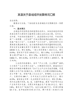 某县关于县域经济发展情况汇报各位领导:根据会议安排,下面我就X县县域经济发展情况作一简要汇报。一、基本情况县域经济是国民经济的重要组成部分,加快县域经济发展是推动现代化建设和全面建设小康社会的必由之路。近年来,在市委、市政府的坚强领导下,我县紧紧扣住市委、市政府构建一核两翼、三区协同区域发展新格局的战略机遇,深入实施振兴计划、扎实推进五大行动,始终保持专注发展转型发展战略定力,奋力推进县域经济高质量超常规发展,更好发挥X南翼发展骨干支撑作用。20X年实现地区生产总值269.81亿元,增长8.6%;一般公共预算收入10.2亿元,增长10.9%;固定资产投资105.62亿元,增长15%;社会消费品零售总额177.44亿元,增长12%;城镇居民人均可支配收入32016元,增长8.3%;农村居民人均可支配收入15593元,增长9.1%。工业经济快速增长。高举产业立县、工业强县旗帜,全力推进工业发展大会战,大健康食品医药、高端装备及新型材料制造和鞋服纺织2+1工业产业体系初具规模,实现规模工业总产值1X.58亿元,实现规上工业增加值增速11.6%,居全市第一名。培育产值上亿企业2户,新增规上工业企业17户,总数突破100户。全年完成工业投资16.73亿元、增长41.9%,增速居全市第一名,技改投资11.21亿元、增长25.4%。现代农业稳步发展。X、X、生猪和粮油、蔬菜3+2现代农业产业体系逐步完善,实现农林牧渔业总产值X1.13亿元、增长3.8%,粮食总产74.56万吨,出栏生猪139万头。标准化种植X5万亩,X种植面积突破15万亩,枫叶牧场(铁骑力士集团)1.5万头扩繁场、明兴农业国家级核心育种场全面投产;20万亩优质大米工程和10万亩优质商品蔬菜基地建设扎实推进。X大健康产业孵化园投入使用,X须根食品安全地方标准发布,成功突破药食同源。X加工产业园、铁康肉类食品精深加工产业园陆续投产。全县三品一标农产品达到95个,市级以上龙头企业总数达到59家。现代商贸提档升级。实现服务业增加值113.09亿元、增长11.5%。电商公共服务体系建设日益成熟,58个特色农产品上网销售,实现电子商务交易额1X.2亿元,网络零售额12亿元。三元菜花节、鲁班文化旅游节、综改区牡丹文化节等20个地方特色旅游节会成功举办,20X年实现旅游收入66.1亿元、增长21.22%。(二)强力提升城乡面貌,发展要素不断完善。大力推进交通大会战。完成交通建设投资X.6亿元,X西高速X段、X南高速出口至G247连接线建成通车,X南高速X互通顺利开工,中遂高速前期工作进展顺利,全县高速公路通车里程达到X1公里。S209塔山至永新段改造提升工程开工建设。四好农村路建设加快推进,建成县乡道38.6公里、产业路X公里、村道公路X0公里、社道公路325公里、村道安保工程89.9公里。目前正在对通用机场项目与X机场集团谈合作协议,同时对现首选场址与X新机场拟选场址(X场址)之间是否存在冲突进行论证。加快推进新型城镇化。宜居县城加快建设,县城常住人口达到27.8万人。中心城区控制性详细规划、60个乡镇和174个新村聚居点的规划编制全面完成。美化亮化街道25条,打通断头路2条。持续推进市容整治,整治违法建设160余宗、5.84万余平方米。统筹推进X、X等重点镇建设,积极打造X特色小镇、X小镇、郪江历史文化小镇等特色小镇。加快建设幸福宜居乡村。深入推进农村人居环境整治三年行动,创建四好村117个,改造农村土坯房62028户,建设居民聚居示范点X3个,新建乡镇污水处理厂49个(已有25个通水调试)、公共厕所939个、垃圾收集池(房)6906个,安全饮水明显改文可居文库——海量学习资料,手机电脑均可下载www.wenkeju.com善,电力电信宽带网络等实现全覆盖。(三)聚力提振民营经济,发展活力更加充沛。实现民营经济实现增加值163.3亿元、增长8.7%,占GDP比重达60.5%,完成民间投资58.2亿元,增长35.9%,年末工商部门注册登记的私营企业为5301户,增长11%,个体私营从业人员达5.96万人。高标准召开全县民营经济健康发展大会,坚决落实好X省关于促进民营经济发展20条意见、X市关于促进民营经济发展33条意见,不断优化营商环境,出台重点招商项目和重点企业服务绿卡管理办法,坚持县领导联系重点企业重点项目和服务绿卡制度,出台《X县进一步优化营商环境工作方案》《X县进一步优化营商环境任务清单》等支持政策,全面提供子女就医就学等X项绿卡服务。(四)着力深化改革开放,发展后劲明显增强。各项改革压茬推进。深化供给侧结构性改革,持续推进三去一降一补,支持传统企业优化升级,鼓励企业投资创新。纵深推进放管服改革,推广审批事项自助