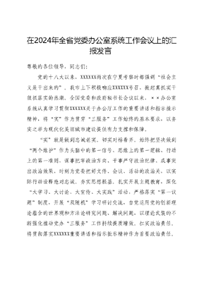 在2024年全省党委办公室系统工作会议上的汇报发言尊敬的各位领导,同志们:党的十八大以来,XXXXXX两次在宁夏考察时都强调社会主义是干出来的。我市上下积极响应XXXXXX号召,掀起真抓实干狠抓落实的热潮。全国党委和政府秘书长会议以来,××办公室系统认真学习贯彻XXXXXX关于办公厅工作的重要讲话和指示批示精神,将实作为贯穿三服务工作始终的基本要求,以务实之举为现代化美丽城市建设提供有力支撑和保障。实就是做到忠诚老实。切实对标看齐。始终把坚决做到两个维护作为头脑中的第一信号、思维上的第一逻辑、行动上的第一准则,谋事把牢政治方向、干事严守政治纪律、成事突出政治效果,时刻为党委把好文件、会议、活动的政治关,以实际行动诠释绝对忠诚。夯实思想根基。扎实开展主题教育,深化大学习、大讨论、大宣传、大实践活动,严格落实第一议题制度,开展双随机学习研讨交流,自觉运用党的创新理论蕴含的世界观和方法论研究问题、解决问题,以理论武装的不断强化推动党办三服务工作持续提质增效。扛实政治责任。将贯彻落实XXXXXX重要讲话和指示批示精神作为首要政治责任。创新制定落实XXXXXX重要讲话和指示批示精神工作机制、工作办法,深入开展大起底回头看,建立台账分工—督办落实—跟踪推进—定期报告—评估问效—回访检验全链条落实机制,确保各项工作始终沿着XXXXXX指引的方向前进。实就是做到求实务实。当好参谋部。把想大事谋大事作为发挥参谋助手作用的主攻方向,力求参到点子上、谋在关键处。服务保障市委召开全会,全面贯彻落实全国生态环境保护大会精神,制定1+1配套文件,创新建立618制度机制,决策、落实、评价、管理、考核、支撑6个方面和18项制度形成闭环,以最严格制度护航生态保护。牵头建立市委点题、班子选题、部门答题、群众评价的调研整改机制,推动一批制约高质量发展的问题得以破解,以实打实的成效回应群众期盼。当好联络部。充分发挥联系上下、协调左右作用,事前、事中事后全过程协调,当好党委总揽全局、协调各方的得力助手。对阶段性重点工作,用好四套班子秘书长联席会议等制度机制,把各方面力量统筹起来、积极性调动起来,高质高效推进落实;对常态化工作,建立月度任务清单,优化流程、紧盯落实,引领和带动各级各部门围绕市委工作同频共振、形成合力。当好执行部。充分发挥督查利剑作用,以高质量督查助推各项工作高质量落实,深化运用三察(查)一体机制,创新开展四文可居文库——海量学习资料,手机电脑均可下载www.wenkeju.com防常态化督查,督办一体、督改一体、督帮一体,推进督查工作由单兵作战向兵团作战转变,以严督实导保障工作落实。实就是做到落实真实。创新机制抓落实。探索建立抓落实5项机制、20项措施,构建公文流转一口进出、会议活动一体办理、文稿审改一人帮带、信息调研一岗对接综合服务一站到位的工作闭环,以优质服务保障市委各项工作高效落实。紧盯重点抓落实。坚决贯彻落实党中央决策部署、自治区党委工作安排,紧跟市委工作思路,聚焦五八强首府战略科学制订方案,围绕九九攻坚突破细化实化推进路径,全力以赴搭桥铺路,牵头落实的29项中央和自治区试点任务实现突破。将整治形式主义为基层减负作为一项重大政治任务,严格落实十不发文十不开会等硬措施,实现清单之外六不一下架。强化作风抓落实。扎实开展四强能力作风提升行动,将严谨细致、精益求精贯穿办文办会办事全过程,严把政治政策关、程序质量关,强化事前推演、事后复盘,总结得失、查漏补缺,用心用力把大事办好、小事办实、急事办妥、难事办成,力求每一件事都让党委放心、让人民满意。实就是做到纪律严实。抓实纪律约束。认真学习、严格执行《中国共产党廉洁自律准则》《关于新形势下党内政治生活文可居文库——海量学习资料,手机电脑均可下载www.wenkeju.com的若干准则》,全面落实中央八项规定及其实施细则精神和自治区八条禁令,工作中严格按程序、按规矩办事,该请示请示该汇报汇报、该沟通沟通。落实严管厚爱。以严管倒逼有畏,以厚爱激发有为。注重在重点工作、关键时刻、攻坚一线考察识别干部,加强提醒改进、动态调整和跟踪管理,树立工作围着发展干、干部围着发展用的鲜明导向。全方位关心关爱干部,充分理解、充分信任,落实容错纠错、澄清正名等制度,让广大党员干部干事创业心情舒畅、充满信心,积极作为、敢于担当。发言完毕,谢谢大家!文可居文库——海量学习资料,手机电脑均可下载www.wenkeju.com