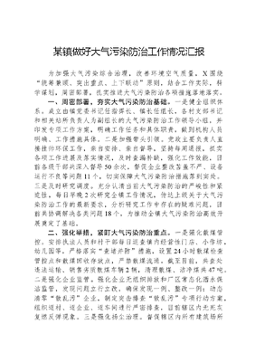 某镇做好大气污染防治工作情况汇报为加强大气污染综合治理,改善环境空气质量,X围绕统筹兼顾、突出重点、上下联动原则,结合工作实际,科学谋划,周密部署,扎实推进大气污染防治各项措施落地落实。一、周密部署,夯实大气污染防治基础。一是健全组织体系。成立由镇党委书记任指挥长、镇长任组长,各村支部书记和相关站所负责人为副组长的大气污染防治工作领导小组,并印发专项工作方案,明确工作任务和具体职责,做到机构人员明确、工作措施具体。二是加强带头引领。党政主要负责人直接挂帅环保工作,亲自安排、亲自督导,坚持每周通报,抓实各项工作进展及落实情况,及时查漏补缺,强化工作效能,目前各级干部共深入督导50余次,督促企业整改苫盖不严、设备运行不良等问题11个,切实保障大气污染防治措施落到实处。三是及时研究调度。充分认清当前大气污染防治的严峻性和紧迫性,每日早晚2次研究全镇工作情况,传达上级关于大气污染防治工作的最新要求,分析研究工作中存在的疑难问题,目前共协调解决各类问题18个,为推动全镇大气污染防治高效开展奠定了基础。二、强化举措,紧盯大气污染防治重点。一是强化散煤管控。安排执法人员和村干部每日巡查镇内经营性门店、小作坊,幼儿园等,严格落实查堵并防措施,设置24小时散煤检查管控点和散煤回收存放点,严禁散煤流通。截至目前,共查处违法运输、销售劣质散煤车辆2辆,清理散煤、洁净煤共47吨。二是强化企业监管。强化企业无组织排放和厂区常态化洒水保洁监管,发现问题立行立改,确保发现一例、整改一例;动态清零散乱污企业,制定突击排查散乱污专项行动方案,组织逐村、逐企业、逐车间进行严密排查,目前辖区内无死灰复燃反弹现象。三是强化扬尘治理。督促辖区内所有建筑场所全部落实三个禁止、六个100%要求,重污染天气应急响应期间停工、停产;全面排查辖区内的裸土裸地,已按要求苫盖11处800余㎡;X和各村主要街道等重点道路,采取严查车辆抛洒、全天候保洁、不限次洒水等措施。四是强化防火禁烧。悬挂条幅50余条,微信矩阵推送信息300余条,发放告知书2000余份,加强防火禁烧宣传;聚焦春节、清明等重点时段,安排镇村干部全天驻守,重点点位设置卡口13个,安排2辆巡逻车全域巡查,添置灭火把30把、扑火服25套、应急灯20盏,及时消除各类隐患。五是强化高值削减。划定了空气质量重点监管区,排查出区域内的工业企业、交通道路等重点污染源X个,建立了管控清单;成立工作组,收到高值推送后,第一时间安排专人现场排查,利用走航监测车动态监测,迅速查找污染源,确保2小时内削减反馈。三、严格督导,保障大气污染防治成效。一是严格监督执法。严格落实党政同责和一岗双责工作要求,建立严格的督办制度,督促各有关人员按照大气污染防治网格化管理职责实施监督检查,形成各司其职,各负其责,密切配合的工作合力。二是严肃追究问责。坚决查处和纠正大气污染防治工作的不担当、不作为、不落实等突出问题,严肃查处因落实职责不到位、监管不力、失职渎职等造成严重后果的行为,形成自我加压、主动作为的工作局面,确保环保工作抓出成效。三是建立长效机制。建立全年绩效考核制度,严明奖罚措施,通过压力传导,落实工作部署,激励各站所、各村责任人将大气污染防治工作当成主线,坚持长期抓、经常抓,推进全镇大气污染防治工作再上新台阶。文可居文库——海量学习资料,手机电脑均可下载www.wenkeju.com