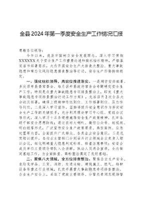 全县2024年第一季度安全生产工作情况汇报尊敬各位领导:今年以来,我县牢固树立安全发展理念,深入学习贯彻XXXXXX关于安全生产工作重要论述和批示指示精神,严格落实省市部署要求,大力开展安全生产大排查大整治、重大事故隐患和常态化风险隐患排查整治等行动,安全生产形势持续稳定。一、强化组织领导,高站位推进落实。一是周密安排部署。多次召开县委常委会、每月召开县政府常务会专题研究安全生产工作,特别是在重大事故隐患专项排查整治上,印发《重大事故隐患专项排查整治行动工作方案》,先后召开2次全县大会动员部署,确保上级精神传达到位、工作部署到位、压力传导到位。二是深入学习宣传。坚持将提升安全意识作为夯实安全生产工作的关键抓手,充分利用理论学习中心组、党组会议等形式,深入学习十五条硬措施等安全生产政策精神,扎牢各级干部安全思想防线;通过农村大喇叭、微信公众号、短视频、明白纸等形式,广泛宣传安全生产政策要求、典型案例、应急处置等内容,全面提升广大群众、各类企业安全意识。三是扎实培训提升。各行业主管部门分别召开行业领域企业负责人培训会议,细化明确重大隐患判定标准、排查注意事项;安委会成员单位主要领导带队入企讲解,执法人员进企宣讲,全力做实基础工作,为全面排查、高标整治奠定了良好基础。二、聚焦八大领域,全方位排查整治。聚焦企业生产安全、危险化学品、工贸、消防、交通运输、建筑施工、燃气、特种设备等重点行业领域,扎实开展重大事故隐患专项排查整治。企业生产安全上,采取了党政主要领导、分管负责同志现场督导,企业自查自纠,各级干部逐一核实销号的方式,进行了全面兜底摸排,截至目前排查整改各类隐患205处,帮扶指导重点企业199家(次),行政处罚3.85万元。危险化学品上,重点对四库使用聚氨酯等易燃材料,以及生产工艺、储存罐区的重大危险源安全管理情况进行排查。工贸方面,重点对有限空间作业、工程外包、检维修作业等情况,以及动火作业、高处作业、临时用电等进行了检查,共检查整改隐患36处。消防方面,重点对医疗卫生机构、福利机构、劳动密集型企业、高层建设、仓储物流重大火灾隐患,以及违规使用易燃可燃材料、违规进行电气焊作业进行了检查。交通运输上,重点对公路桥梁安全设施、两客一危车辆进行排查,共排查整改隐患56处。建筑施工上,重点排查深基坑、高支模、脚手架、起重机械及吊装工程等安全隐患,完成排查整改11处。燃气领域,重点对天然气、液化石油气供应企业,餐饮经营单位、农贸市场等气瓶使用存放单位进行排查,重点查处超量储存、使用不合格瓶灶阀管,未规范安装报警器、三通、软管等行为,共排查整改隐患26处。特种设备上,对电梯等特种设备超期未检、超参数运行、带病使用等进行重点排查;结合燃气安全,对气瓶充装单位无证充装、超范围充装等情况进行了全面检查,共排查整改隐患23处。三、强化四项措施,全过程压实责任。一是视频暗访。积极探索问题发现新模式,先后通过视频暗访的形式,制作了X企业、X企业、X企业、X企业等暗访视频,开展警示教育,有效提升各级各部门和企业的安全意识。二是专家会诊。通过安全专家会诊帮助企业了解其安全风险,采取有效的措施来控制风险。全县先后6次聘请专家对23家企业开展安全诊判,及时消除了存在的安全隐患。三是强化执法。采取夜查、突击检查、联合执法等方式,深入企业一线对重大事故隐患进行排查整治,形成了强力推进的工作格局。四是真督严考。县委、县政府督查室将安全生产工作列入督查重点,督促各项工作措施文可居文库——海量学习资料,手机电脑均可下载www.wenkeju.com落实,县安委办将重大事故排查整治行动纳入了上半年安全生产考核内容,倒逼各级各类主体责任全面落实。下一步,我县将认真落实这次会议精神,特别是X讲话要求,持续深入开展安全生产各项活动,为全市营造安全稳定的社会环境,保障经济社会高质量发展做出贡献。一是坚决树牢安全发展的理念。进一步深入学习贯彻XXXXXX关于安全生产工作的重要论述,坚持以高水平安全服务高质量发展,把安全生产工作贯穿到经济发展的全过程、各方面,切实守牢安全底线。二是深入开展重大事故隐患排查整治。严格按照国家和省市安排部署,进一步细化各行业重大隐患判定标准,对各类重大事故隐患持续开展排查整治,确保将重大隐患消除在萌芽状态,坚决防范重大生产安全事故发生。三是持续开展常态化隐患排查整治。严格按照《安全生产风险管控和隐患治理规定》要求,精准进行风险隐患辨识,持续开展日常排查、定期排查和专项排查,边查边改、立行立改,确保存量隐患整改到位、增量隐患动态清零。四是大力开展重点行业领域专项整治。突出危险化学品、消防、建筑施工、自建房、燃气、旅游等重点行业领域,持之以恒开展专项整治行动,全面加强各行业领域安全管控水平,通过能力提升、监管精准,确保全县安全生产形势持