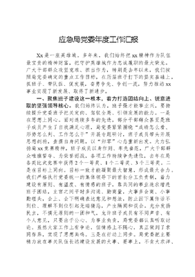 应急局党委年度工作汇报Xx是一座英雄城。多年来,我们始终把xx精神作为队伍最宝贵的精神财富,把守护英雄城作为忠诚履职的最大荣光。广大干部群众攻坚克难、担当作为,特别是去年以来,我们按照局党委确定的重点工作目标,在历届班子打下的坚实基础上,抓班子、带队伍、促发展,奋勇争先、争创一流,努力推动xx事业实现了新发展、取得了新进步。一、聚焦班子建设这一根本,着力打造团结向上、锐意进取的坚强领导核心。我们始终认为,班子强才能事业兴,要持续提升党委班子把关定向、驾驭全局、引领发展的能力。一是在思想上同心。面对连续多年的先进,部分干部群众甚至是班子成员产生了自我满足心理,局党委紧紧围绕成绩怎么看、形势怎么判、工作怎么干开展专题研讨,班子成员带头开展思想剖析,查摆自身问题,以归零心态重新出发。大力弘扬局xx竞赛精神,班子成员以身作则、率先垂范,广大干部群众唯旗誓夺、为荣誉而战,各项工作持续争先进位,去年在局各类比武竞赛中获得2个一等奖、1个二等奖、3个三等奖。二是在目标上同向。目标一致才能凝聚最大智慧,形成最大合力。我们严格执行党委统一的集体领导下的首长分工负责制,着力建设有原则、有温度、有情感的班子,靠共同的事业追求增进班子团结,主官之间平时多沟通、勤商量,大事多会商、小事勤碰头,会上、会下明确表达意见和想法,防止因下属传话不到位、理解不到位引起无端猜忌,产生隔阂和误会。充分发扬民主,不搞无原则的一团和气,允许班子成员有不同声音、有个人意见,只要出于公心、为事业负责,局党委都认真听取讨论。虽然大家工作上有争论,但情感上不隔心,真正做到了求同存异,实现了思想共鸣。三是在行动上同步。局党委把主要精力放在事关队伍长远建设发展的大事、要事上,不贪大求洋、不好高骛远,保持几年干成一件大事的韧劲和一年干成几件要事的冲劲。坚持以有为换有位,利用1年时间打造了xx这个全省正规化试点;市委、市政府高度认可xx工作,为局荣记集体二等功。二、聚焦纪律部队这一标准,努力带出政治过硬、充满活力的队伍。我们始终认为,一局伍严明的纪律养成,就必须要将强有力的教育管理融入点滴细节,引导干部群众从行为的服从到内心的拥护,切实做到信念坚定、主动担当。一是政治建队铸魂育人。面对当前队员成长背景变化、入队动机多样的实际,我们坚持运用XXXXXX重要训词和xx红色资源打造xx职业文化,规范行为举止、培育战斗作风,增进奉献精神和职业荣誉感。结合第二批主题教育,深入细致做好两个经常性工作,局班子成员每月到联系点开展五同,能够熟悉掌握每名干部群众家庭、婚恋和兴趣爱好等情况,从忽多忽少的饭量中、阴晴变化的表情中、参与活动的冷热中掌握思想脉搏、查找苗头隐患、及时化解矛盾,针对性施策,确保了队伍持续高度稳定。二是从严治队听从号令。对纪律队伍来说,执行力就是战斗力,我们严格按纲抓建,从办公秩序、会风会纪、礼节礼貌等小事、细节入手,在一点一滴、一言一行中体现纪律意识和规矩意识,不断提升正规化建设水平。深入开展队伍安全隐患大排查和常态化督导,发现游戏充值、大额消费、内部借款等风险隐患13项,及时纠偏、堵塞漏洞。强化政治监督,深化审计整改,严肃追责问责,支大队同步开展五个一活动,一体推进三不建设,筑牢拒腐防变的思想堤坝。三是倾情带队激发活力。我们把干部群众成长进步作为党委的大事,让干部群众在政策范围内实现最高政治诉求,去年提拔交流24名干部。牢固树立休息好才能工作好的理念,基层队员休假率达到100%,对重大节假日执勤、休息日加班的干部群众,一律予以补休。我们还将合同制队员纳入子女择优入学和优抚基金保障范围,累计发放优抚基金70万元,受到了干部群众及文可居文库——海量学习资料,手机电脑均可下载www.wenkeju.com家属的一致好评,队伍各级更有念头、更有奔头、更有干头。三、聚焦主责主业这一使命,全力营造党政放心、和谐稳定的xx安全环境。我们始终认为,平时防得住、战时打得赢,是检验领导班子推动发展的根本标准,也是党委政府评价xx工作的重要依据。一是火灾防控更加精准。常态化开展四级分析研判,充分发挥监管调度中心作用,实体化运行市县两级委员会,凝聚合力开展1+3专项整治,有力维护了各领域火灾形势持续稳定。连续4年被市委市政府评为平安xx建设先进集体。发展永无止境,奋斗未有穷期。我们虽然干了一些工作,但距离局党委的要求,与兄弟局的一些先进做法相比仍有一定差距,下一步,我们将以此次会议为新的起点,乘势而上、只争朝夕,埋头苦干、务实重行,为xx事业高质量发展贡献智慧与力量!发言完毕。文可居文库——海量学习资料,手机电脑均可下载www.wenkeju.com