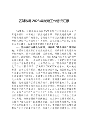 区财政局2023年党建工作情况汇报2023年,区财政局始终以XXX新时代中国特色社会主义思想为指引,牢固树立抓党建是本职、不抓党建是失职、抓不好党建是渎职的理念,全局党员干部以主题教育和深化能力作风建设工作落实年为契机,深化全面从严治党,狠抓能力作风建设,以高质量党建促进高质量发展。一、坚持以政治建设为统领,切实将两个维护落到实处。牢固树立财政部门首先是政治机关、财政干部首先是政治干部的意识,坚持以政领财、以财辅政,始终在政治立场、政治方向、政治原则、政治道路上,同以XXX同志为核心的党中央保持高度一致。一是始终坚持以政领财。自觉把财政工作放在党的工作全局中思考、大局下行动,把两个维护贯穿财政工作全过程各环节,坚决做到XXXXXX有号令,党中央有部署,省市区委有要求,财政有行动见实效,确保财政工作始终沿着正确方向前进。二是严明政治纪律规矩。修定《X区财政局党组工作规则》,坚持重大问题集体研究决定,科学决策、民主决策、依法决策水平进一步提高。落实重大事项请示报告制度,及时规范向区委区政府请示、报告财政重点工作。坚决贯彻落实新形势下党内政治生活若干准则,组织召开年度及主题教育专题民主生活会、组织生活会,深入开展批评和自我批评。坚持当下改和长久立并重,全面完成年度集中考核反馈整改任务,努力营造风清气正政治生态。三是全力服务中心大局。持续增强财力保障能力,向上争取取得丰硕成果。坚持向国之大者配置财政资源,大力优化支出结构,做到中央规定配套项目、民生政策性支出、支持经济结构战略性调整和产业升级的生产性投资、科技人才等创新领域支出、防范化解重点领域风险支出等五个必保。二、持续深化理论武装,不断用党的创新理论凝心铸魂。以主题教育为牵动,以学习贯彻XXXXXX视察我省期间重要讲话重要指示精神为重点,持续推进党的创新理论入心见行、善思善用。一是注重发挥班子引领作用。及时跟进学习XXXXXX最新重要讲话重要指示精神,组织开展专家讲座辅导、党校参观学习等多样化学习活动。深入开展察实情、谋良策、破难题、促振兴大调研活动。二是持续夯实基层基础。依托三会一课,做到每周一学习、每月一研讨,创新开展参观红色教育基地、下沉基层服务社区等主题党日活动,进一步丰富学习载体。全面加强党支部标准化规范化建设,不断提高政治领导力、思想引领力和群众组织力,切实把基层党组织建设成为坚强战斗堡垒。三是严肃党的组织生活。严格执行三会一课、主题党日、谈心谈话、党员民主评议等党的组织生活基本制度。四是强化党员教育管理。规范党员组织关系日常管理和党费收缴、管理、使用工作,认真开展党务公开工作,规范开展新党员培训。坚持严格标准、严密程序,发展党员X名,积极把优秀青年吸收到党内。举行光荣在党50年纪念章颁发仪式,增强老党员的荣誉感、获得感。五是丰富机关文化载体。组织党员干部开展下沉社区、志愿献血、爱心募捐等志愿服务活动。三、以工作落实年活动为抓手,驰而不息深化能力作风建设。坚持能力作风建设永远在路上,以抓铁有痕,踏石留印的坚韧和执着,持续提能力、转作风、抓落实。一是推动思想大解放取得实效。深入推进学标杆、找差距活动,对照解放思想典型案例组织开展集中研讨,切实激发全局改革创新的积极性、主动性,进一步创新优化财政服务高质量发展政策措施。二是推动能力大提升取得实效。深入开展学习型机关建设,举办业务培训班、财政业务大讲堂;X名青年干部参加驻村工作队或挂任村第一书记,干部能力素质得到有文可居文库——海量学习资料,手机电脑均可下载www.wenkeju.com效提升,财政工作专业化水平进一步提升。推动作风大转变取得实效。三是推动工作大落实取得实效。以信息化系统为依托,建立重点工作全面覆盖、分时分色预警提醒、全程监测跟踪督办、手机短信远程关联、功能完备拓展性强的四个体系运行平台,X项重点工作任务纳入四个体系管理,确保各项工作部署落地见效。四、坚持三不一体推进,坚决打赢反腐败斗争攻坚战持久战。坚定不移推进正风肃纪反腐,持续涵养风清气正的优良政治生态。一是强化警示教育。及时转发《关于XX违反中央八项规定精神典型问题的通报》,经常性开展以案为鉴、以案促改、以案促教活动。组织党员干部开展赴廉政教育基地接受教育、参观廉洁文化建设主题作品展等活动,在元旦、春节、端午、中秋等重要节点及时开展廉政提醒,加强廉政文化建设。二是强化制度建设。坚持用制度管权管钱,开展制度规范建设年活动,梳理制度文件X件,进一步规范理财用权行为。2024年,区财政局将坚持以XXX新时代中国特色社会主义思想为指导,深入贯彻落实XXXXXX视察我省期间重要讲话重要指示精神,全面履行机关党建第一责任人责任,团结带领全局党员干部,全面落实新时代党的建设总要求