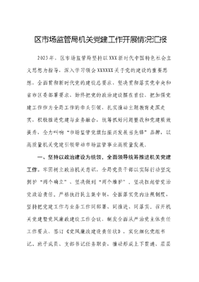 区市场监管局机关党建工作开展情况汇报2023年,区市场监管局坚持以XXX新时代中国特色社会主义思想为指导,深入学习领会XXXXXX关于党的建设的重要思想,全面贯彻新时代党的建设总要求,坚决贯彻落实党中央和省市区委部署要求,始终把党的政治建设摆在首位,把加强党建工作作为全局工作的牵头引领,扎实推动主题教育走深走实,积极推进党建与业务融合,统筹抓好问题整改和党建质效提升,全力叫响市场监管党旗红振兴发展当先锋品牌,以高质量机关党建引领带动市场监管事业高质量发展。一、坚持以政治建设为统领,全面领导统筹推进机关党建工作。牢固树立政治机关意识,全局党员干部以实际行动坚定拥护两个确立、坚决做到两个维护。坚决扛起管党治党政治责任。严格执行民主集中制,全面落实党内法规制度,坚持把党建工作与业务工作同部署、同推进、同落实。召开机关党建暨党风廉政建设工作会议,制发全面从严治党主体责任工作要点,签订《党风廉政建设责任状》,实化细化党组书记、班子成员、支部书记任务职责,推动形成上下贯通、层层衔接、责任具体、环环相扣的责任链条。深入开展主题教育。始终把抓好主题教育作为重要政治任务,加强学习型机关创建,举办读书班,领导班子带头讲党课,开展赓续乡村振兴市场监管能量主题党日系列活动,组织开展第一议题学习、党组理论学习中心组学习、青年理论学习小组学习研讨活动等。围绕*个重点课题开展调查研究,集中破解制约全区市场监管服务高质量发展难题*个,推动成果转化*项。不折不扣贯彻落实党中央和省市区委决策部署。精心谋划推动市场准入服务优化行动、质量基础设施夯基行动等十大行动,坚决有力抓好制止食品浪费等重点工作,认真落实区委、区政府主要领导交办事项*件。二、坚持以组织建设为根本,着力增强基层党组织政治功能和组织功能。树牢大抓基层的鲜明导向,坚持不懈强基础、固根本,推动基层党组织全面进步、全面过硬。抓实党支部标准化规范化建设。落实领导干部双重组织生活制度,班子成员严格落实五个到支部要求,以关键少数示范带动绝大多数。加大对支部三会一课分类指导和监督检文可居文库——海量学习资料,手机电脑均可下载www.wenkeju.com查力度,实施四强六规范党支部督导检查,对基层党支部进行分档评价考核。擦亮党建工作品牌。持续强化市场监管党旗红振兴发展当先锋核心品牌引领,不断深化细化支部+特色党员+岗位的双+模式成效成果,创建特色支部品牌。深化机关文化创建。举办主题教育演讲、年轻干部座谈会、新任职入职及挂职干部座谈会、我的成长之路分享会,开展先锋杯排球比赛、书法绘画展、传承弘扬雷锋精神擦亮为民服务底色志愿服务等活动,扎实做好群团工作,展现干部风采、凝聚向上力量。三、坚持以纪律建设为保障,一体推进三不腐向纵深发展。始终坚持全面从严治党永远在路上,以严的基调、严的措施、严的氛围持续加强党风廉政建设。保持高压态势确保不敢腐。持续巩固中央八项规定堤坝,常态化运用谈心谈话、走访调研、走流程、述责述廉考核等形式,加强监督。常态化、规范化与驻局纪检监察组开展沟通会商。严肃纪律规矩确保不能腐。紧盯重要环节、重点岗位、重要节点和关键人,监督重要事项决策和实施过程,进一步扎紧扎牢制文可居文库——海量学习资料,手机电脑均可下载www.wenkeju.com度笼子,强化制度刚性约束。强化教育引导确保不想腐。坚持教育在先、警示在先、预防在先,将XXXXXX关于党风廉政建设、廉洁文化建设的重要文章重要讲话重要指示精神列入基层党组织学习计划,深入开展每月一案每季一片警示教育活动,主持召开党风廉政建设警示教育大会,深入开展警示教育活动,教育引导党员干部受警醒、知敬畏、存戒惧、守底线。四、坚持以工作质效提升为导向,扎实推动党建与业务工作相融互促。牢牢扛起把方向、管大局、保落实的责任使命,深化党建引领,凝聚发展合力,努力把党的政治优势、组织优势转化为发展优势。有效激发经营主体活力。开展个体工商户服务上门等行动。扎实推进小个专党建工作,新组建党建工作指导站*个。持续规范市场秩序。深入开展涉疫药品和医疗用品稳价保质、农资打假保春耕、非法黑土经营排查整治、市场监管护航旅游等专项行动,精心组织实施事关市场主体和广大群众切身利益的专项整治,查办各类违法案件*件。牢牢守住市场监管领域安全底线。深入落实食品安全两个责文可居文库——海量学习资料,手机电脑均可下载www.wenkeju.com任,采取十应十尽措施开展集中攻坚,扎实推进特种设备重大事故隐患专项排查整治等行动,排查整治隐患问题*个。2024年,区市场监管局将坚持以XXX新时代中国特色社会主义思想为指导,严格落实全面从严治党