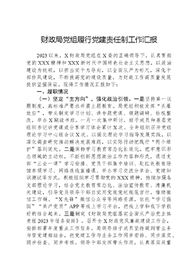 财政局党组履行党建责任制工作汇报2023以来,X财政局党组在X委的正确领导下,认真贯彻党的XXX精神和XXX新时代中国特色社会主义思想,以政治建设为统领,以担当实干为导向,以全面从严为标尺,深化干部作风建设,不断提高党的建设质量,为财政工作高质量发展提供坚强保证。现将工作情况汇报如下:一、履职情况(一)坚定主方向,强化政治引领。一是坚持第一议题制度,高标准严要求开展主题教育。局党组积极发挥头雁效应,带头制定学习计划、讲专题党课、领题调研、检视整改,举办X期读书班,一月一次集中研讨,班子成员和基层党组织书记讲党课或分享学习体会累计X次。全年组织召开党组理论学习中心组会议X次。以强化理论学习指导发展实践,以深化调查研究推动解决发展难题,以实际行动把践行两个维护落到实处。二是保持学习教育常态化长效化。把牢意识形态领域的主动权,不断创新思想政治工作内容和形式,通过支部三会一课学习安排、党员干部集中培训、赴红色教育场馆参观学习、网络连线直播课、举办学习交流分享会、党建知识测试等方式,积极组织学习贯彻党的XXX精神,持续加强各支部理论学习,结合党史教育常态化、法治宣传教育、清廉机关建设,引导党员领导干部自觉用党规党纪规范言行。借助微信工作群、X先锋微信公众号等网络资源,依托学习强国共产党员APP等线上学习平台,把线上学和线下学很好的结合起来。三是制定《财政局党组落实全面从严治党主体责任2023年任务安排》,召开全X财政党风廉政建设工作会,安排部署年度重点工作任务。局领导班子成员坚持做到管业务与管党建相结合,把党建工作与业务工作同步安排、同步落实、同步检查、同步考核。领导干部发挥带头作用,认真落实双重组织生活制度,引导全体党员真正把学习的过程转化为破解难题、推动工作的过程。(二)筑牢主阵地,建强战斗堡垒。一是扎实推进基层组织建设。严格落实三会一课等党组织生活制度,重视党员发展工作,2023年共X人参加X直工委组织的党员发展对象培训班。开展两优一先评选活动,共表彰X名同志为优秀共产党员、X名同志为优秀党务工作者、X个基层党组织为先进基层党组织,进一步弘扬先进,充分发挥基层党组织战斗堡垒作用和广大党员先锋模范作用。二是运用党建+模式,注重创新活动形式。组织党员干部观看爱国主义教育电影,走进X干部教育学院等红色教育基地,进一步弘扬赓续红色传统,激发爱国情怀。组织开展无偿献血活动、到福利院慰问儿童、为残疾人发放康复辅具、到养老院看望老人等,弘扬社会主义核心价值观。严格落实党员干部双报到,积极开展党建联建活动,组织党员突击队带头参与到文明X创建、乡村振兴等工作中,累计服务X余人次。有效地增强了党员干部的思想自觉、政治自觉和行动自觉。三是筑牢国有企业政治属性。印发《X国有企业党委前置研究讨论事项清单指导文本》、《X国有企业落实三重一大决策制度指导文本》,要求各公司企业结合实际,制定党委会前置研究讨论重大经营事项管理清单和议事规则,明确党组织研究讨论前置程序,确立党组织在企业经营管理中的法定地位,强化集体领导,凡重大决策、重要干部任免、重大项目安排和大额度资金使用等均由党委会集体讨论研究决定,切实把党的领导融入公司治理各环节,充分发挥企业党组织把方向、管大局、促落实的作用。(三)把牢主动权,坚持履职担当。我局严格履行党的建设工作领导小组成员职责,推动责任工作落地见效。一是强化服务保障,大力支持人才新政实施。坚持把深化改革作为推动人才发展的根本动力,最大限度激发人才创新创业活动,为充分发挥人才在加快转型发展中的重要作用,拨付引进人才文可居文库——海量学习资料,手机电脑均可下载www.wenkeju.comX补贴、X津贴、X扶持资金、X工作站建站等经费X万元,支持X英才计划人才工作系列宣传报道和招才引智创新发展大会等活动举办,为X名高层次人才发放生活津贴,为X名高层次人才发放购房补贴。二是大力保障基层组织运转经费,确保政策落实到位。大力保障基层组织运转经费,争取上级资金X万元,根据《X村(社区)党员群众综合服务中心(站)工作运转经费、党建经费、服务群众专项经费管理办法》精神,及时足额下达X级村级组织工作运转经费、服务群众专项经费、党员活动经费X万元,积极引导县乡两级加大对村级组织运转经费的投入,有力保障X个党员群众综合服务中心和X个党员群众综合服务站工作运转。三是始终把贯彻落实XXXXXX关于河南工作的重要讲话重要指示作为头等大事,实行专项督办,坚持紧日子保基本、调结构保战略,落实积极的财政政策要加力提效,紧盯X的奋斗目标,加强财政资源统筹,大力调整优化支出结构,推动我为群众办实事常态化,实施党员领导干部带头进企业、进社区、进乡镇,确保各项惠企利民政策有力推进、落地见效。提速提质