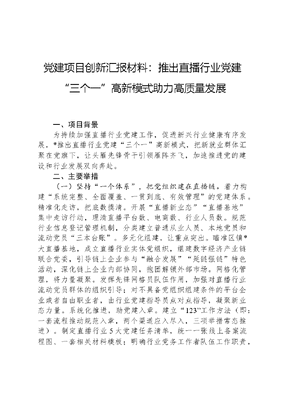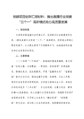 党建项目创新汇报材料:推出直播行业党建三个一高新模式助力高质量发展一、项目背景为持续加强直播行业党建工作,促进新兴行业健康有序发展,*推出直播行业党建三个一高新模式,把新就业群体汇聚在党旗下,让头雁先锋骨干引领雁阵齐飞,加速推进党的建设和行业发展双向奔赴。二、主要举措(一)坚持一个体系,把党组织建在直播链。着力构建系统完整、全面覆盖、一贯到底、有效管理的党建体系。精准化走访,把底数摸清。开展直播新业态直播基地集中走访行动,理清直播平台数、电商数、行业人员数。规范行业信息登记管理机制,分类建立普通从业人员、本地党员和流动党员三本台账。多元化组建,让重点突出。瞄准区镇*大直播基地,成立直播行业实体党组织,组建数字经济产业链联合党委,引导链上企业参与融合发展延链强链特色活动,深化链上企业内部协同,抱团解锁外部市场。网格化管理,将力量凝聚。发挥先锋网格员队伍作用,加强对直播行业流动党员群体的组织引导;对不具备党组织组建条件的平台企业或者自由职业者,由行业党建指导员点对点指导,凝聚新业态力量。系统化推进,助党建入章。建立123工作方法(即:一套流程推动规范入章,两个渠道应入尽入,三项举措常态推进)。制定直播行业5大党建任务清单,统一一张线上备案流程图、一套相关材料模板;明确行业党务工作者队伍工作职责,打通企业申报和下沉指导双向渠道;推动党建入章纳入党组织书记述职评议考核、纳入优先发展党员、纳入党组织书记与直播管理人员交叉任职工作中。(二)推行一核双翼,让党员活跃在直播间。瞄准把党员培养为骨干,把骨干发展为党员的核心目标,推动从业人员政治素养和专业技能双提升、直播行业党建工作和作用发挥双落地。多渠道选骨干先锋。出台直播行业发展党员尖兵计划,落实党员先锋和行业先锋的双先锋培育行动。把直播行业人才纳入党员后备队伍,从党员骨干中培养党组织书记。多层次育护航先锋。遴选一批经验丰富的文可居文库——海量学习资料,手机电脑均可下载www.wenkeju.com党务工作者,结对一支直播行业党务队伍,建立一套星火先锋岗认证体系。聘任以党校老师、红色工匠、村(社区)书记等为主体的先锋直播讲师团,成立以青年主播为主体的新主播队伍。多举措亮服务先锋。发挥行业内部各级党组织作用,督促平台企业依法合规、诚信经营,引导企业传承红色基因、履行社会责任。发挥网络主播职业优势,设立先锋带货岗、组建红链志愿服务队,引导主播参与平安创建、文明宣传、社区服务等行动。(三)践行一体发展,把力量聚融在产业上。开展三聚三融行动,实现直播行业高质量一体发展。聚阵地融行业成长。打造集高端纺织产业博物馆、党建展示厅、先锋直播间3站立体式矩阵。常态化开设电商培训、月度主题党日和线上组织生活开放观摩活动,定期开展数字经济产业链联席会议,解决直播企业发展问题。聚资源融共同发展。立足数字经济产业园直播基地自身能效,用*电视、*星选等优质资源,推出红链星选直播品牌,助力直播行业发展。聚群团融暖心服务。联合群团组织向直播行业从业人员提供技能提升、权文可居文库——海量学习资料,手机电脑均可下载www.wenkeju.com益维护等6大类服务。开展评优评先活动,增强从业人员的归属感和荣誉感。三、预期成效(一)工作体系进一步健全。建立并完善直播行业实体型与功能型互为补充的组织体系,目前已成立实体型党组织2个,联合党委1个,产业链党建联盟3个。召开直播行业党建联席会议4次,并通过了直播行业联席联建海棠互联工作机制。计划年内培育2名预备党员,聘请长三角科研高校数字经济方向的先锋讲师3名,开展大数据分析、业态培育等专业讲座4场,实现多渠道覆盖互动人次达10万人。(二)作用发挥进一步凸显。启动党员骨干和专业人才双先锋培育计划、实施内培外引专职主播队伍行动。计划对内培育专业主播36人,组建3支直播先锋队,常态化开展红色先锋系列活动5场,专题活动6场;对外联合相关职能部门成立政策辅导护播先锋队伍,全年度面向直播行业开展政策解读3场;设立直播间先锋值班岗,由党建指导员全程监督审核,杜绝直播中出现低级趣味等问题。文可居文库——海量学习资料,手机电脑均可下载www.wenkeju.com(三)产城效能进一步激发。擦亮红链星选直播品牌,为群众提供政策宣讲、党员教育学习、助农产品展示、链上企业商品展陈等服务。目前通过直播已为区镇新能源企业嫁接有效资源4个,开展线上招聘活动2场,帮助28家高端纺织产业链企业招工51名。年内将推动建成高端纺织产业展陈馆、高端纺织产业链党建展示厅,布设农文旅一体化参观动线3条,预计下半年提供对外接待参观服务,不断放大高新区产城融合效能。文可居