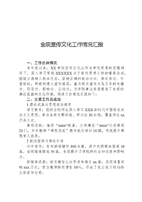 全院宣传文化工作情况汇报一、工作总体情况本年度以来,XX学院宣传文化工作在学院党委的坚强领导下,深入学习贯彻XXXXXX关于宣传思想工作的重要论述,围绕立德树人根本任务,坚持正确的政治方向、舆论导向、价值取向,积极构建大宣传格局,着力提升宣传文化工作的传播力、引导力、影响力、公信力,为学院事业发展营造了良好的舆论氛围和文化环境。现将工作情况汇报如下:二、主要工作及成效1.理论武装与思想政治教育学习教育:组织全院师生深入学习XXX新时代中国特色社会主义思想,举办各类专题讲座、研讨会30余场,覆盖师生xx万余人次。课程思政:推进xxxx改革,立项建设xxxx示范课程20门,举办教师课程思政教学能力培训10期,有效提升课程育人效果。2.新闻宣传与舆论引导对外宣传:发布新闻稿件300余篇,其中央级媒体报道10篇,省级媒体报道50篇,有效提升了学院的社会知名度和影响力。新媒体运营:官方微信公众号发布推文xx篇,总阅读量突破xxx万次,官方微博粉丝增长10%,形成了线上线下联动的立体宣传态势。舆情应对:建立健全舆情监测、预警、应对机制,妥善处理各类网络舆情事件3起,有效维护了学院形象和社会稳定。3.校园文化建设主题活动:举办校园文化节、学术科技节等活动开展各类文化讲座、艺术展览、体育赛事等xx余场,丰富了师生精神文化生活。文化品牌塑造:打造XX讲堂、XX读书会等特色文化品牌,邀请知名学者、作家、艺术家来校交流,提升校园文化品位。环境文化建设:更新校园标识系统,增设人文景观雕塑,优化公共空间布局,营造浓厚的人文气息和学术氛围。4.师德师风与学生德育工作师德师风建设:开展立德树人、铸魂育人主题教育活动,表彰师德先进个人xx名,组织签订师德承诺书,强化师德师风考核评价。学生德育工作:实施xxxx综合改革,推进第二课堂成绩单制度,开展志愿服务、社会实践、社团活动等,培养学生社会责任感和实践能力。三、存在问题与改进措施当前工作中仍存在理论学习深度不够、新媒体传播效能待提升、校园文化活动参与度不均衡等问题。针对这些问题,下一阶段我们将:1.深化理论武装,创新学习方式方法,增强理论学习的吸引力和实效性。2.优化宣传矩阵,提升新媒体内容策划与互动能力,扩大宣传覆盖面和影响力。3.丰富文化供给,结合师生需求,策划更多精品文化活动,激发校园文化活力。4.强化师德引领,完善师德师风长效机制,树立师德典型,营造尊师重教氛围。5.深化德育实践,整合校内外资源,搭建更多实践育人平文可居文库——海量学习资料,手机电脑均可下载www.wenkeju.com台,促进学生全面发展。我们始终坚守并积极践行守正创新、服务大局的核心工作理念,矢志不渝地致力于提升宣传文化工作的品质与效能。在这一信念的引领下,我们将持续激发创新活力,固守价值正道,紧密围绕学院发展战略,以高瞻远瞩的视野与精准务实的行动,倾力助推学院实现内涵式跨越发展。我们深知,每一次宣传文化的精耕细作,都是对教育使命的深情回应;每一次创新思维的火花碰撞,都是对时代脉搏的敏锐把握。因此,我们将坚持以人为本,以文化人,以更高的责任感与使命感,用更生动的语言、更鲜活的方式、更深入人心的内容,讲好学院故事,传播正能量,营造浓郁的学术氛围与和谐的人文环境,让宣传文化工作成为驱动学院事业繁荣发展的重要引擎。展望未来,我们承诺将以更加饱满的热情、更加坚定的步伐,持之以恒地提升宣传文化工作水平,使其更好地服务于学院的战略布局,更好地赋能于学生的全面发展。我们期待在守正创新的道路上,携手共绘一幅幅生机盎然的文化画卷,共同谱写一曲曲激昂澎湃的发展乐章,为全力培育德智体美劳全面发展的社会主义建设者和接班人,为推动学院内涵式发展迈向新的高峰,做出更大、更深远的贡献!文可居文库——海量学习资料,手机电脑均可下载www.wenkeju.com