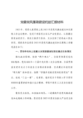党委党风廉政建设约谈汇报材料2023年,党委认真贯彻上级2023年度党风廉政建设和反腐败工作会议精神,坚定不移落实全面从严治党要求,认真履行管党治党责任,狠抓主体责任落实,充分发挥了党委战斗堡垒作用。现将我单位党委2023年度党风廉政建设和反腐败工作情况报告如下:一、贯彻中央和上级重大决策部署谋划落实重点任务情况强化政治引领,坚持两个确立。全面贯彻落实党的XXX精神、党的XXX和二十届中央纪委二次全会精神。全面贯彻落实党中央关于科技自立自强决策部署,坚决履行科技创新领头雁使命担当,按照学懂弄通做实党的创新理论要求,依托三会一课、党课等,组织党员干部深入学习贯彻XXXXXX重要讲话和指示批示精神,带领干部员工立足岗位做好工作。聚焦重点任务,加强组织领导。一是围绕年度党风廉政建设和反腐败工作部署。落实党委2023年落实全面从严治党主体责任重点任务,总结工作,分析形势,把党风廉政建设和反腐败工作纳入中心总体布局,支委会研究部署年度党风廉政建设和反腐败工作计划,提出6方面21项重点任务,保障党的XXX决策部署贯彻落实。二、落实全面从严治党主体责任情况加强政治思想教育,筑牢党风廉政建设思想防线。一是围绕全面从严治党教育。持续抓好XXX新时代中国特色社会主义思想专题学习,全员传达中央反腐倡廉建设重大决策,上级2023年度党风廉政建设和反腐败工作会议精神暨警示教育大会精神、上级2023年经济责任审计迎审工作要求、上级作风纪律警示教育大会精神、违规吃喝专项整治大会精神等,明确形势任务,统一思想认识强化贯彻落实。二是抓实意识形态阵地建设。深入开展党的XXX精神学习,制定学习宣传贯彻方案。把开展主题教育作为重大政治任务,以高度的责任感,精心组织、周密部署,编制教育学习方案,完成调查研究、推动发展、检视整改及专题组织生活会等全部任务,深入剖析,积极开展问题整改。组织全体党员干部开展党的创新理论大学习大研讨,跟进学习XXXXXX重要讲话精神39篇、《求是》文章6篇、专著10部、党的XXX辅导读本3本,结合实际分专题系统研读文可居文库——海量学习资料,手机电脑均可下载www.wenkeju.comXXXXXX重要论述,强化党的创新理论学习;年度内组织专题党课5次,其中:党委书记结合学习体会讲专题党课3次、纪委委员讲专题党课1次、党的XXX精神解读专题党课1次;关注员工思想意识领域动态,通过季度思想动态调研、谈心谈话等形式,定期开展员工思想动态调研分析;持续加大青年科研人才选育力度,安排青年员工承担项目、为新员工配备职业导师、与青年员工交流座谈等,把理想信念教育融在日常、抓在经常。三是着力加强人才队伍建设。坚持党管干部原则,突出政治教育、强化政治锤炼、严明政治纪律、加强制度刚性执行,严格领导干部及时报告个人重要事项制度,开展选人用人专项排查。强化履责合力,细化落实两个责任。一是坚决扛起主体责任。召开全员会深入学习贯彻上级党风廉政建设和反腐败精神工作会议精神,按照上级党委2023年落实全面从严治党主体责任重点任务,分析形势、梳理任务要求,研究制定《2023年度党风廉政建设和反腐败工作计划》,提出6方面21项重点任务并组织实施;落实《中国共产党国有企业基层组织工作条例》,加强党员教育管理监督,严格执行党委组织生活制度。二是积极构建长效监督机制。以党委主体责任为根本、监督责任为保障,党委书记为第一责任人、班子成员一岗双责为支撑,班子成员带头加强政治建设,严守政治纪律和政治规矩,文可居文库——海量学习资料,手机电脑均可下载www.wenkeju.com落实纪检工作要求,推动两个责任贯通联动。三是强化廉政风险防控体系建设。按照主动超前、统筹协调、闭环管控原则,通过采购工作领导小组等逐级审议,强化科研项目申报立项、外委采购等关键环节监督审查,进一步提升了廉政风险防控水平。四是开展党风廉政建设一对一约谈。强化科研项目立项申报、物资和服务类采购等源端管控,党委书记和纪检委员对下属部门负责人开展廉政约谈,覆盖率67%。三、强化作风建设工作情况贯彻落实中央八项规定精神和上级实施细则方面。一是落实中央八项规定精神要求。加大监督检查力度,严格执行国家电网公司和上级关于认真遵守干部履职待遇、办公用房、公务接待、会议管理、车辆管理等方面的工作要求,常态化开展监督检查。二是聚焦隐匿变异问题。结合实际,编制违规吃喝专项整治自查自纠工作方案,聚焦公务接待、项目论证评审会议、物资采购及项目外委等4方面逐项排查,深挖细查重点领域、重点人员易出现问题环节,强化各级责任;开展公务用车专项治理自查自纠工作,坚决杜绝违规情况发生。三是严格落实长效机制。紧盯关键时间节点,做好节假日期间正风肃纪工作,在法定节假日前强调纪律要求,节后及时向上级纪