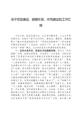 关于项目建设、招商引资、作风建设的工作汇报今年以来,X区迅速反应,立足城市服务型、工业主导型发展定位,坚持以X行动为牵引,抓谋划、强服务、稳推进,聚力能力作风建设提升年项目攻坚突破年优化营商环境攻坚突破年三项活动,切实以严、快、实的工作要求开启奔跑模式,全力加快现代化幸福美好新X建设。一、坚持求真务实,营造比学赶超新氛围。X区以作风赋能为纲,坚持以学促思、以思促行、以行促效,对标对表制定了X条提升和改进干部能力作风的具体措施,扎实推动X行动走深走实。以理论学习打开思维新天地。聚焦上级政策导向、全区中心大局、培育特色亮点三个维度,完善理论学习中心组—党支部—读书小组—党员个人四学联动机制,通过领导干部领学、集体交流研学、推荐菜单自学等方式,系统学习党的XX大精神等,引导党员干部胸怀国之大者省之要者民之盼者责之重者,以大视野、大格局准确把握新形势新任务,在省、市、区发展大局中思考和谋划工作。以观念碰撞同心共献金点子。以破解工作难题、破解瓶颈制约、破解制度机制问题为着力点,坚持个人找题、集体定题、干部领题、分头破题,围绕项目攻坚、产业发展、城市建设等重点工作,分条线、分层次、分领域开展大讨论,集中梳理突出问题和工作短板,通过班子成员领题破题,党员干部聚力解题,破除惯性思维,求解最优方法。在区电视台开设基层党组织书记专访专栏,由乡镇(街道)及部门(单位)党组织负责人围绕干部能力作风提升行动,谈问题、谈做法,表态度、亮承诺,推动关键少数发挥头雁效应,形成以上带下转作风抓落实的良好工作局面。以挂图作战啃下工作硬骨头。坚持目标导向、问题导向、结果导向,实行清单式管理和周报告制度,系统梳理全年重点任务,逐项明确任务书、路线图。建立工作调度机制,及时掌握推动情况,发现存在问题,研究制定有针对性的措施办法,把目标聚焦到重点对象上、把力量凝聚到重点任务上、把精力倾注到关键环节上,确保各项工作有力有序推进、落实落地见效。建立督查检查机制,采取明察暗访、随机抽查等方式,对各部门(单位)遵守中央八项规定精神、群众身边腐败和作风问题治理等情况进行督查,对典型问题公开通报曝光、警示震慑,推动全区干部纪律作风持续向上向好,各项工作全面有序开展。二、聚焦提质加速,激活经济发展新动能。X区以项目建设为王,抓项目、促投资、增动能,为全区经济社会高质量发展提供强力支撑。抓强组织引领。全面落实县级领导包抓、X+X项目管理机制,着力打好清单项目推进实施、产业项目延链补链强链、项目谋划储备、项目调度管理、项目要素保障五大攻坚突破战,集中力量加速推进重大项目快开快建,为全区经济高质量发展蓄势赋能。建立由区委、区政府主要领导牵头抓总,分管领导担任召集人、各副区长担任副召集人、区直相关部门为成员的项目攻坚突破年工作专班,总体协调推进攻坚突破各项措施,确保项目建设更快更优。抓实项目支撑。围绕农村人居环境整治示范带、X大道海绵化改造等XX个重点前期项目,X万亩现代农业产业园、冷链物流园基地等X个续建项目,融硕建材公司年产X万吨环保节能活性石灰生产线、老旧小区改造等XX个计划新开工项目,列出项目清单,实行挂图作战,一项一项抓推进、一件一件抓落实,确保顺利完成目标任务。坚持把重点产业链作为重要抓手,文可居文库——海量学习资料,手机电脑均可下载www.wenkeju.com全年计划推进产业链项目XX项,总投资XX.X亿元,当年计划完成投资X.X亿元。通过加快项目建设,力争全年固定资产投资增长X%以上,完成投资XX.X亿元以上。抓好保障机制。全面推行月调度、月分析、月通报制度,对项目当月开复工、形象进度、投资完成、入库统计等情况进行调度;建立土地要素保障会商协调机制,加强用地计划与项目计划的联动,及时研究解决投资清单项目建设用地问题;开展多形式政银企对接活动,引导金融机构优先支持重大项目建设;采取线上线下相结合、四不两直等方式,常态化开展专项调度,形成一级带着一级干、一级督着一级办的落实机制。三、注重外引内培,厚植招商引资新优势。X区以招商拉动为要,锚定全区营商环境水平全市靠前的定位,推动落实X条重点任务措施,全力打造投资贸易便利、行政办事高效、政务服务规范、法治体系完善的一流营商环境。细化措施激活力。准确把握宏观政策走势,对标国评指标,围绕企业开办、办理建筑许可、登记财产、获得信贷等方面,研究制定了X条具体措施,全面推行并联审批、帮办代办、告知承诺、容缺受理模式,投资备案类项目实现即来即办、秒批秒办。优化土地、信贷、技术、税务、人才等要素,有效降低了准入门槛,激发了市场活力。创新机制优服务。完善招商引资服务机制,建立企业白名单,扶持