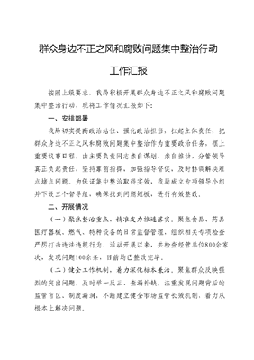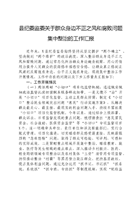 县纪委监委关于群众身边不正之风和腐败问题集中整治的工作汇报近年来,X县纪委监委始终坚持从坚定拥护两个确立、坚决做到两个维护的政治高度,深入整治群众身边不正之风和腐败问题,通过常态化纠治群众身边蝇贪蚁腐,用心用情用力提升人民群众的获得感幸福感安全感,让群众真正感到正风肃纪反腐就在身边、公平正义就在身边。现将集中整治工作开展情况、工作中存在的问题以及下步工作重点汇报如下:一、工作开展情况(一)用活用好小切口项目化监督机制,通过做实做细政治监督扎实织密联系服务群众纽带。一是无微不治开展小切口项目化监督。主动立足群众所需,制定《小切口整治民生领域突出问题惠民行动实施方案》,从解决群众最关心、最直接、最现实的利益问题入手,持续丰富拓展小切口项目化监督机制。今年以来,通过综合上级部署、群众诉求、日常监督发现的重点问题,梳理排查出惠民富民资金、社会救助、医保资金监管等小切口专项监督项目X个,逐一明确牵头单位、责任单位和涉及职能部门,实行台账式管理、项目化推进,切实瞄准群众感受最直接、反映最强烈的急难愁盼问题,取得了群众可检验、可评判、可感知的实际成效。二是紧盯重点领域开展集中整治。瞄准教育、就业、医疗等民生领域的痛点难点,深入推动乡村振兴、医药、粮食购销领域专项整治以及农村集体三资清管用专项监督,持续推动整治村霸等黑恶势力欺压群众、把持基层政权、侵占集体利益问题,通过充分运用抓书记、书记抓抓系统、系统抓抓专班、专班抓等制度机制,实现纪检监察和职能部门双联动,一体压实主体责任、监督责任和监管责任,今年以来共查处民生领域腐败和作风问题X万起,给予党纪政务处分X人,切实以严实监督执纪问责突破一批民生难事、办成一批民生好事、解决一批群众烦心事,交出一份有温度的民生答卷。三是靶向纠治群众反映强烈的作风问题。紧盯重点项目、重大资金、重要环节以及党政一把手、村级一肩挑人员等关键少数,重拳纠治干部群众反映强烈的工作虚于应付、蛮干快上、脱离实际搞政绩工程,以及在民生政策执行中打折扣、搞变通、敷衍了事等形式主义、官僚主义问题,查处并通报曝光典型问题X起,有效消除部分党员干部身上存在的守摊心理中游心态以及执行政策层层加码、简单机械一刀切等指尖上的形式主义问题,全面提升干部党员干部执行力,有效清除妨碍惠民政策落实的绊脚石。(二)聚焦完善基层监督体系,持续汇聚各方力量让群众对纪检监察工作可视有感。一是拓宽一线监督渠道。坚决落实开门整治的工作要求,扎实推进领导班子成员公开接访、带头包案制度,全面畅通信、访、电、网等举报渠道,持续深化与巡察、审计、财会等各类监督协作配合,有效推动把监督延伸到最基层,更加及时精准地发现群众身边蝇贪蚁腐,做到抓早抓小、动辄则咎。积极用好码上举报,在全县所有自然村安装码上举报公示牌,最大限度畅通和扩大群众参与渠道,真正实现监督下沉落地。二是整合各方监督力量。注重把室、组、地联合优势融入日常监督,积极通过室地联动、室组协作等方式,围绕乡村振兴、生态环保、民生项目资金等工作联合开展专项监督,今年以来,全县纪检监察系统自办案件中的问题线索来源于主动监督发现的占比达到X%,切实形成精准监督发现问题、反馈问题并督促解决问题闭环,有效破解基层监督力量不足、业务不精、人情干扰等问题,确保上级重大决策部署落到实处。三是推动科技赋能监文可居文库——海量学习资料,手机电脑均可下载www.wenkeju.com督。积极贯彻落实《数字纪检监察体系建设规划》,积极推动基层小微权力监督一点通信息平台应用,大力推动数字化技术与纪检监察业务深度融合,实现监督从瞪大眼睛看向数据碰撞算转变,切实实现对村级小微权力近距离、全天候、常态化监督,有效助力民生领域监督有形覆盖和有效覆盖相统一。(三)坚持立足长治长效,通过三不腐一体推进提升治理效能。一是坚持以案件促进整改整治。全力抓好线索处置、案件查办、突出问题整治等重点任务,建立问题线索台账,对21年以来的相关信访举报和问题线索进行大起底,对上级交办督办的问题线索实行领导包案,一抓到底,集中整治以来,通过深化室·组·地·巡协作配合、提级监督,销号整治群众长期反映问题X起,查处群众身边不正之风和腐败问题X起X人,切实让人民群众看到真变化、感到真成效、获得真实惠。二是坚持以典型的人和事强化警示教育。充分挖掘查办案件的附加值,全方位、多渠道用好身边案活教材,定期分类通报查处的典型案例,用案中人警醒身边人。积极推动警示教育由灌输式向沉浸式体验式转变,将庭审旁听、案例剖析、纪法宣讲、监督提醒等融入警示教育全过程,充分挖掘不同层面、不同职级、不同