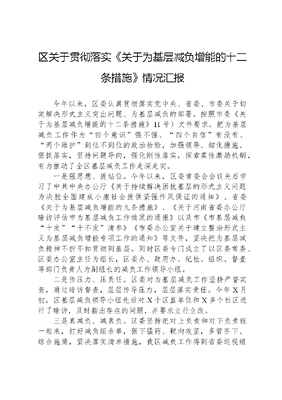 区关于贯彻落实《关于为基层减负增能的十二条措施》情况汇报今年以来,区委认真贯彻落实党中央、省委、市委关于切实解决形式主义突出问题、为基层减负的部署,按照市委《关于为基层减负增能的十二条措施》11号)文件要求,把为基层减负工作作为四个意识强不强、四个自信有没有、两个维护到位不到位的政治检验,加强领导、细化措施、狠抓落实,坚持问题导向,强化刚性落实,探索柔性激励机制,有力推动了全区基层减负工作走深走实。一是强思想、提站位。今年以来,区委常委会会议先后学习了中共中央办公厅《关于持续解决困扰基层的形式主义问题为决胜全面建成小康社会提供坚强作风保证的通知》、省委《关于为基层减负增能的九条措施》、《关于河南省委办公厅暗访评估市为基层减负工作情况的通报》以及市《市基层减负十发十不发清单》《市委办公室关于建立整治形式主义为基层减负增能专项工作的通知》等文件,坚决把为基层减负精神不折不扣贯彻到基层。同时区委专门成立了以区委常委、区委办公室主任为组长,区委办、政府办、纪检、组织、督查等部门负责人为副组长的减负工作领导小组。二是传压力、压责任。区委对为基层减负工作坚持严督实查,通过暗访督查,层层传导压力,层层落实责任。今年X月初,区基层减负领导小组先后对X个区直单位和X多个社区进行了暗访,及时指出存在的问题,并要求立行立改。三是真减负、减真负。区委坚持把对上负责和对下负责统一起来,打好减负组合拳,狠下猛药、靶向攻坚,多管齐下、综合施策,坚决落实清单措施,我区减负工作得到省委巡视组和省委巡视市委巡察问题整改督查组的充分肯定。按照计划,X年区委发文不超过X个,政府发文不超过X个;区委召开会议不超过X次,政府计划召开会议不超过X次,全区督查考核次数不超过X次,确保发文、会议、督查考核比X年同比减少X%,X%,X%以上。X年截至目前,区委区政府发文X个(区委X个,区政府X个),相比X年同期区委区政府发文X个(区委X个,区政府X个),发文同比减少X%;区级督导考核X次,占全年任务的X%。从严控制会议数量、规格规模和时长,能合并召开的合并召开。X年区委区政府召开大型会议X次(区委X次,区政府0次),X年区委区政府召开大型会议X次,同期减少X%。按照要求,年底坚决完成省定文件压缩X%,会议压缩X%的要求。四是精样本、强质量。区被选为全省基层减负统计样本点,为做好此项工作,我区探索了四抓统计工作办法即抓指导、抓培训、抓管理、抓监督。通过做好基层减负样本统计,全区建立了文件、会议和督查检查考核情况月报告制度,实行清单制管理,将全区各部门发文、开会、督查检查考核情况一并纳入监管范围,指导推进精文减会和规范督查检查考核相关工作,进而提高了全区减负工作质量。虽然我区减负工作取得了一定的成绩,但在实践中也发现不少问题,一是思想认识不到位,特别是部分领导干部对精简文山会海重视不够,以文件落实文件、以会议落实会议现象依然存在。二是专项整治力度不够。个别单位一味强调自身利益,对基层社区机构标牌标识整治工作配合不到位。三是统计工作不到位。由于指导培训力度不够,造成一些单位对发文、开会、检查等统计不规范不精准。四是执行力不到位。虽然发文开会和督查检查得到了有效控制,但一些单位存在会议时间长、发文内容长。在今后工作中,我们将继续全力抓紧抓细抓实基层减负工作各项措施落实。一是坚决全面落实《市整治形式主义为基层文可居文库——海量学习资料,手机电脑均可下载www.wenkeju.com减负增能的十二条措施》,进一步减文控会。二是加强培训,精心指导。三是加大暗访力度,强化督导问责。四是进一步实施监控提醒机制,将违规苗头扼制在萌芽状态。总之,我们将坚持减负不减责、松绑不松劲,从政治建设、机制完善、措施落实等关键环节入手,坚决整治形式主义官僚主义突出问题,努力减轻基层负担,全面推动各项工作顺利进展。文可居文库——海量学习资料,手机电脑均可下载www.wenkeju.com