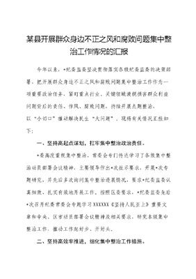 某县开展群众身边不正之风和腐败问题集中整治工作情况的汇报今年以来,*纪委监委坚决贯彻落实各级纪委监委的决策部署,把开展群众身边不正之风和腐败问题集中整治工作作为一项重要政治任务,紧盯重点行业、关键领域漠视损害群众利益问题背后的责任、作风、腐败问题,持续开展点题整治,以小切口推动解决民生大问题。现将有关情况汇报如下:一、坚持高起点谋划,扛牢集中整治政治责任。*委高度重视集中整治,常委会专门传达学习了各级集中整治动员部署会议精神,主要领导作出*次批示要求,开展*次专题研究,并先后多次询问集中整治进展情况,要求*纪委监委认真细致、扎实有效地开展工作。按照区委要求,*纪委监委先后*次召开纪委常委会专题学习XXXXXX《坚持人民至上》重要文章和中央、区市动员部署会议精神及相关要求,研究本级集中整治工作,推动工作起好步、开好头。二、坚持高效率推进,细化集中整治工作措施。纪委监委召开推进会议*次,及时调度进展,谋划解决问题。制定印发《*关于开展群众身边不正之风和腐败问题专项整治任务分工方案》,成立由委主要领导为组长,分管副书记和协管常委为副组长,各相关科室负责人为成员的领导小组,专人负责日常工作,明确各部门主要职责。同时,明确4个方面13项具体整治内容,聚焦群众关心关注的乡村振兴、教育、民政3个领域作为重点整治任务,扎实推进集中整治各项工作。三、坚持高频率监督,拓宽集中整治线索来源。对外公布举报方式及监督电话,设立举报信箱,对接12345市民热线投诉、运用好大数据监督平台、基层小微权力监督一点通等,畅通群众信访举报渠道,及时妥善处理群众诉求。强化室组地联动,发挥室组地联合优势,加强与巡察、政法、审计、信访等部门的协作配合,统筹人员力量,共同提升整治效能。同时,督促有关职能部门对民生领域资金、工程、项目、审批、执法等全面排查梳理,建立问题清单,认真分析研判,及时移送线索,实行清单化管理、项目化推进、闭环式解决销号。文可居文库——海量学习资料,手机电脑均可下载www.wenkeju.com四、坚持高质量核查,发挥集中整治震慑效应。全面开展案件线索大起底,建立专门线索台账,共起底*年*月以来问题线索*件,目前已办结*件,正在办理的*件,其中未处置*件、初核*件,谈话函询*件、立案*件。针对案件办理情况,*纪委监委班子采取领导包案制,定期召开审调会议,督促案件查办室快查快办,推动尽快突破一批重点案件。严格落实一案三查,做到凡是信访举报件必核、凡是问题线索必查、凡是交办问题线索必督、凡是重点督办案件必结,确保每一个问题线索查深查透、查实查细。五、坚持高态势强化,提升集中整治工作质效。利用开会通报、网站转发等形式,在节前集中学习中央、自治区印发的典型案例,发挥典型案例警示教育作用。严格执行三会两书两报告制度,用身边案教育身边人,举一反三、以案明纪。深化以案促改促建促治,通过制发纪检监察建议书等方式,督促职能部门健全完善长效机制、堵塞监管漏洞,实现查处一案、警示一片、治理一域的综合效果。文可居文库——海量学习资料,手机电脑均可下载www.wenkeju.com下一步,*纪委监委将进一步提高政治站位、强化政治自觉,从践行两个维护的政治高度推进集中整治,以实际行动维护群众利益,确保集中整治取得实实在在的效果。一是强化问题导向,推进系统治理。坚持小切口、大深入分级分类整治,聚焦乡村振兴、教育、民政重点领域,全面彻底坚决纠治群众身边的不正之风和腐败问题,着力解决群众急难愁盼问题、完善制度机制、提升治理效能,推动集中整治走深走实。二是细化工作措施,推动整治成效。按照集中整治任务和要求,将工作清单化、任务具体化,确保各项整治任务细化到点、责任到人。同时,将集中整治同开展党纪学习教育结合起来一体推进、常态化推动,确保各项工作措施落实落细。三是突出风腐同查,发挥震慑效应。坚持风腐同查、深挖细查、一查到底、查清查透,高质量办好每一起案件。同时更加注重抓典型、抓现行、强震慑,持续释放越往后越严的鲜明信号,让群众感受到全面从严治党就在身边、公平正义就在身边。文可居文库——海量学习资料,手机电脑均可下载www.wenkeju.com