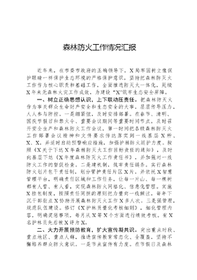 森林防火工作情况汇报近年来,在市委市政府的正确领导下,X局牢固树立像保护眼睛一样保护生态环境的严格保护意识,坚持把森林防灭火工作作为核心职责和基础工作,全面推进防灭火一体化,延续X年来无森林火灾工作成效,为建设X筑牢生态安全屏障。一、树立正确思想认识,上下联动压责任。把森林防灭火作为事关群众生命财产安全和生态安全的大事,层层传导压力,人人参与防控。一是绷紧弦,及时安排部署。在春节、清明、国庆节假日和禁火令、重要会议期间等重要时间节点,及时召开安全生产和森林防火工作会议,第一时间把各级森林防灭火工作部署会议精神和文件要求传达落实到一线基层X所、X、X,并适时启动预警响应措施,加强护林防火巡护力度。按照《X关于下达X年森林防灭火工作目标责任的通知》,及时向基层下达《X年度森林防灭火工作责任书》,并加强对一线防火工作的督促检查。二是建机制,筑牢责任链条。实行森林防火划片包干责任制,划分管护责任片区X片,并依托X智慧管理平台,明确责任区域和工作任务,让每一片山、每一棵树都有人管、有人看,实现森林防火网格化、信息化管理。实施X挂包制度,按照责任同担的原则把力量向一线倾注,每年下沉干部驻点X协助开展森林防灭火工作X多人次。三是强管理,规范队伍建设。修订《X护林员量化考核细则》,细化管理内容,明确奖惩事项,每月从X等X个方面进行绩效考核。有X名护林员先后被X评为X。二、大力开展预防教育,扩大宣传凝共识。突出重点时段、重点地区、重点人群,推进宣传教育常态化、全覆盖,坚持不懈培养群众防火意识。一是节点宣传有力度。在节假日及森林防火紧要时期,以宣传森林防火法律法规、防火警示案例、扑火安全常识为主要内容,深入社区村、自然村、田间地头开展防火安全预防教育,做到警钟长鸣、家喻户晓。禁火令期间,在主要路口、重点地段显目位置悬挂禁火令红旗X多面,定点悬挂森林火险预警信号警示牌X多处;安排供水车在重点区域和线路来回巡逻,时刻保持备战状态。二是常态宣传有广度。在森林防火期,坚持开展春秋季森林防火宣传月活动,利用基层LED电子显示屏滚动播放森林防火宣传标语、播放森林防火短视频,时刻提醒到访社会公众注意森林防火;利用乡镇赶集日,会同所在地乡镇人民政府、有关部门联合开展森林防火宣传活动,积极营造浓厚的森林防火氛围。三是法治宣传有亮度。在X建设生物多样性法治教育基地,把优秀传统生态保护文化、法律法规解读和生态破坏警示案例作为展馆内容,并成立法治宣讲小分队,针对社会群众、大中小学生等群体开展普法宣传教育;与市检察院、市法院、市公安局开展联合巡林护林,让法律走进群众身边,提高群众对法律的认识和参与保护的自觉。三、加强野外火源管控,防范未然筑防线。坚持把管理往前端移动,以野外火源管控的一丝不苟来确保森林安全的万无一失。一是突出预防重点。对各生态休憩区、山脚田边、针叶林集中分布区、笋厂、果园、垃圾处理点等区域进行重点隐患排查,提前预防用火隐患。加强重点人群管理,对智障和精神病人等特殊人群共计X人进行登记造册,实行动态跟踪管理,落实监护人责任。二是及时排除隐患。每年以森林防火为重点组织开展安全生产检查工作,同时结合当地群众的生产、生活和习俗活动,大力开展森林火灾隐患大排查大整治活动,并对排查的隐患建立整改台账,实行销号管理,及时消除火灾隐患。四、提升应急处突水平,学练结合增战力。把应急能力作为现代化管理的重要手段,大力践行以水灭火理念,强化空地一体纵深拓展。一是强化培训锻炼。组织学习《X森林火灾应急预案》《森林火灾扑救指挥有关原则要点》等;收听收看文可居文库——海量学习资料,手机电脑均可下载www.wenkeju.com《国家森林草原防灭火业务大讲堂》;每半年组织开展生态护林员岗位技能和安全教育集中培训1次;每年开展森林消防器材使用演练X次以上,组织护林员维护保养防火器材设备,开展扑火实战演练,不断提升工作人员森林防火业务能力和组织指挥水平,护林员多次在全市森林消防技能竞赛活动获得名次。二是完善设施设备。在基层分别规范建立森林防火器材室,按照标准库配备防火器材设备,配备X台移动式高扬程森林消防水泵等各类应急装备。在X确定消防应急取水点X处。三是加大科技运用。强化移动互联信息技术运用,在X等X个点位卡口启用推广国家林草局防火码二维码,积极引导进山入林人员通过微信扫码进行信息登记和防火宣传,通过宣传教育、火情报警、违规举报等功能,实现管理全链条、火因可追溯。拓展无人机巡护运用,配备无人机X台。同时大力推进建设火情监测智能终端,提升科技赋能成效,构建空地一体预防体系。四是落实值班值守。在高森林火险期严格落实森林防火24小时值班和领导带班制度,做好值班调度、上传下达,落实每日零火情报告和双报告制度,及时报告当天防火情况。文可居文库——海量学习资料,手机电脑均可下